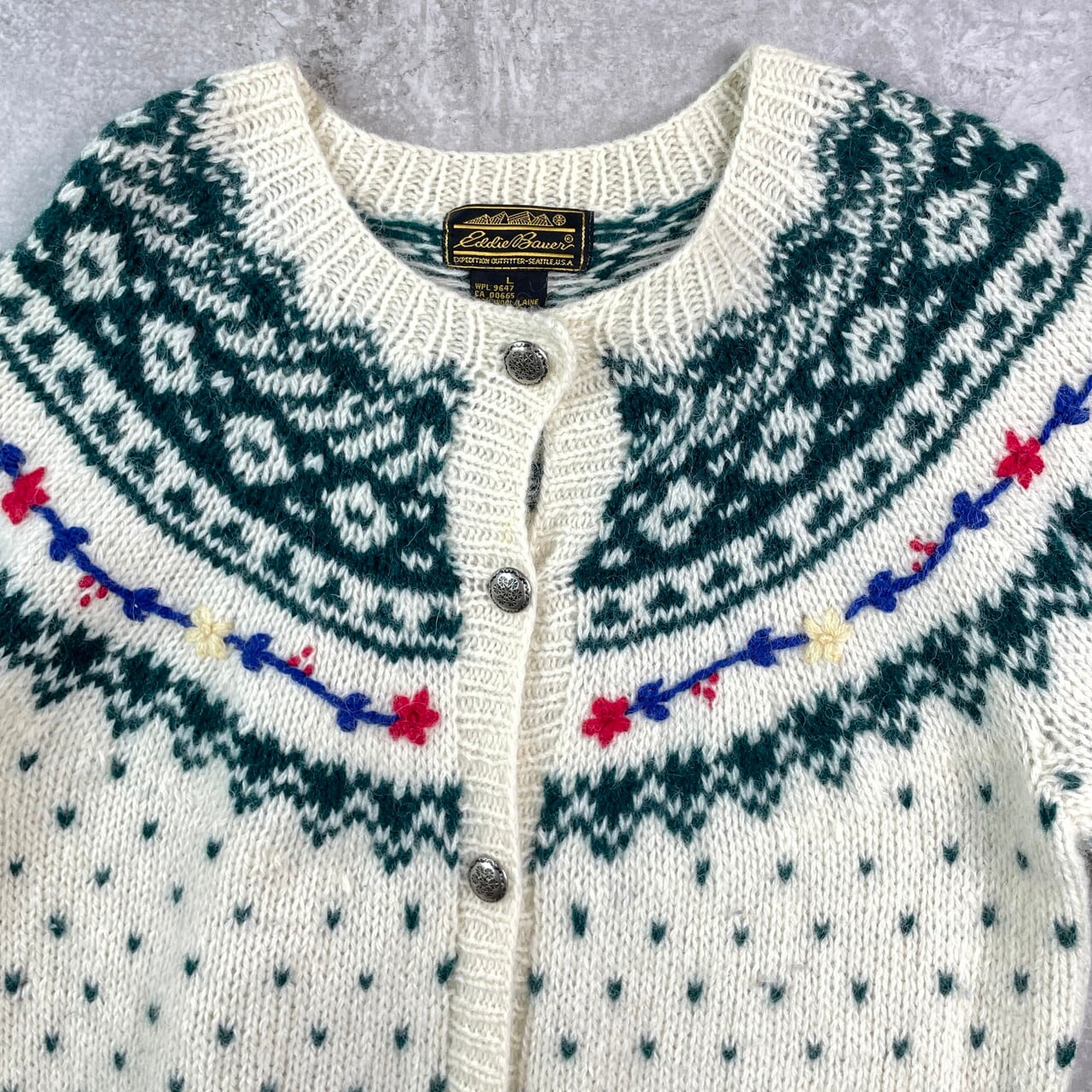 80年代 Eddie Bauer エディーバウアー ノルディック柄 バーズアイ ウールニットカーディガン メンズL相当 レディースXL相当 古着 80s ヴィンテージ VINTAGE コンチョボタン 黒タグ【ニットセーター】/マルチカラー