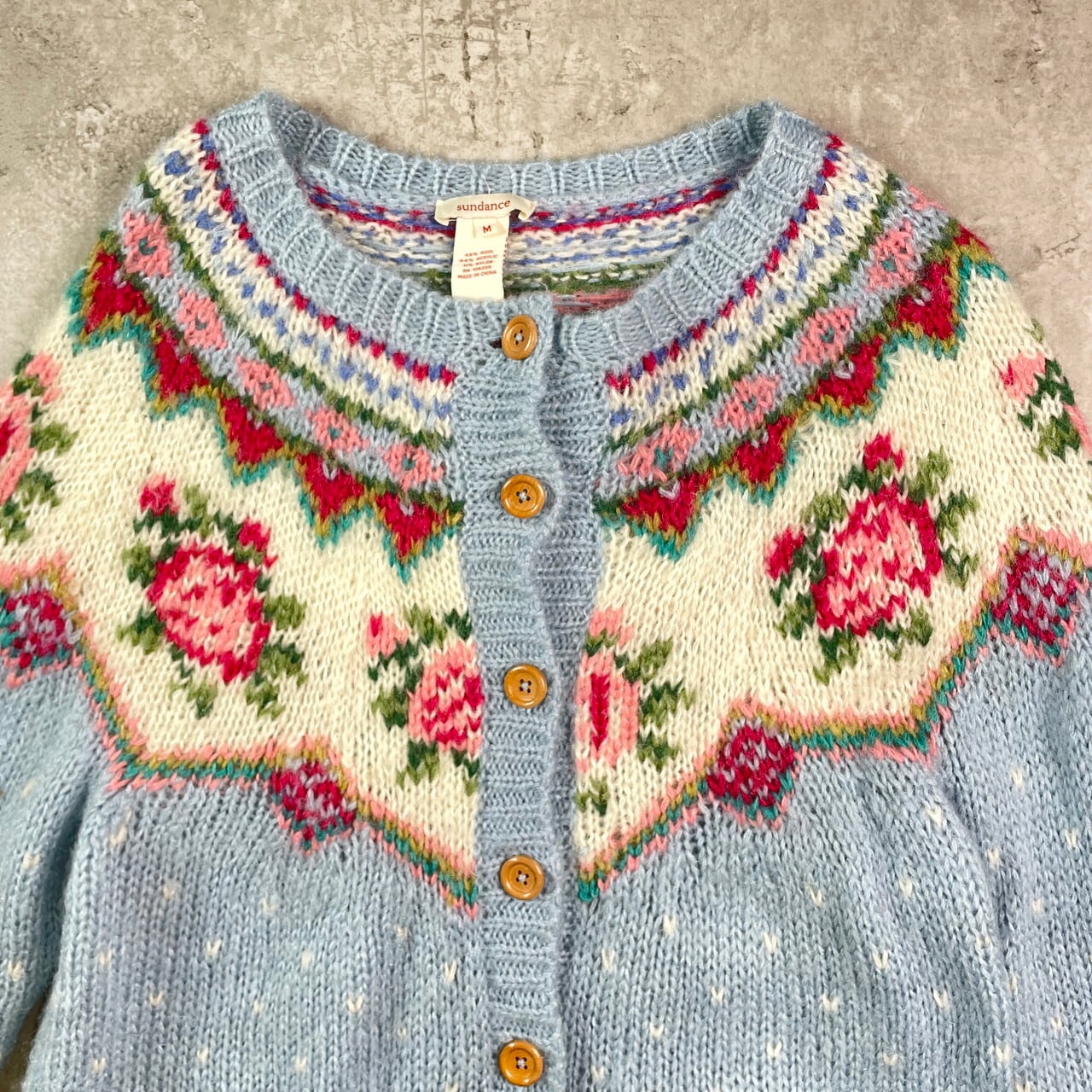 sundance ノルディック柄 バーズアイ ウールニットカーディガン レディースL相当 古着 フラワー 総柄【ニットセーター】/マルチカラー