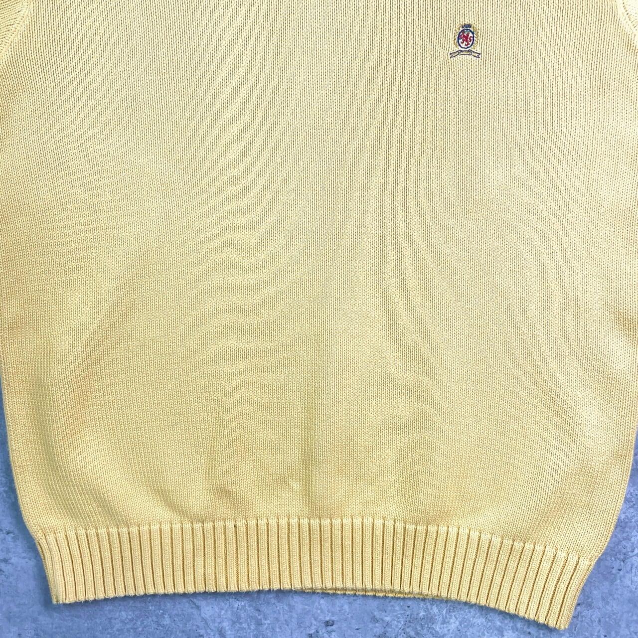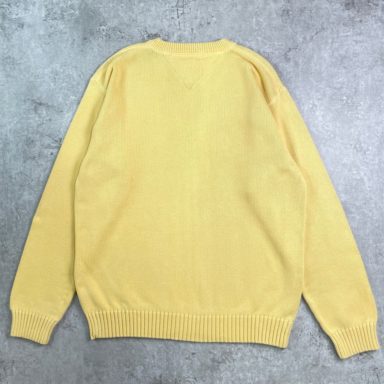 90年代 TOMMY HILFIGER トミーヒルフィガー ワンポイントロゴ刺繍 コットンニットセーター メンズXL 古着 90s VINTAGE ヴィンテージ 前Vガゼット レモンイエロー 黄色【ニットセーター】/イエロー