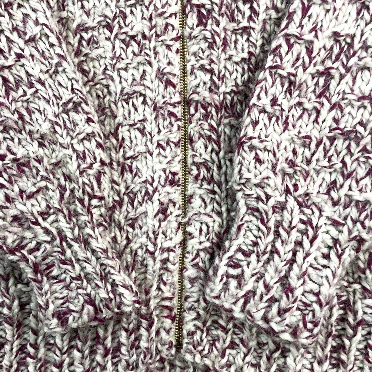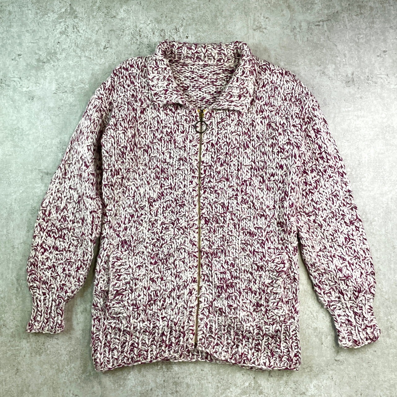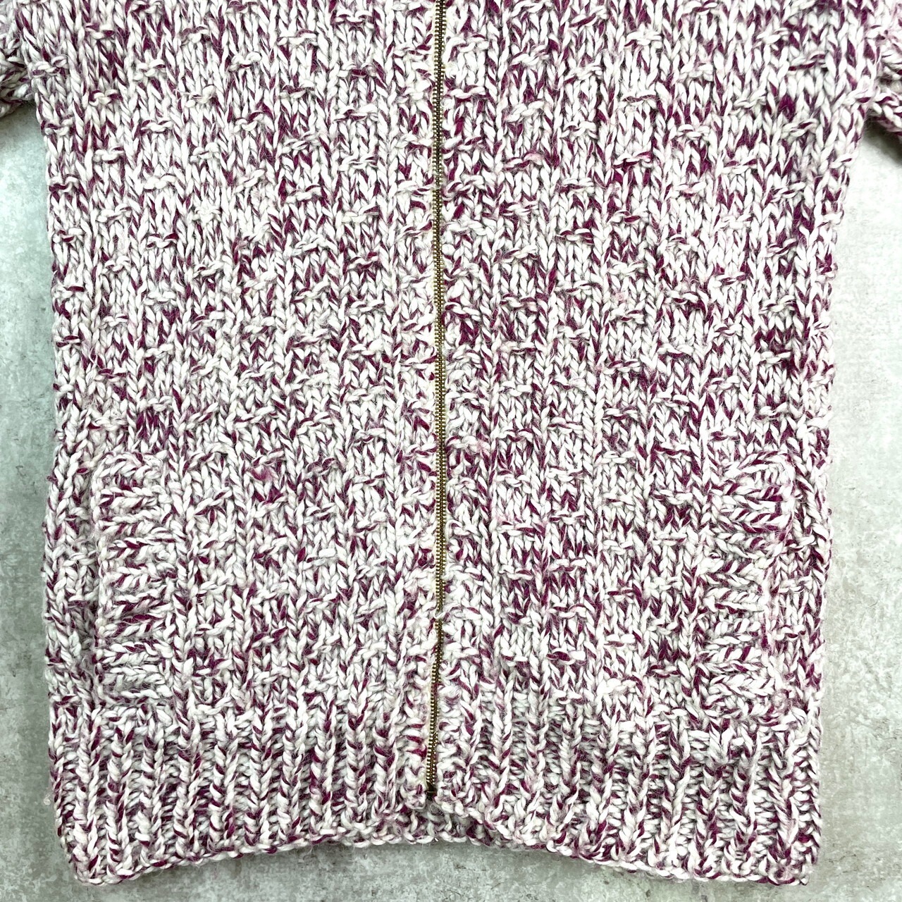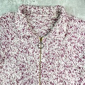 80年代 ハンドニット カウチン 襟付き フルジップ ローゲージ ウールニットカーディガン メンズM相当 レディースL相当 古着 80s VINTAGE ヴィンテージ ドライバーズニット ホワイト パープル 白 紫【ニットセーター】/マルチカラー