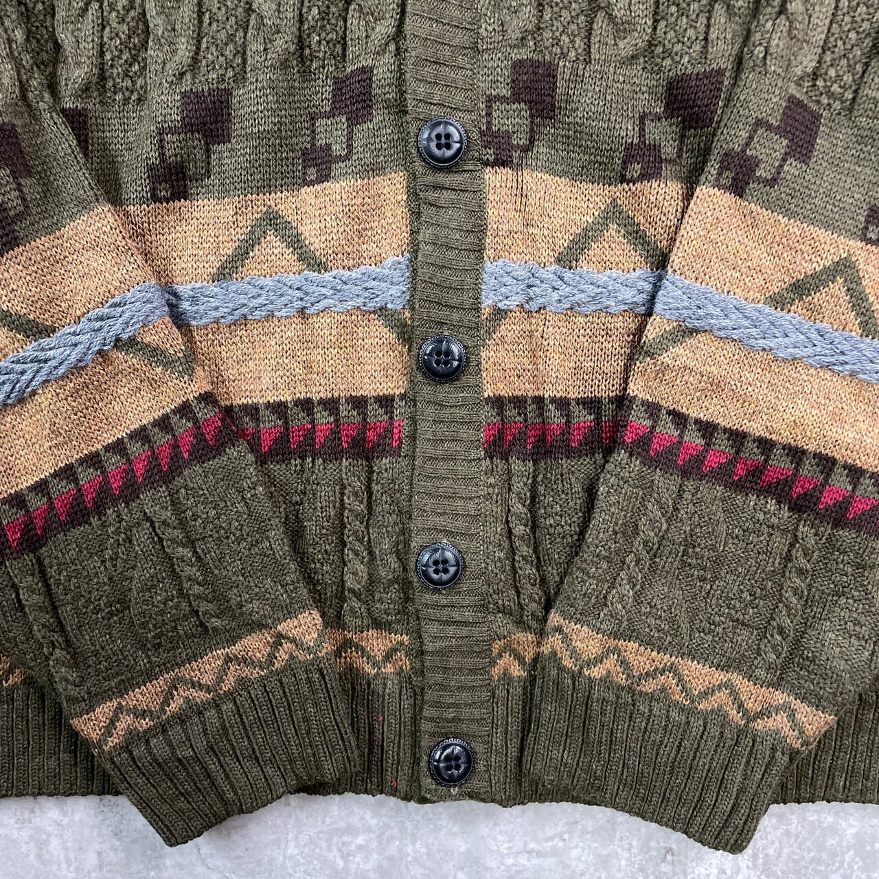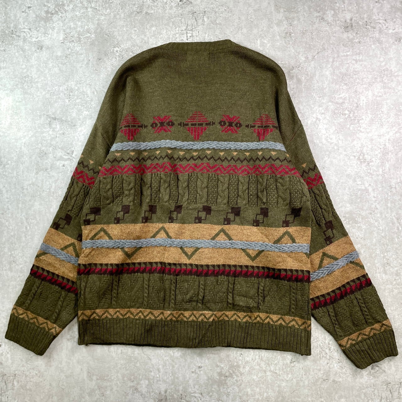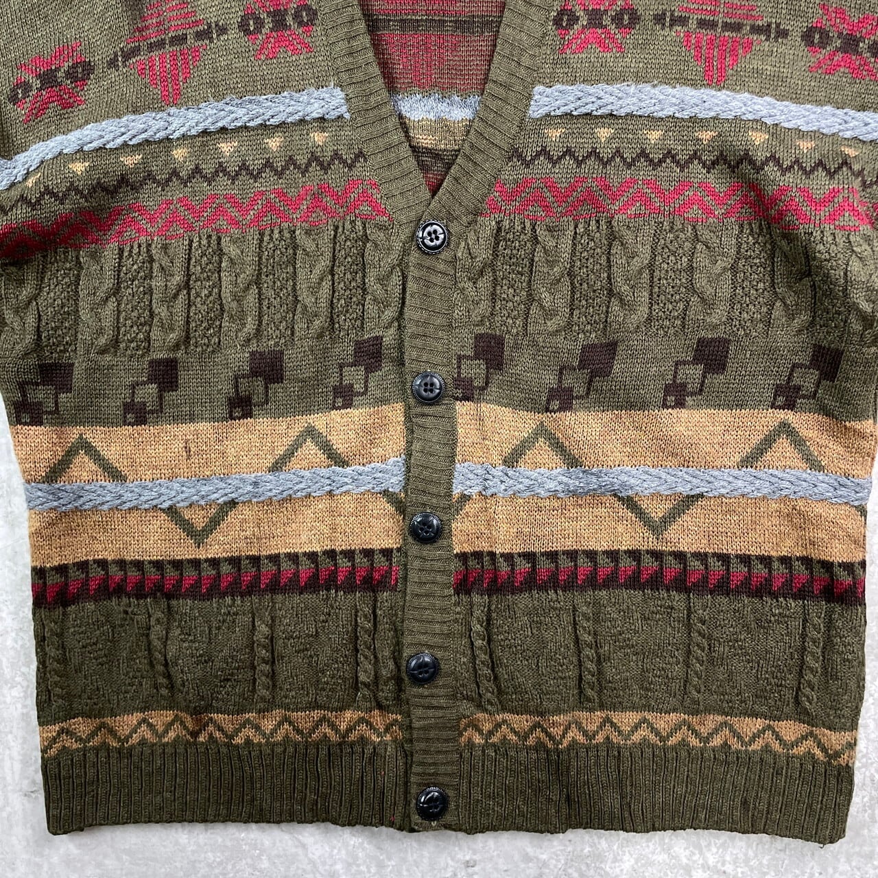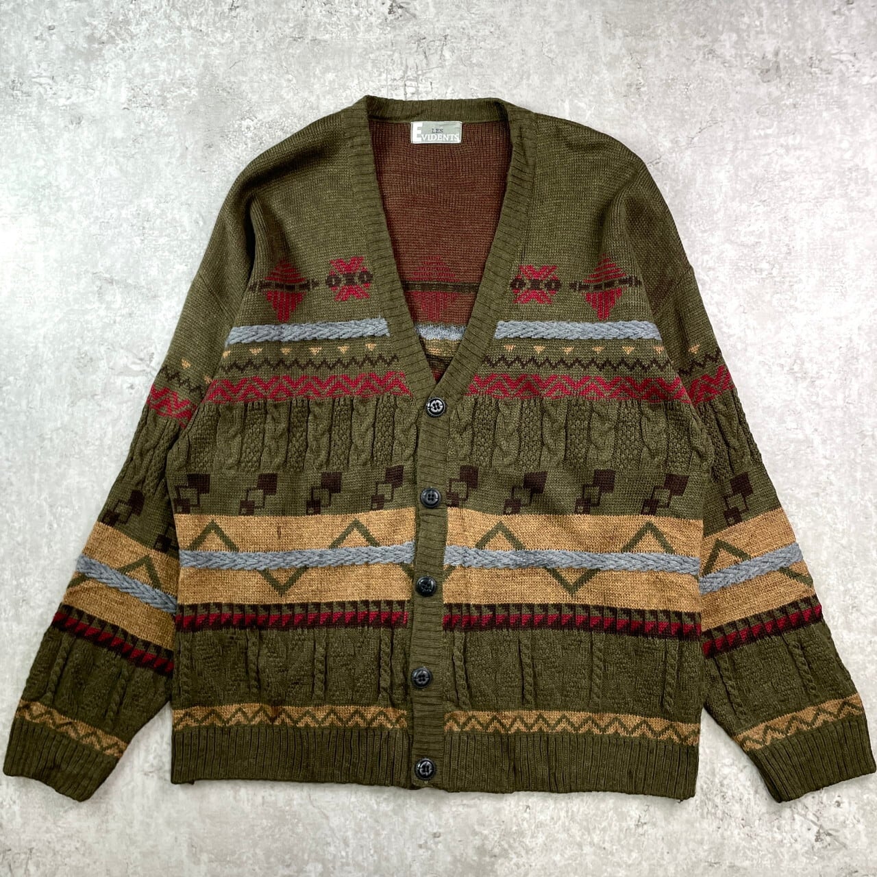 LES EVIDENTS ユーロ ヴィンテージ 総柄 ウールニットカーディガン メンズXL 古着 VINTAGE デザインニット【ニットセーター】/マルチカラー