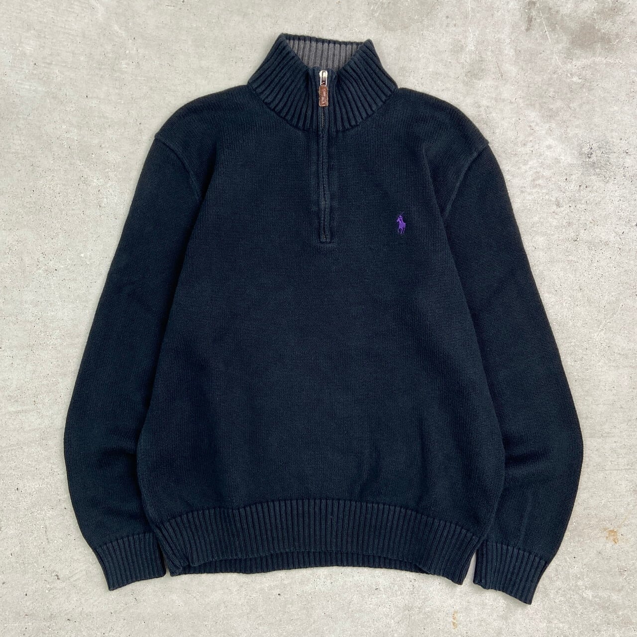 90年代 Polo by Ralph Lauren ポロバイラルフローレン ハーフジップニットセーター コットンニット メンズM 古着 コットンニット 90s アメカジ オールドラルフローレン ワンポイントロゴ刺繍 ハイネック 黒【ニットセーター】/ブラック
