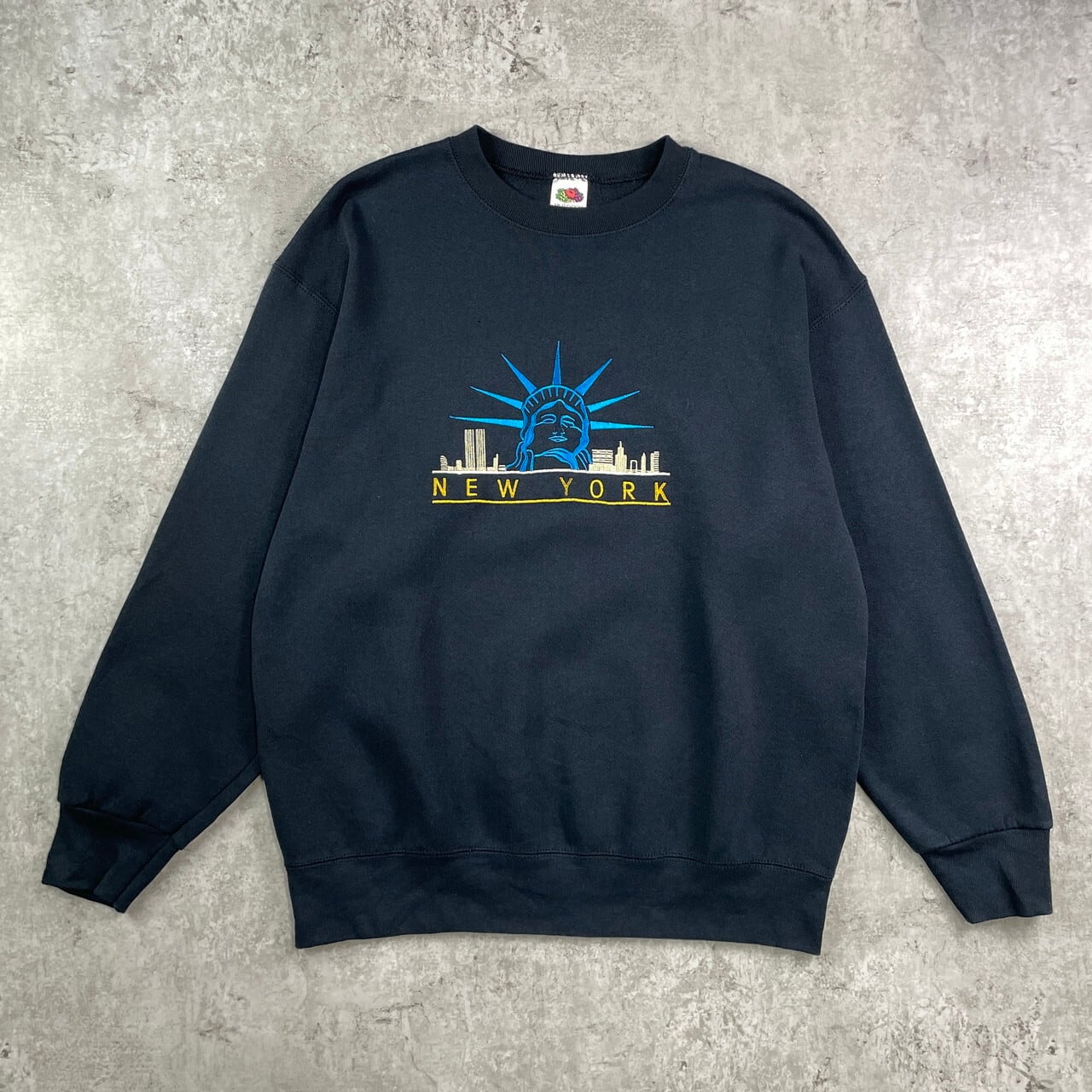 90年代 NEW YORK ニューヨーク 自由の女神 アート刺繍 スウェットシャツ メンズL 古着 90s ヴィンテージ VINTAGE トレーナー アメカジ スーベニア 黒【スウェット】/ブラック