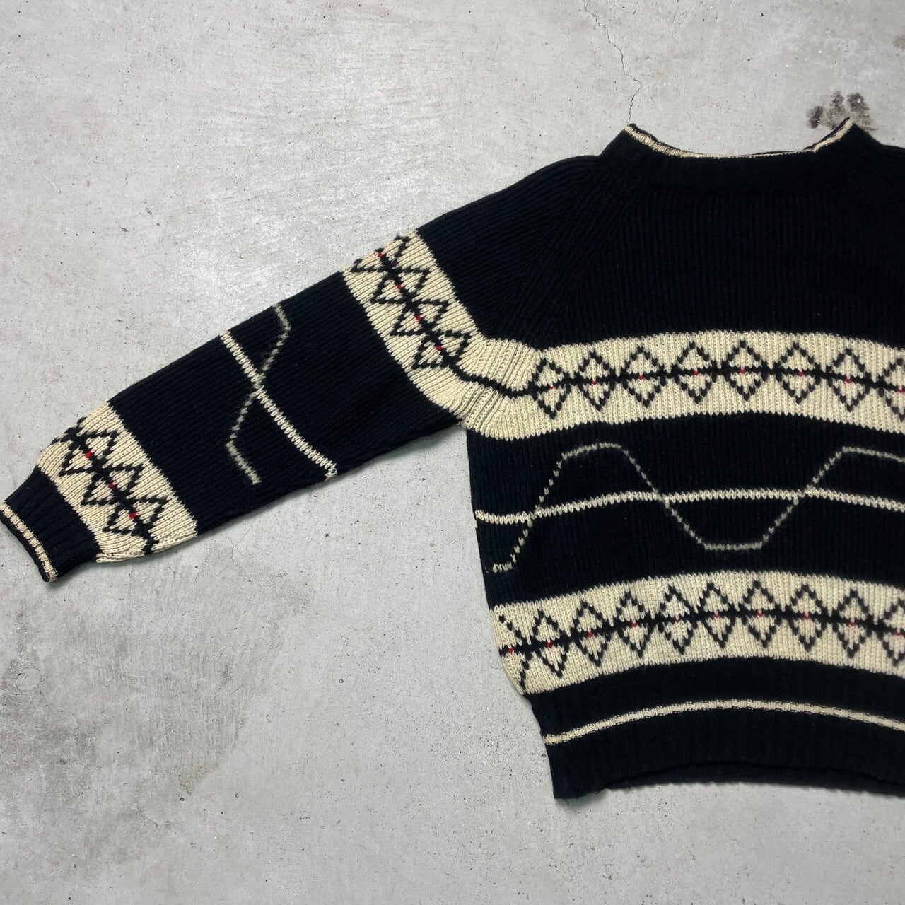UNKNOWN 総柄ニットセーター ボートネック メンズL相当 古着 ブラック アイボリー オフホワイト 黒 生成り 【ニットセーター】/マルチカラー