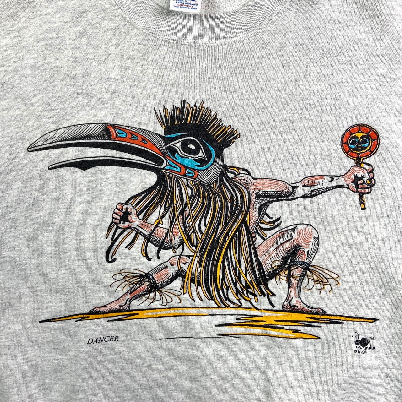 ■80年代 USA製 DANCER アートプリント スウェットシャツ メンズM相当 古着 80s VINTAGE ヴィンテージ トレーナー ダンサー 原住民族 ライトグレー【スウェット】/グレー