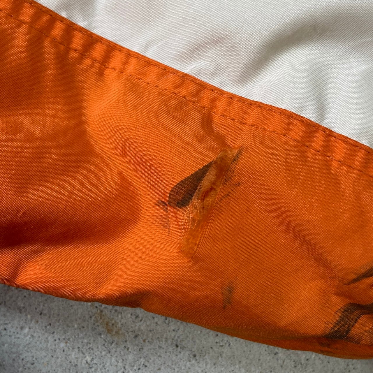 両袖やフードに汚れ、左袖に破れなどがございます。