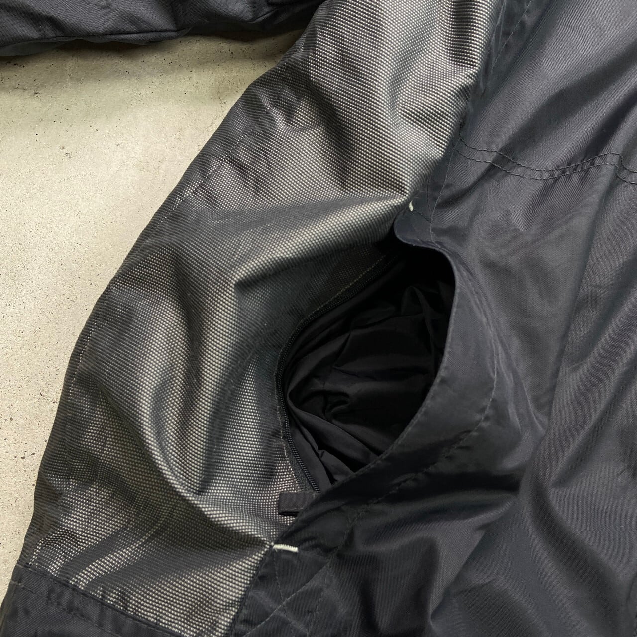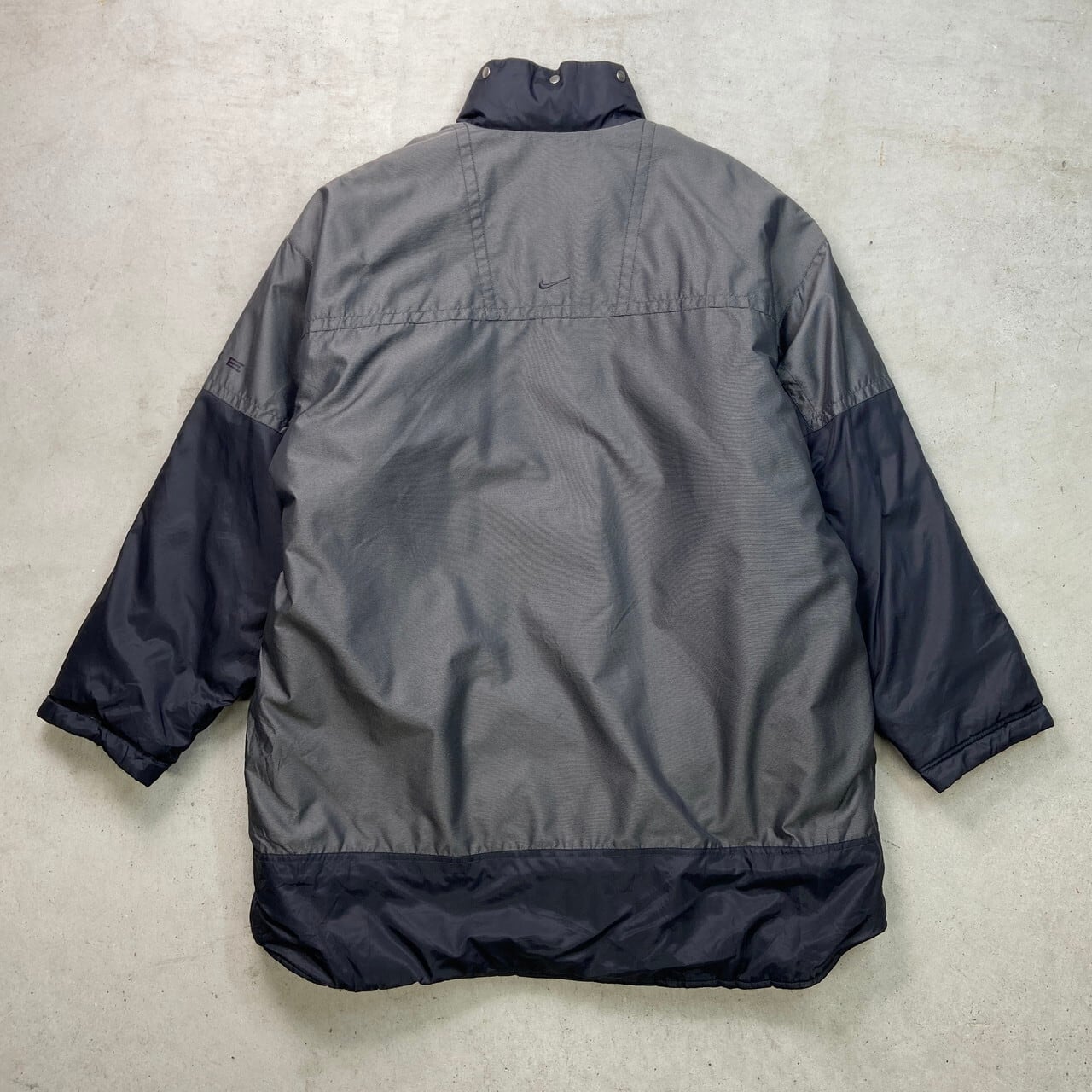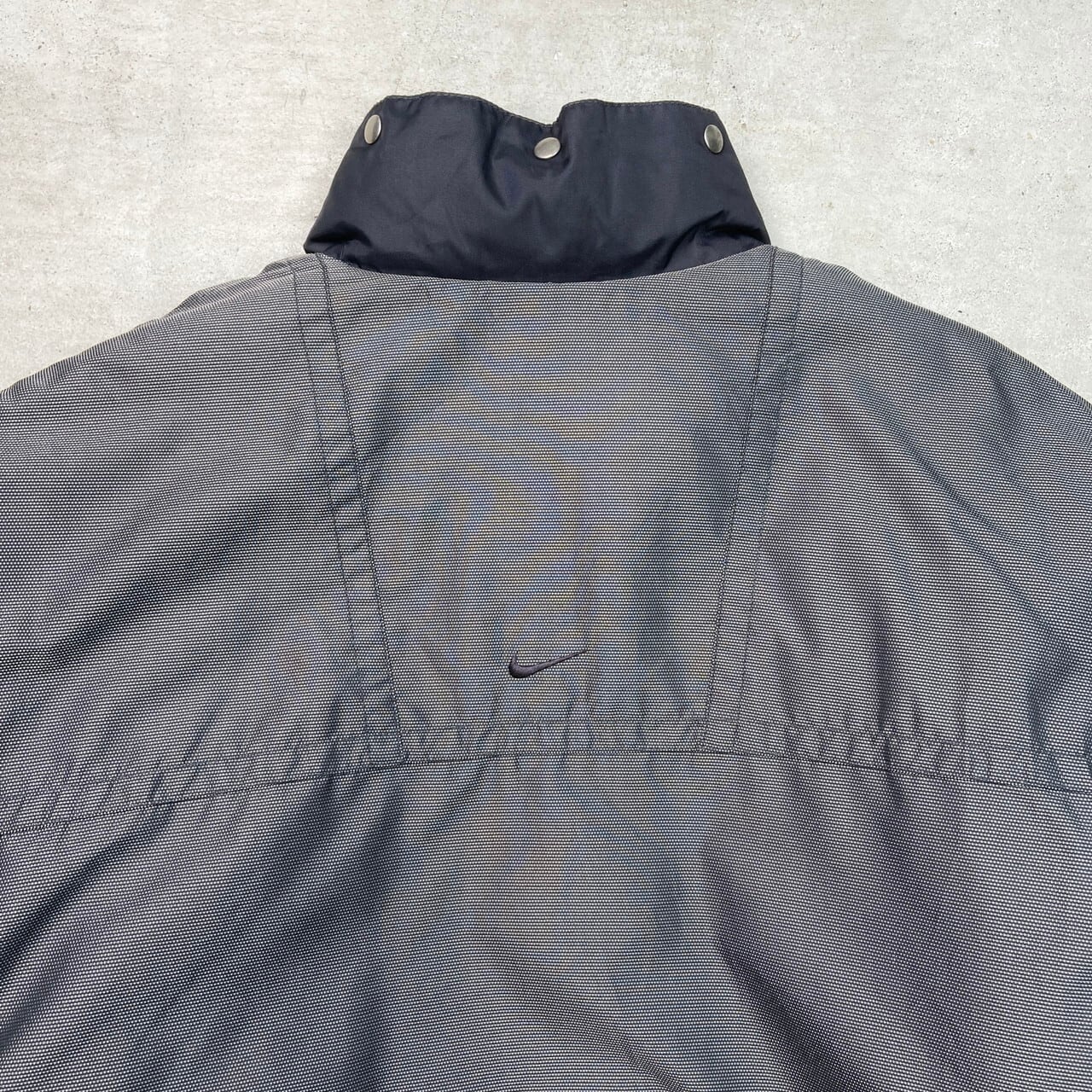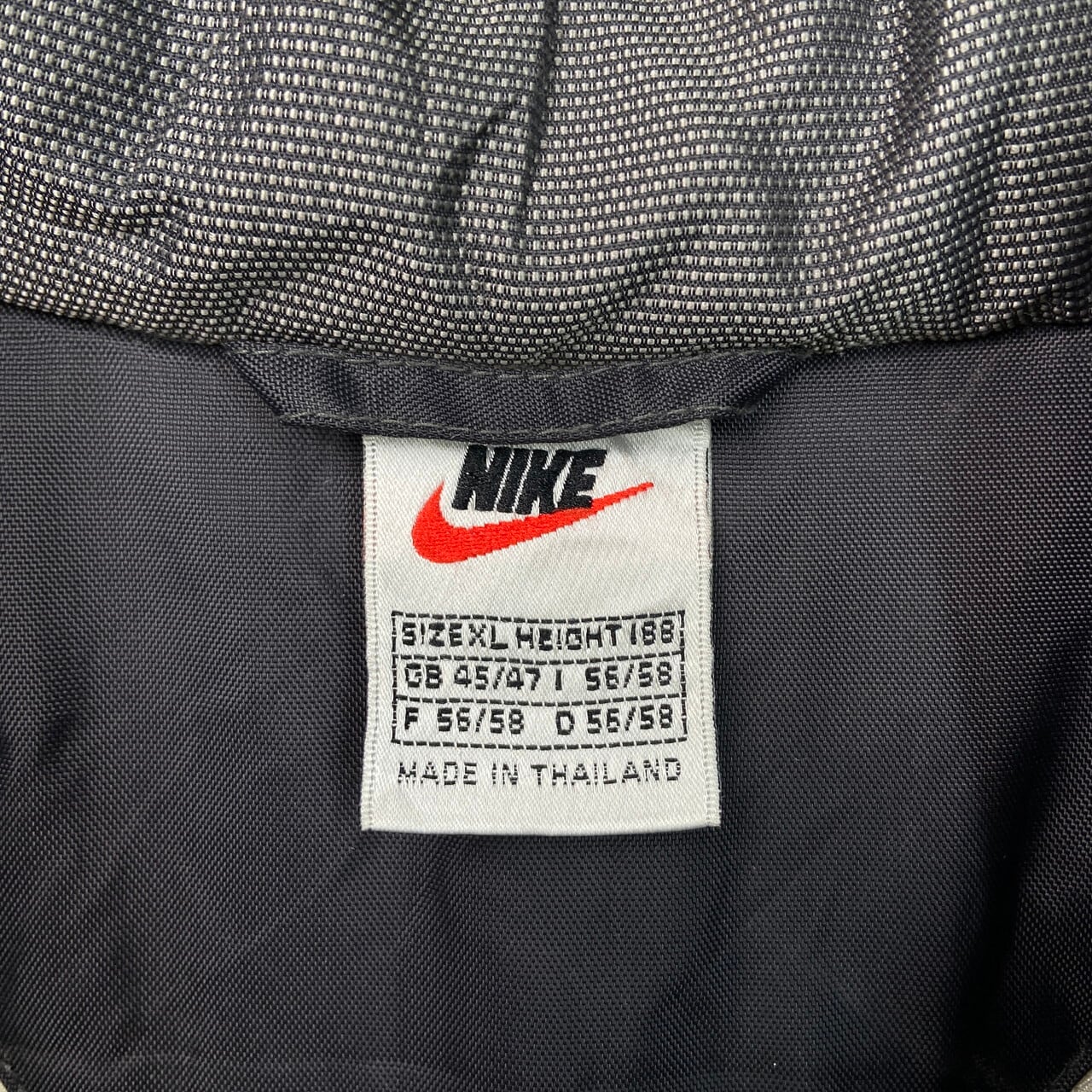 ■古着 NIKE ナイキ スウォッシュロゴ刺繍 ナイロンジャケット メンズXL 90年代 90s VINTAGE ヴィンテージ USED フード収納型 中綿入り キルティングライナー 裾ドローコード ブラック グレー 黒【ナイロンジャケット】/マルチカラー