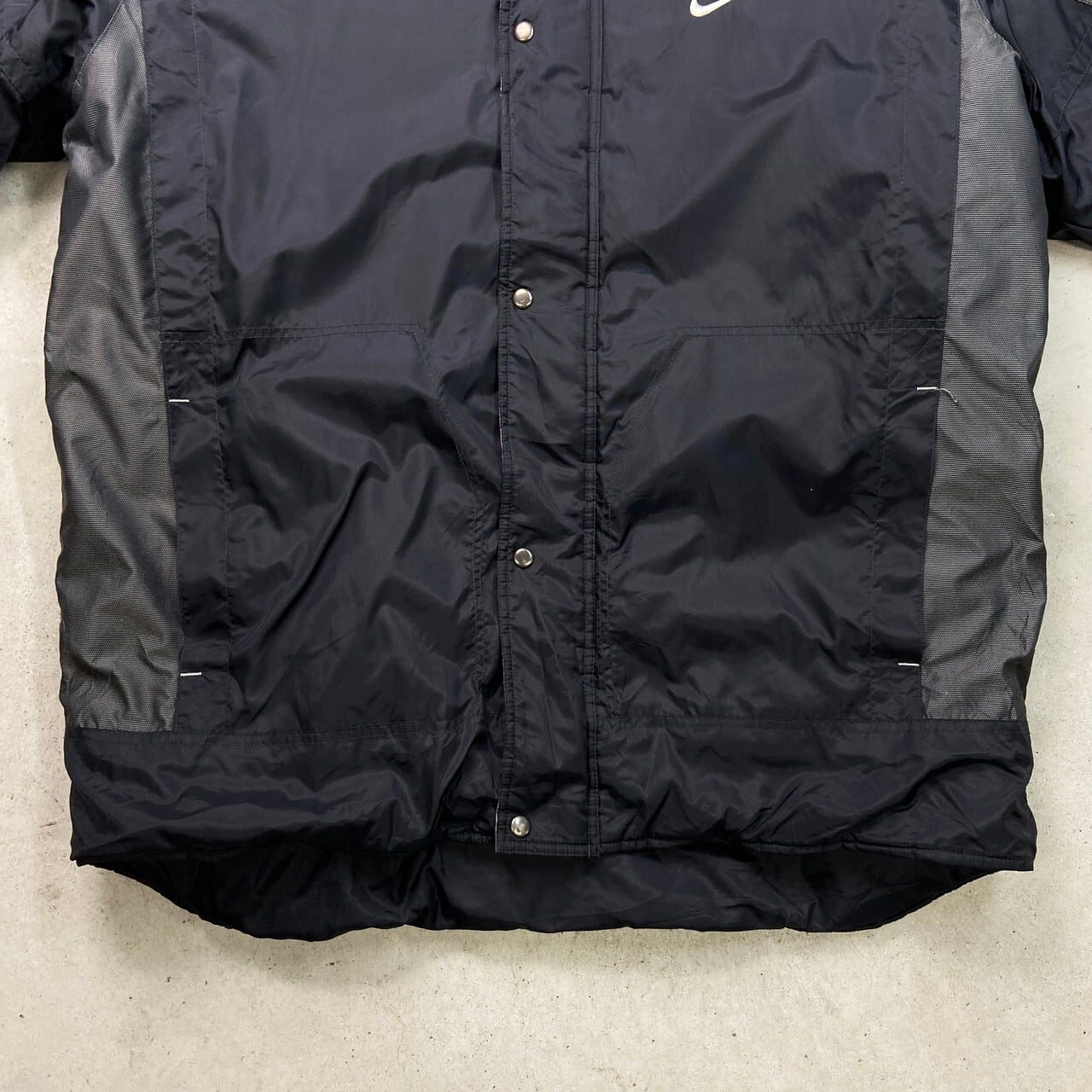 古着 NIKE ナイキ スウォッシュロゴ刺繍 ナイロンジャケット メンズXL 90年代 90s VINTAGE ヴィンテージ USED フード収納型 中綿入り キルティングライナー 裾ドローコード ブラック グレー 黒【ナイロンジャケット】/マルチカラー