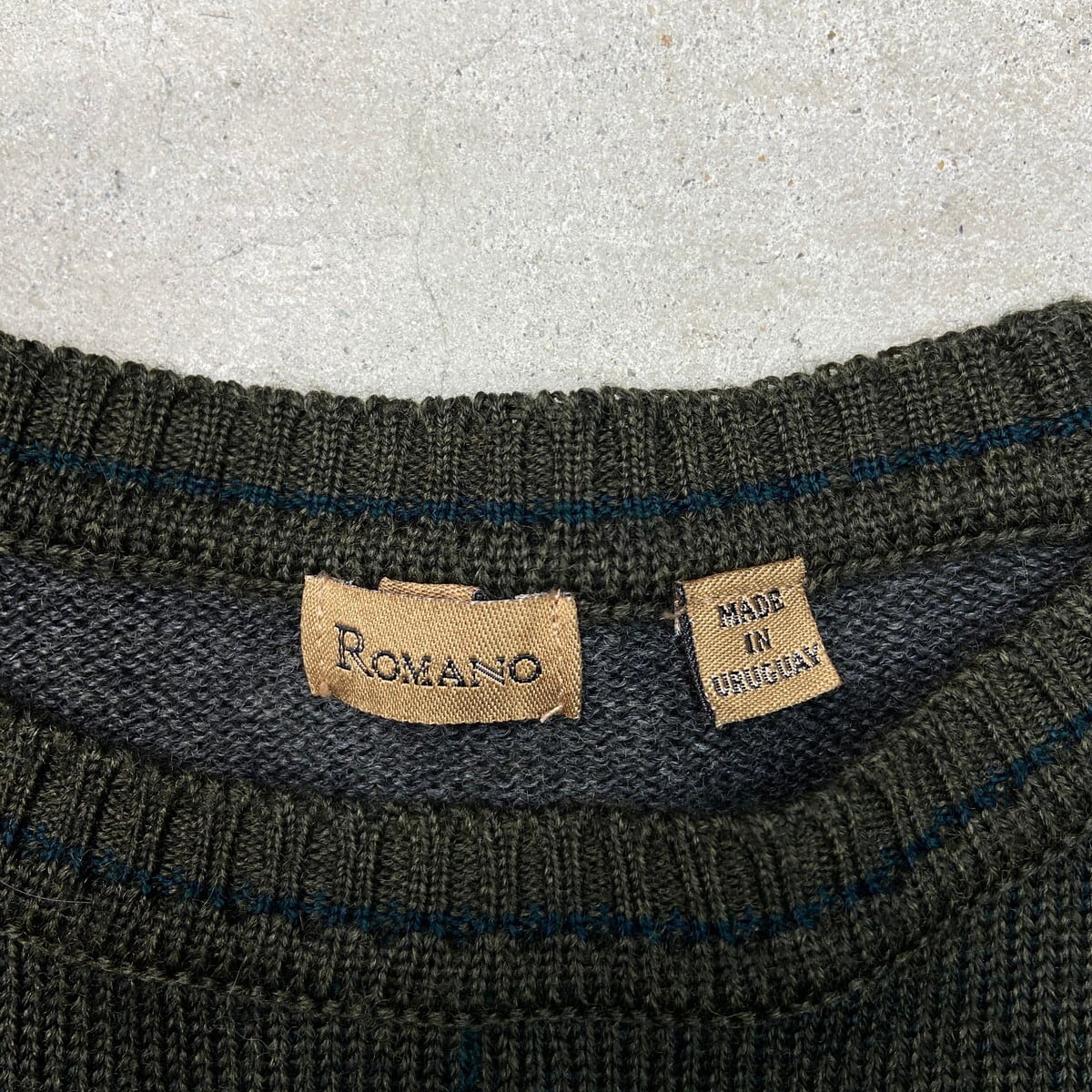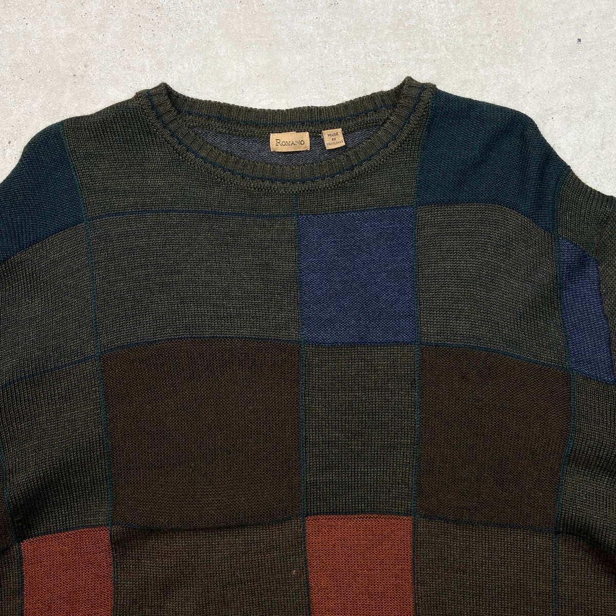古着 ROMANO メリノウール ニットセーター メンズL USED パッチワーク柄 オリーブグリーン【ニットセーター】/マルチカラー