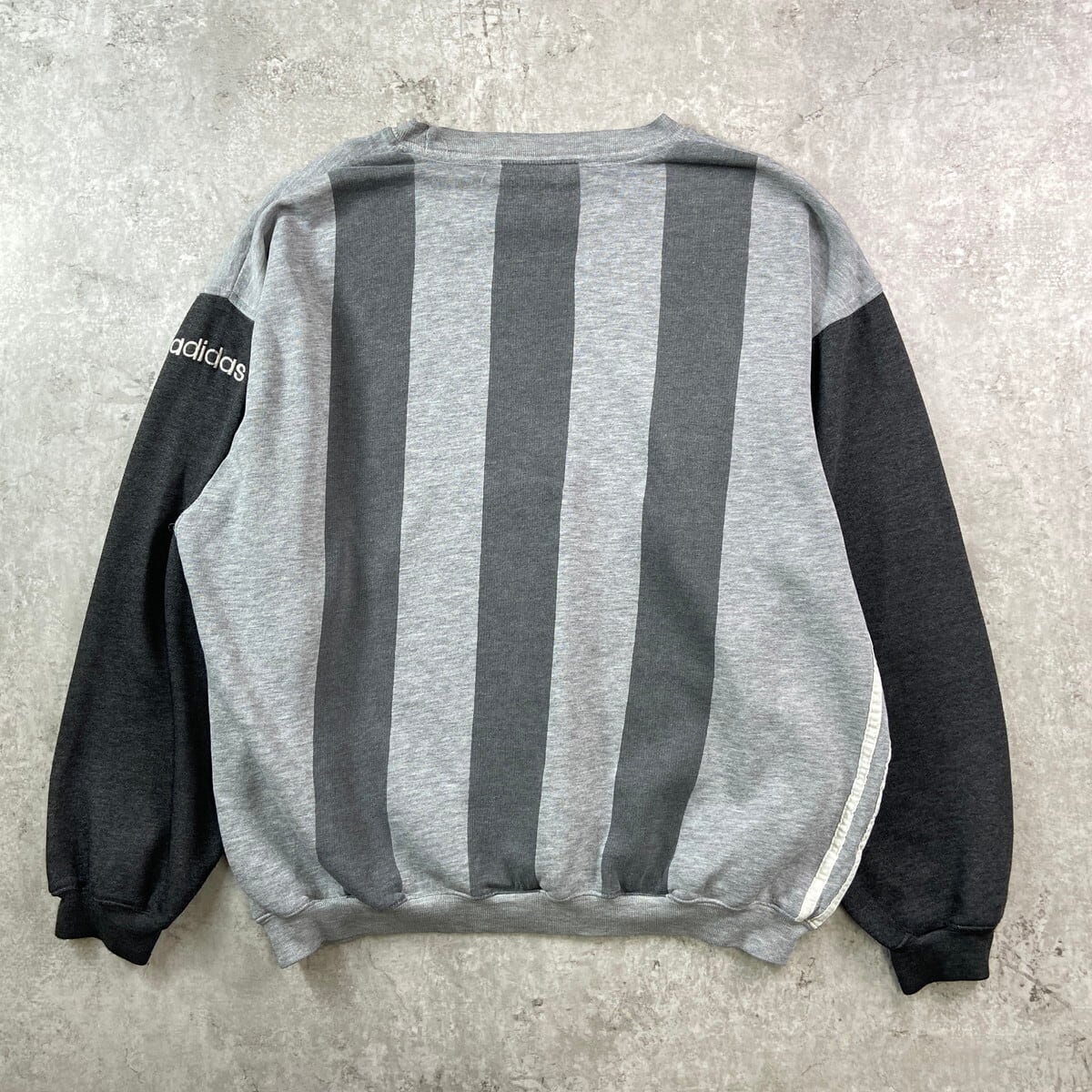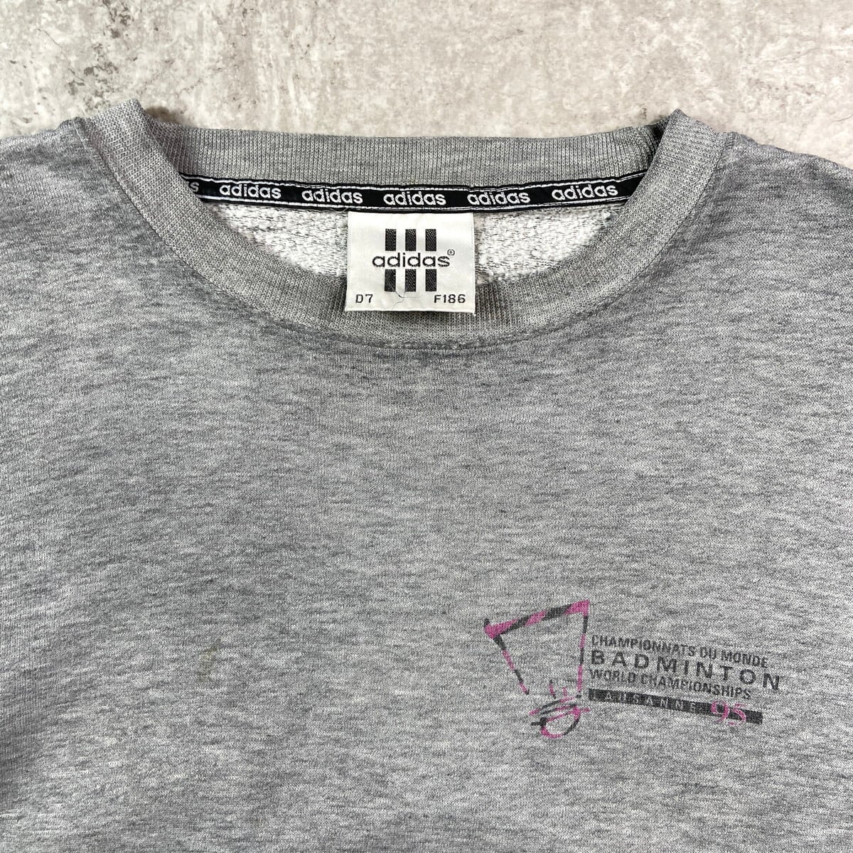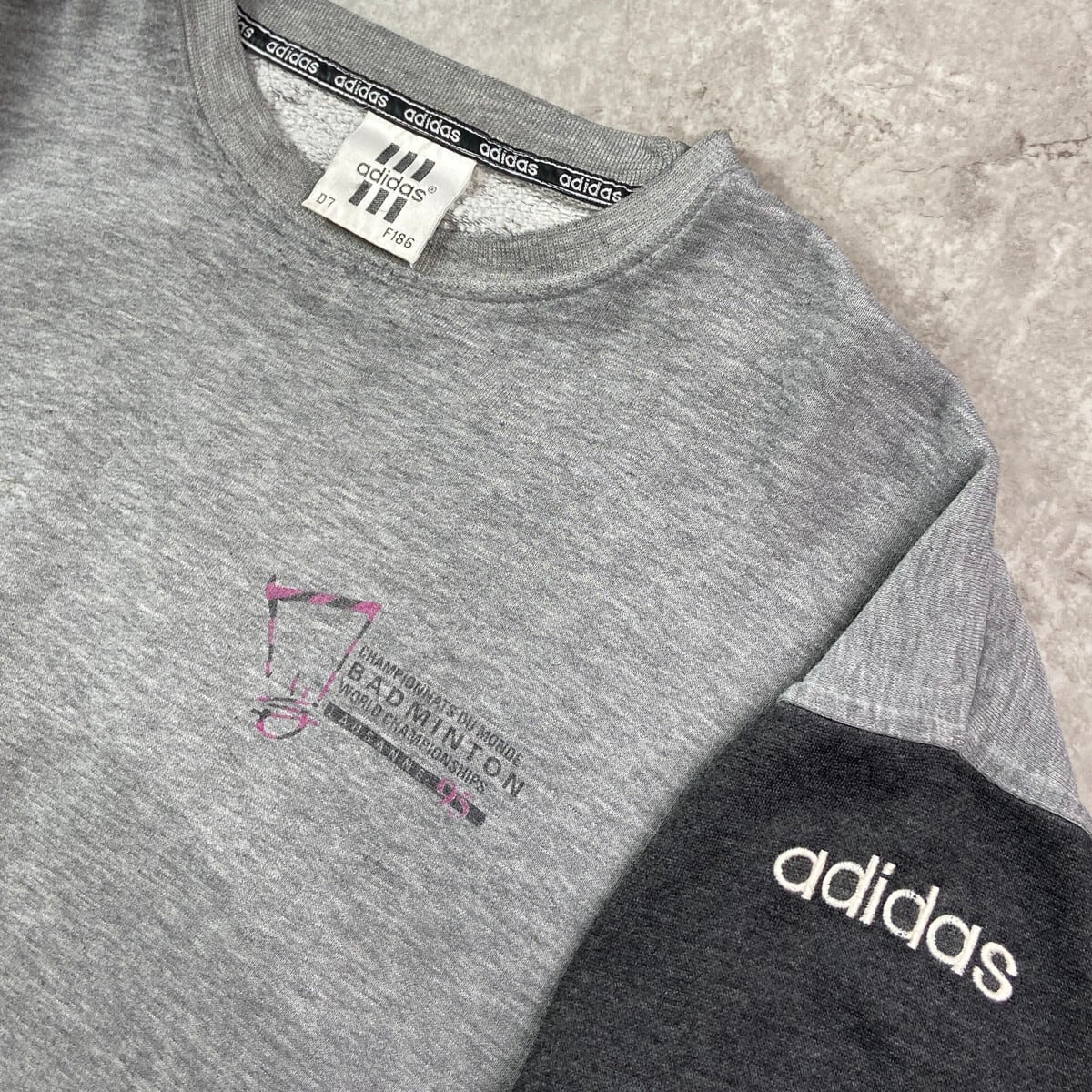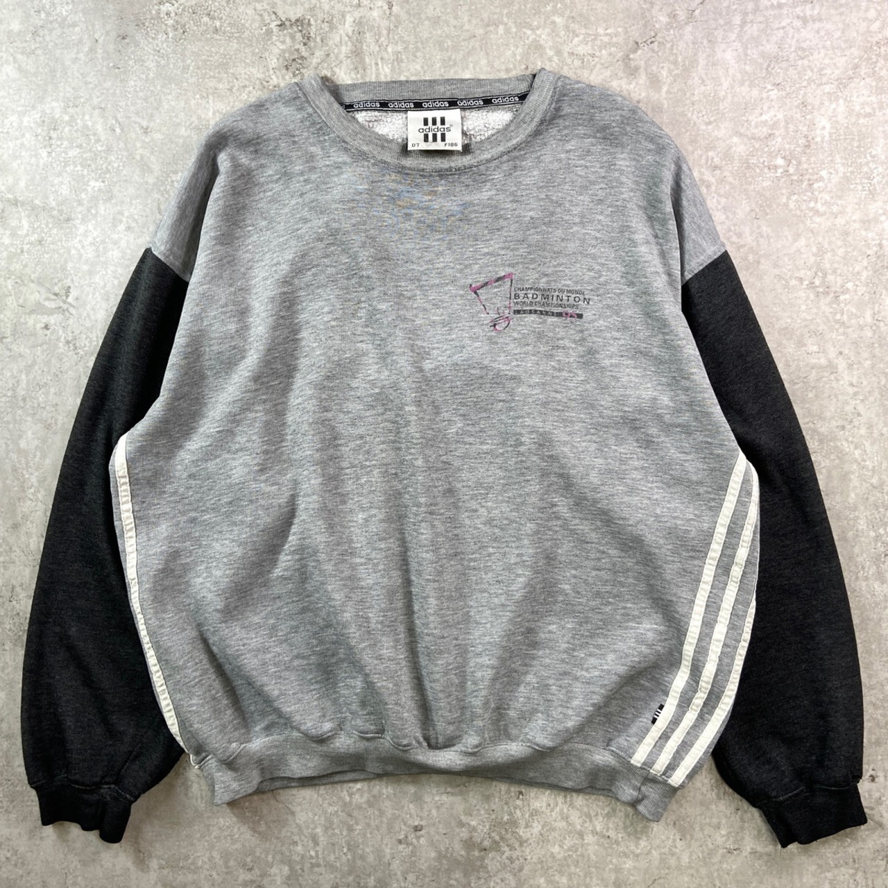 90年代 adidas アディダス BADMINTON WORLD CHAMPIONSHIPS ワンポイントプリント スウェットシャツ メンズXL相当 古着 90s VINTAGE ヴィンテージ 切り替えデザイン 万国旗タグ バドミントン 袖ロゴ刺繍 ブラック 灰色【スウェット】/グレー