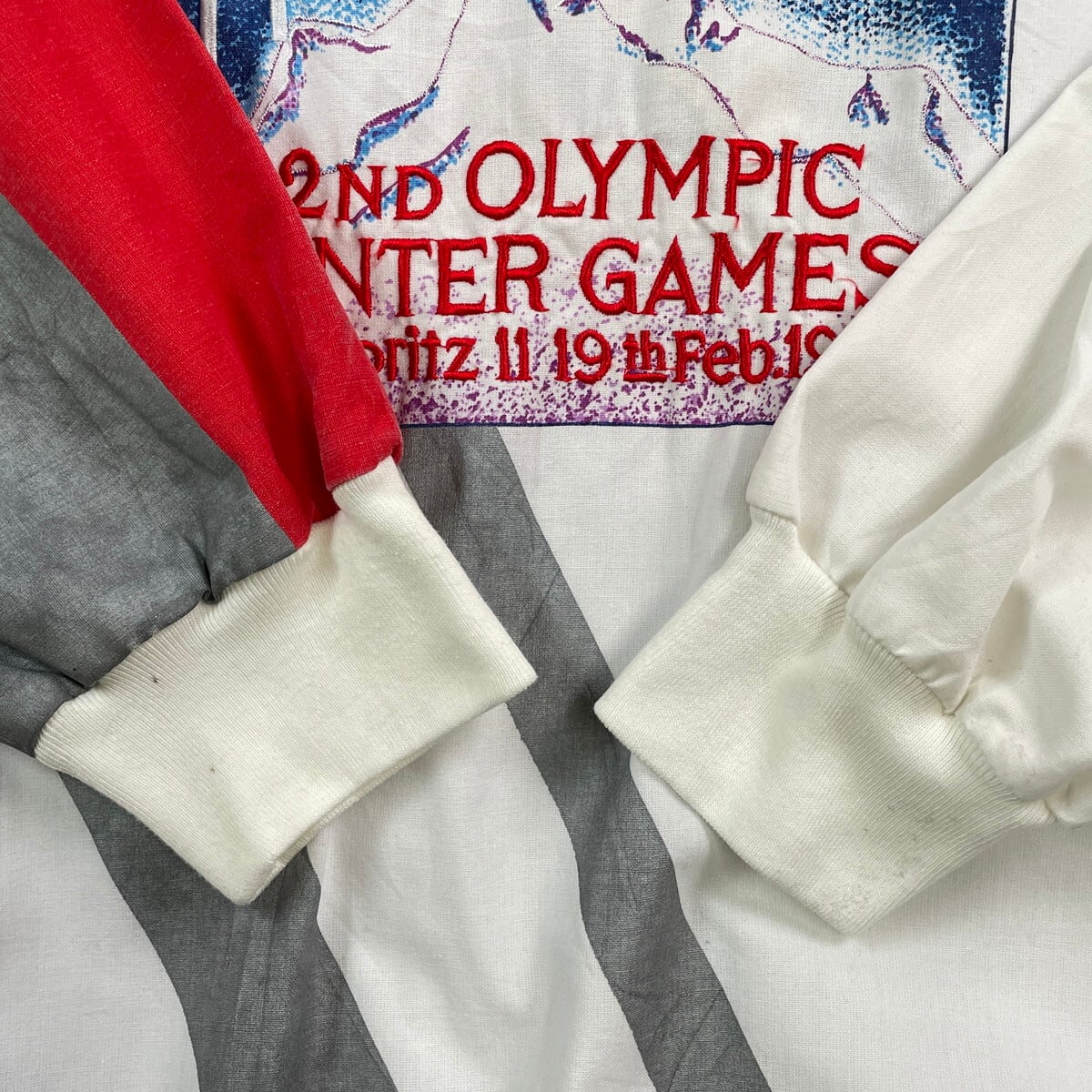■80年代 adidas アディダス 2ND OLYMPIC WINTER GAMES ロングTシャツ メンズ2XL相当 古着 80s VINTAGE ヴィンテージ 銀タグ サンモリッツ 冬季オリンピック 袖ロゴ刺繍 ロンT ビッグサイズ 大きいサイズ ホワイト【スウェット】/マルチカラー