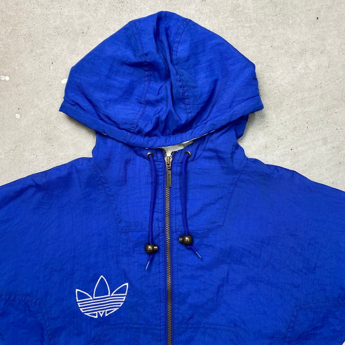 ■80年代 adidas アディダス ワンポイントロゴ刺繍 ナイロンジャケット メンズXL相当 古着 80s VINTAGE ヴィンテージ ドローコード付き バックプリント ブルー ブラック シルバー【ナイロンジャケット】/マルチカラー