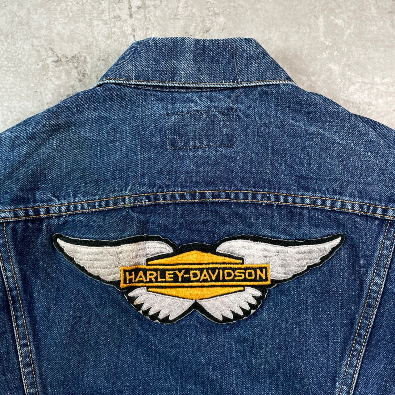 ■70~80年代 USA製 Levi's リーバイス カスタム HARLEY-DAVIDSON ワッペン付き トラッカーデニムジャケット メンズS相当 レディース 古着 70s 80s ヴィンテージ VINTAGE アメカジ ハーレーダビッドソン Gジャン 青色【デニムジャケット】/ブルー