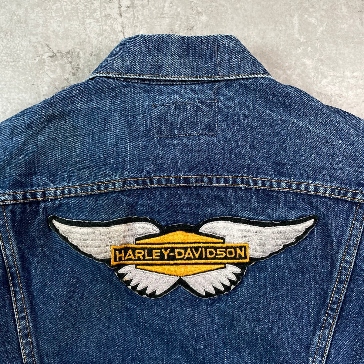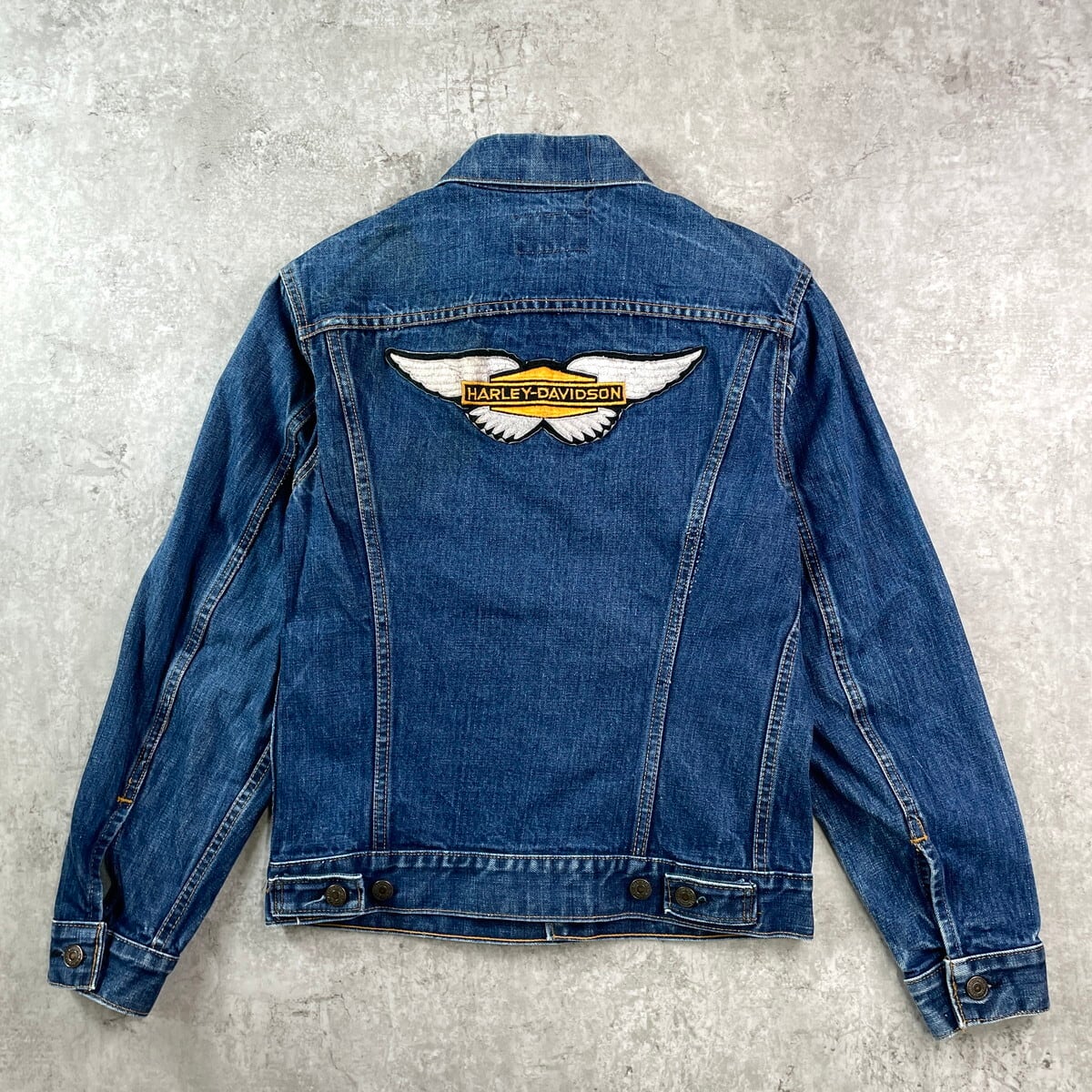 70~80年代 USA製 Levi's リーバイス カスタム HARLEY-DAVIDSON ワッペン付き トラッカーデニムジャケット メンズS相当 レディース 古着 70s 80s ヴィンテージ VINTAGE アメカジ ハーレーダビッドソン Gジャン 青色【デニムジャケット】/ブルー