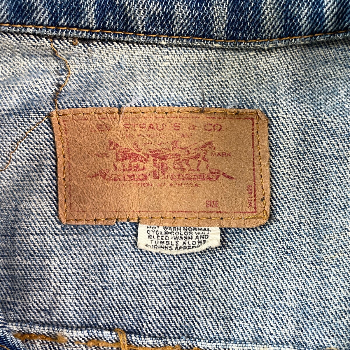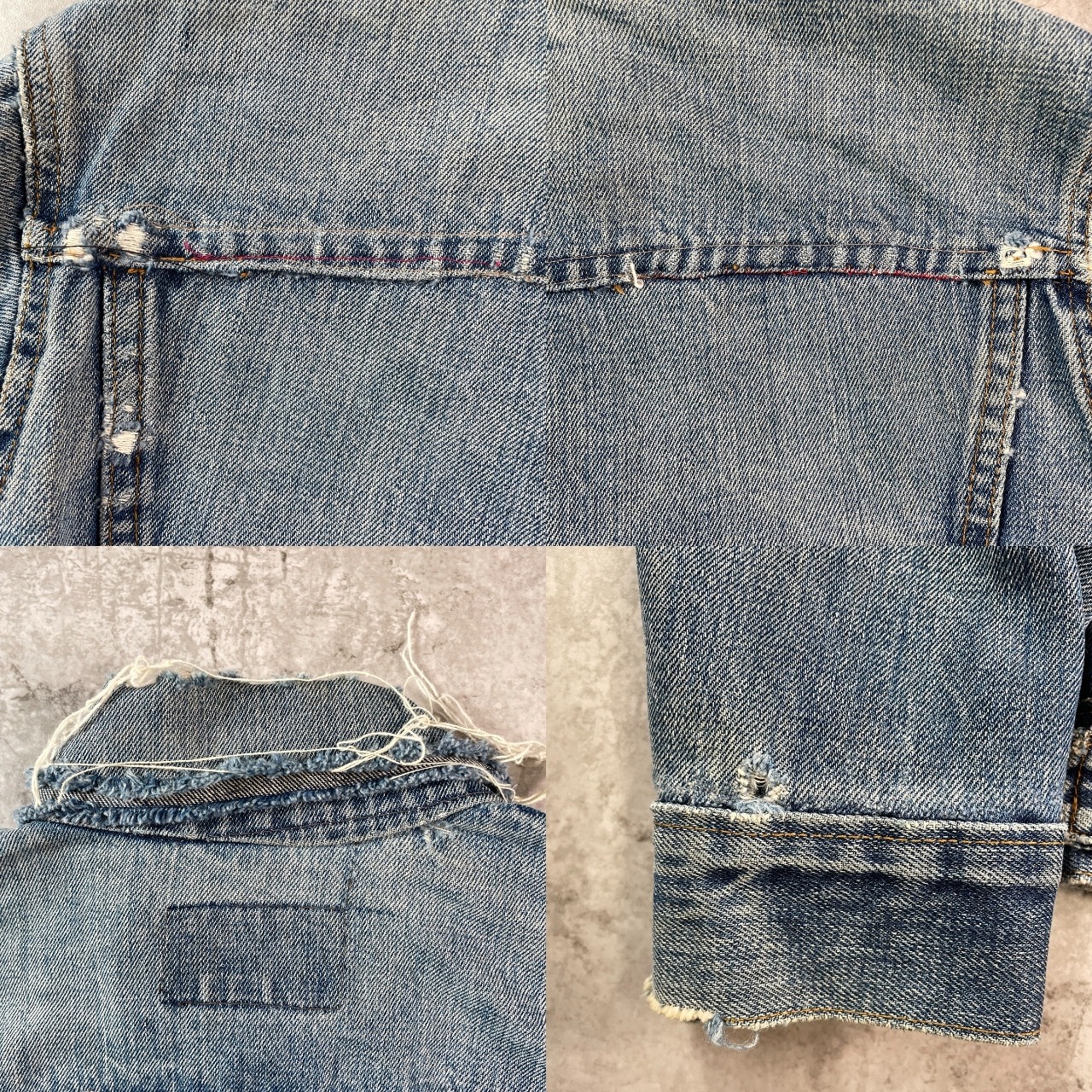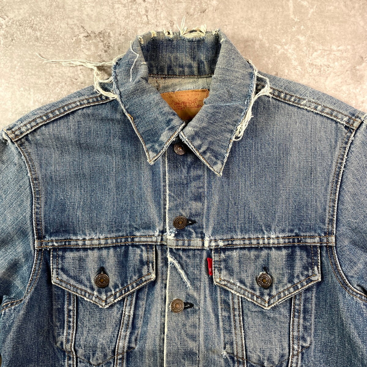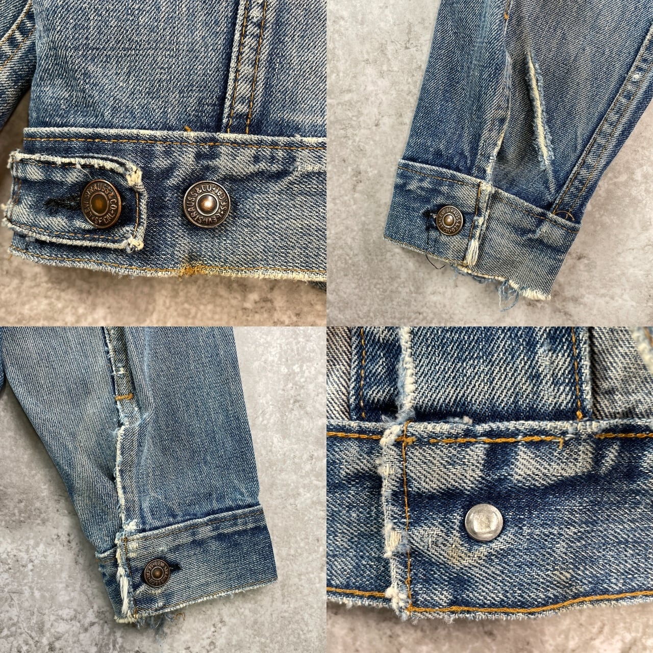 ■70~80年代 USA製 Levi's リーバイス カスタム HARLEY-DAVIDSON ワッペン付き 襤褸 ボロ トラッカーデニムジャケット メンズS相当 レディース 古着 70s 80s ヴィンテージ VINTAGE アメカジ ハーレーダビッドソン 鷲 ワシ Gジャン アタリ ハチノス 青色【デニムジャケット】/ブルー