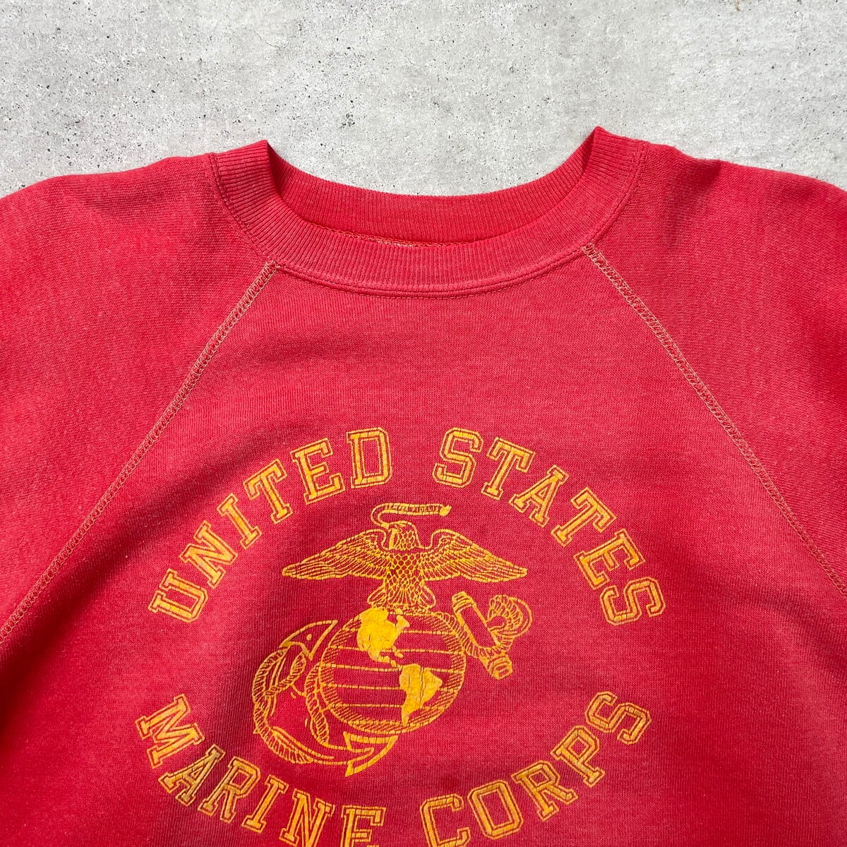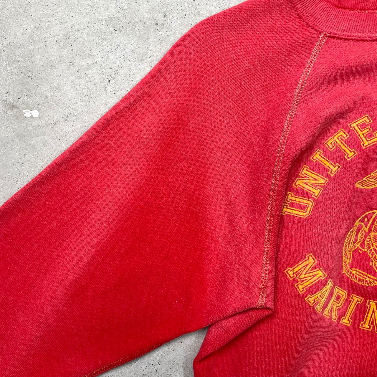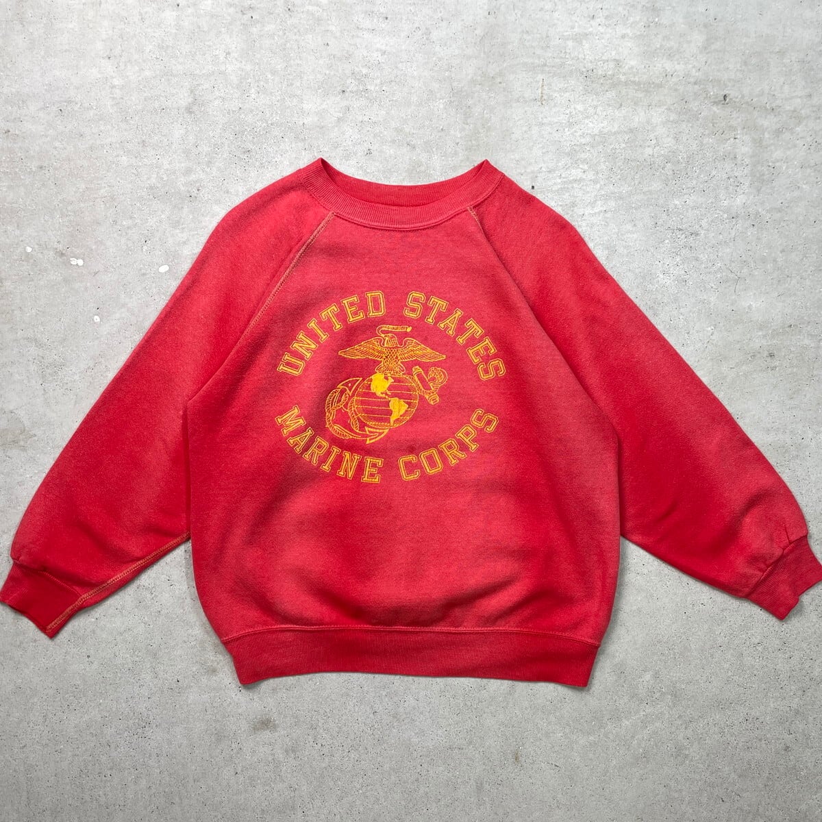 70~80年代 USA製 UNITED STATES MARINE CORPS フロッキープリント スウェットシャツ メンズS~M相当 古着 70s 80s ヴィンテージ VINTAGE アメカジ ラグランスリーブ フェードレッド 赤色【スウェット】/レッド