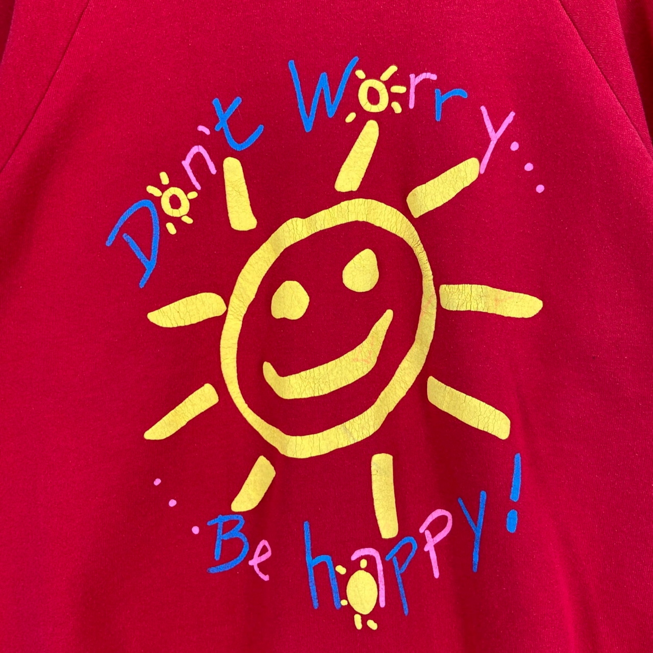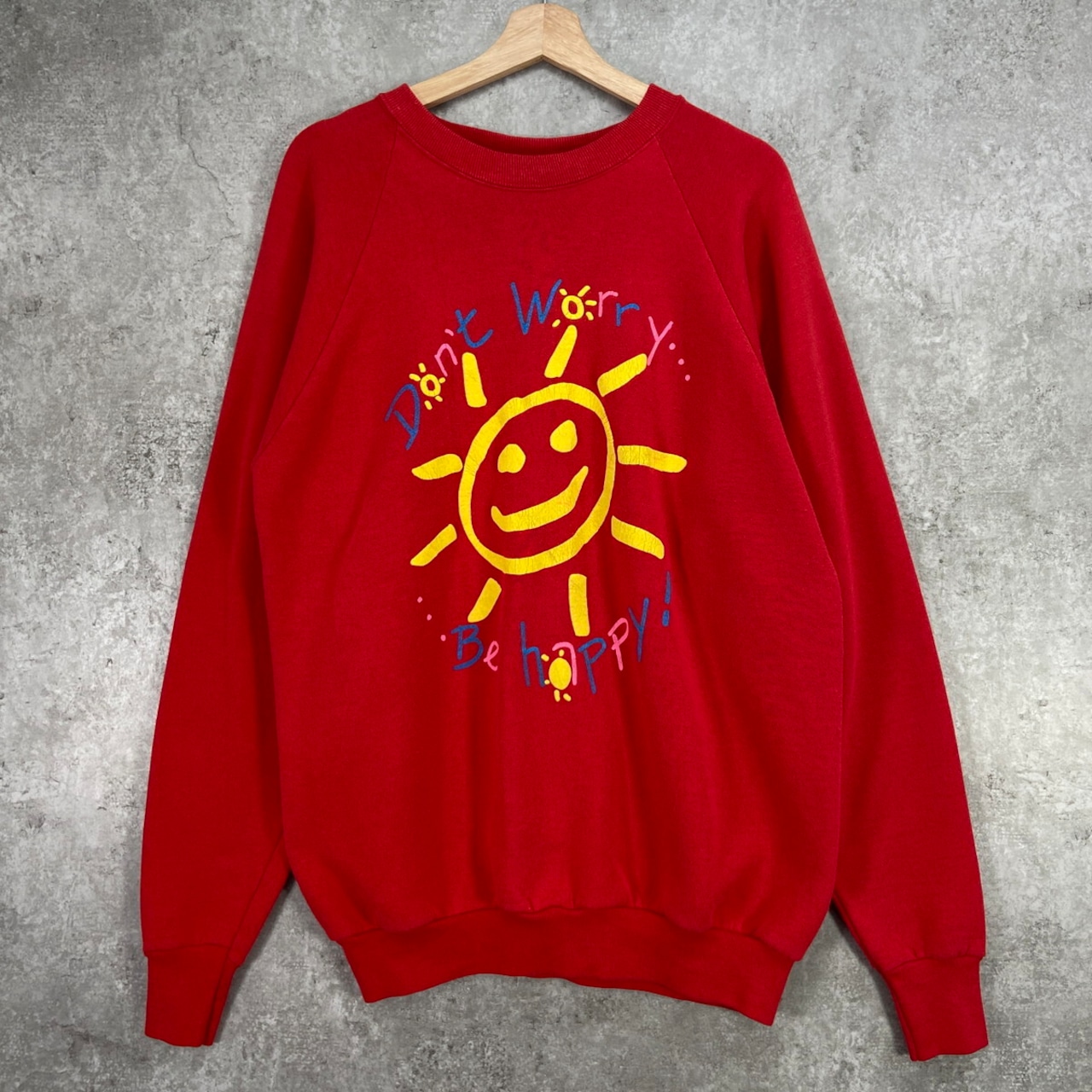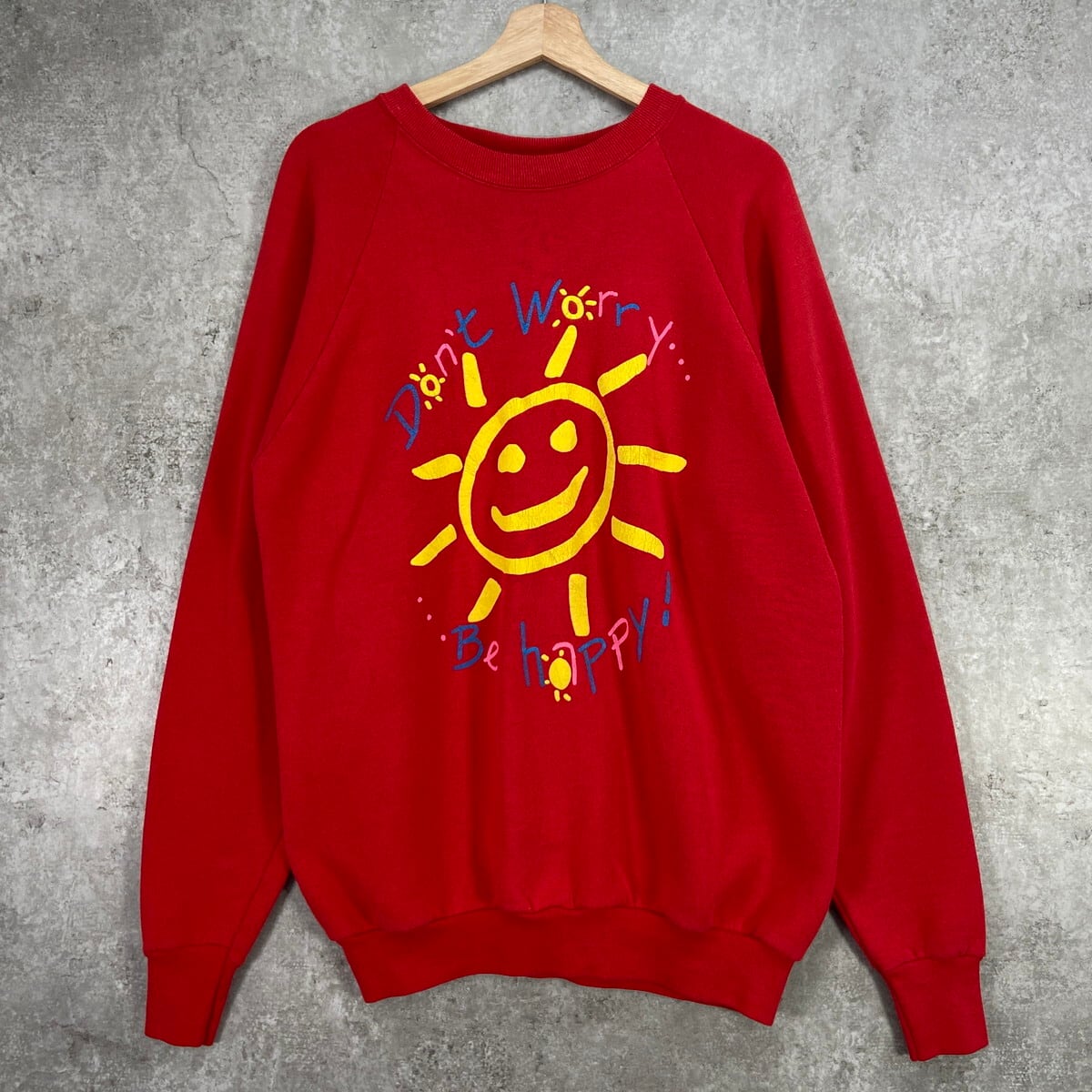 80~90年代 USA製 Don't Worry Be Happy メッセージ発砲プリント スウェットシャツ メンズL相当 古着 80s 90s VINTAGE ヴィンテージ ラグランスリーブ トレーナー 太陽 赤色【スウェット】/レッド