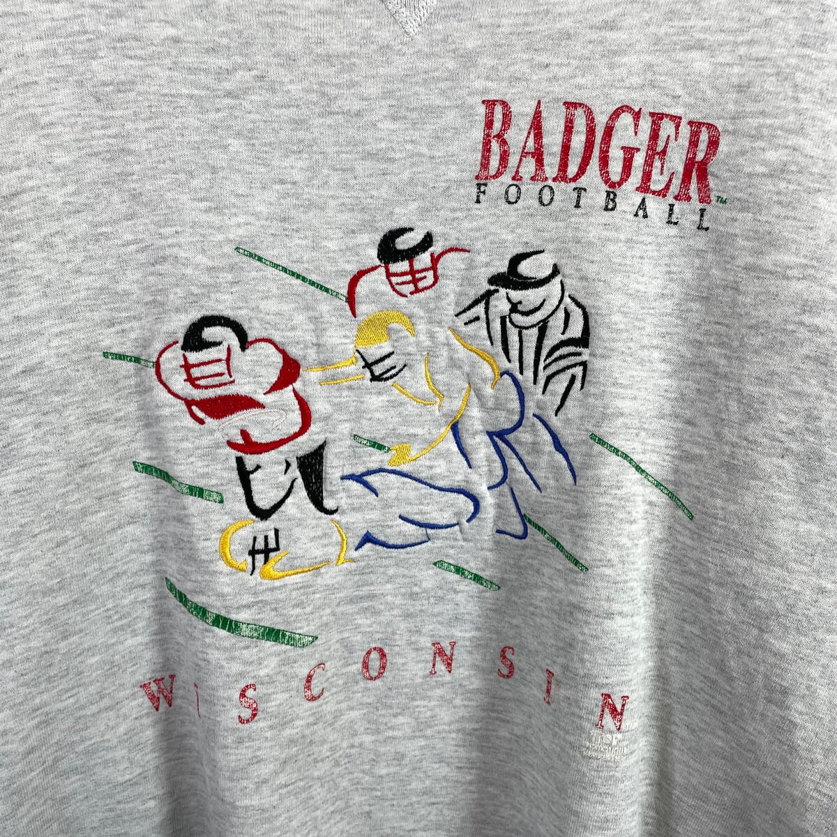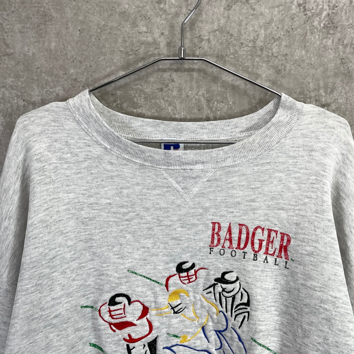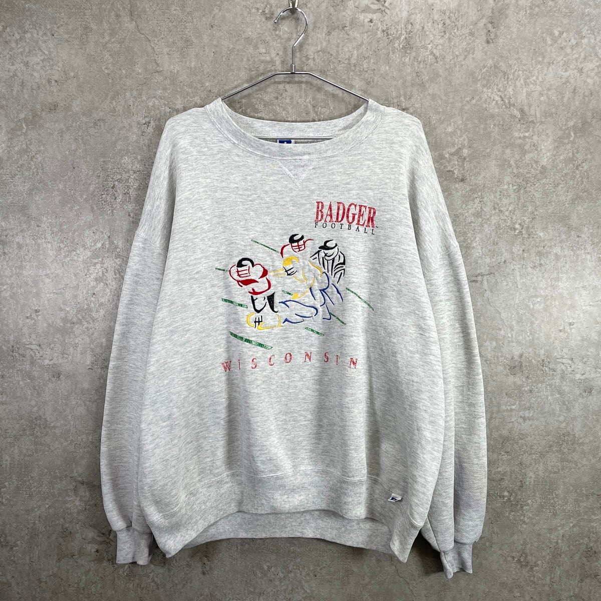 ■90年代 USA製 RUSSELL ATHLETIC アメフト チーム刺繍 スウェットシャツ メンズ2XL 古着 90s ヴィンテージ VINTAGE ラッセルアスレチック 前Vガゼット アメカジ トレーナー BADGER FOOTBALL WISCONSIN ビッグサイズ 大きいサイズ ライトグレー 杢グレー【スウェット】/グレー