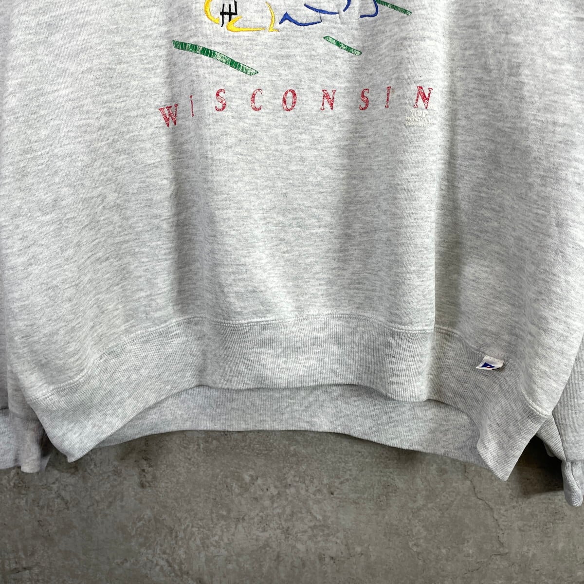 90年代 USA製 RUSSELL ATHLETIC アメフト チーム刺繍 スウェットシャツ メンズ2XL 古着 90s ヴィンテージ VINTAGE ラッセルアスレチック 前Vガゼット アメカジ トレーナー BADGER FOOTBALL WISCONSIN ビッグサイズ 大きいサイズ ライトグレー 杢グレー【スウェット】/グレー【US-30】