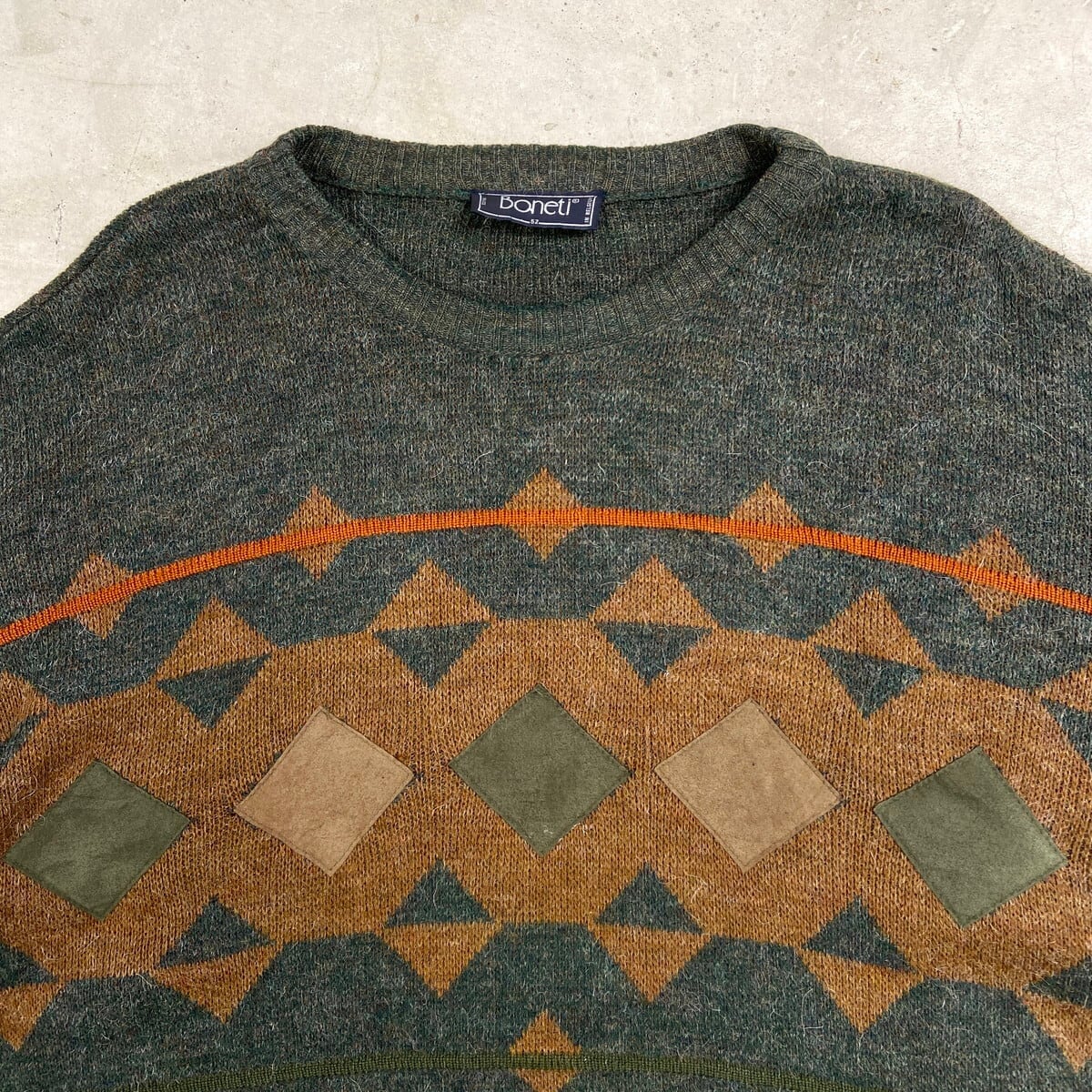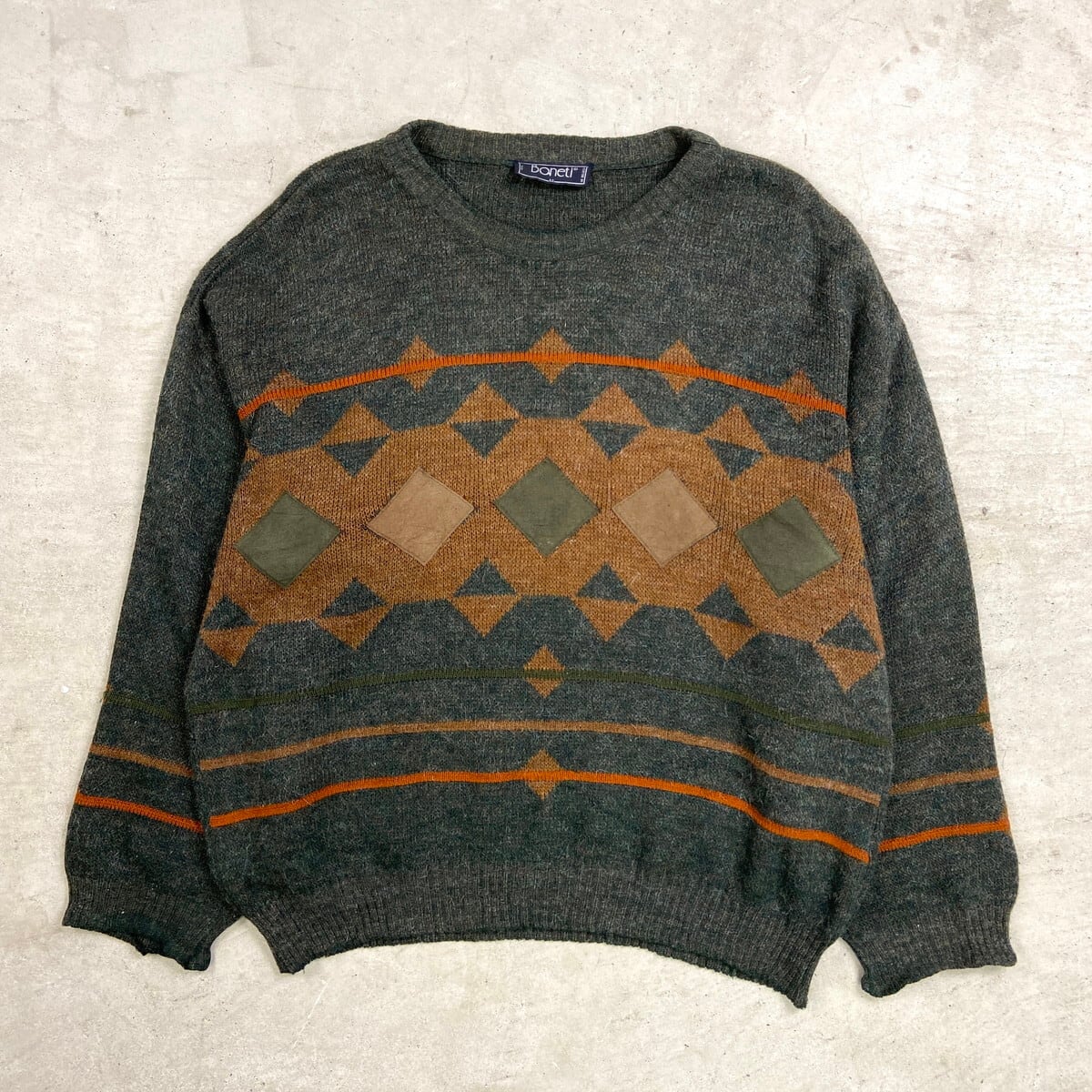 90年代 ベルギー製 Boneti アルパカ混 アクリルニットセーター スエードパッチ メンズ2XL相当 古着 90s VINTAGE ヴィンテージ クルーネック ビッグサイズ 大きいサイズ チャコールグレー ブラウン オレンジ【ニットセーター】/グレー