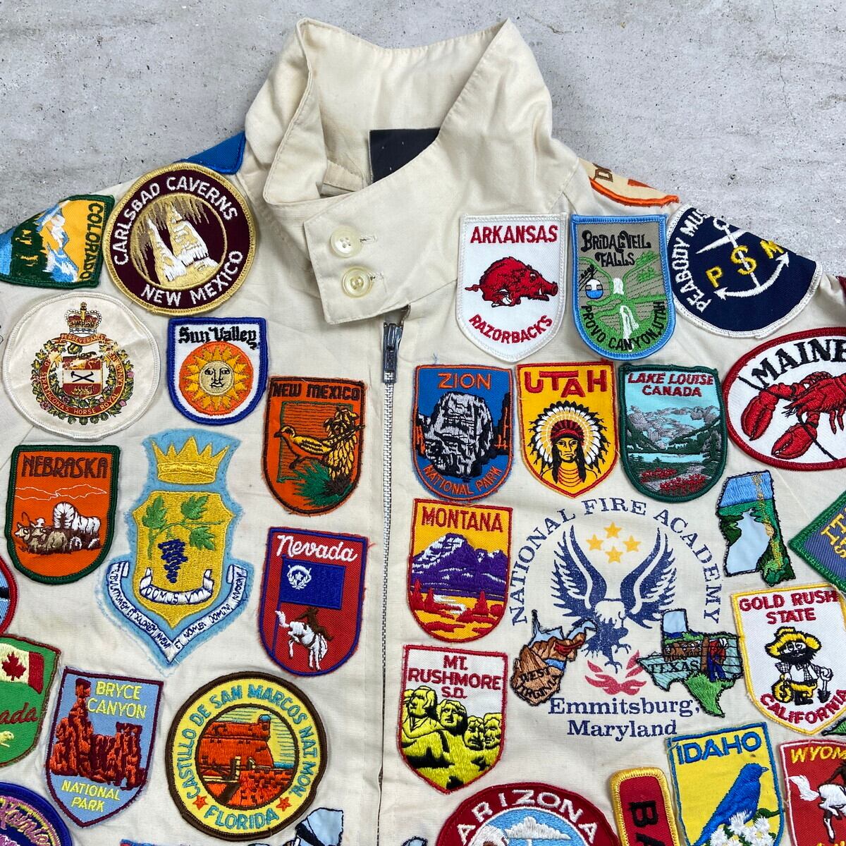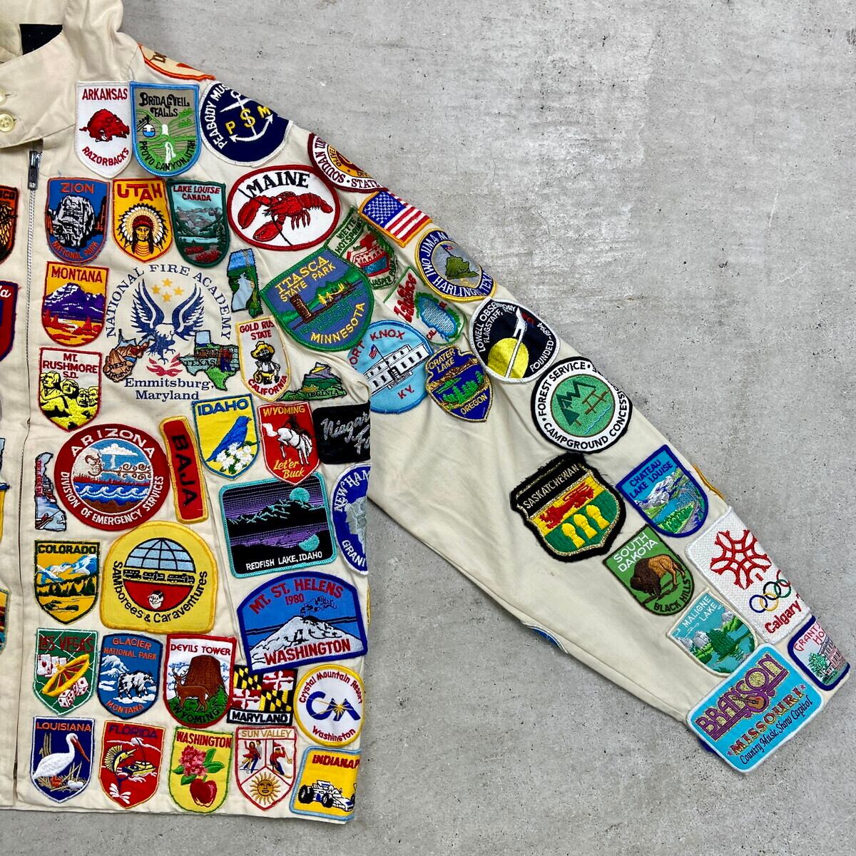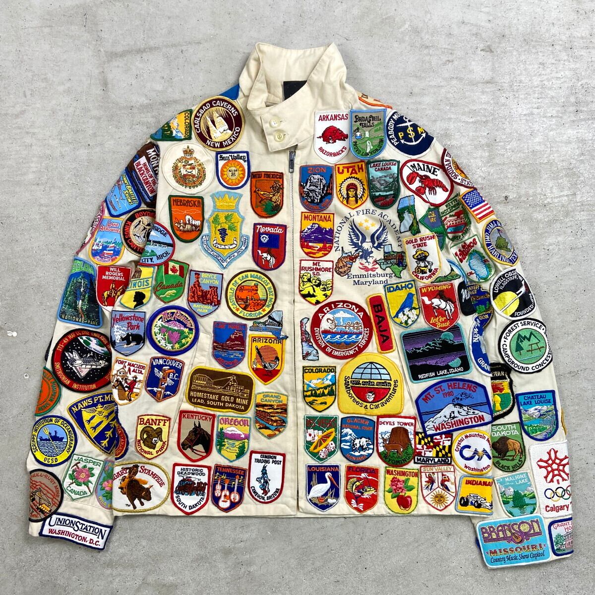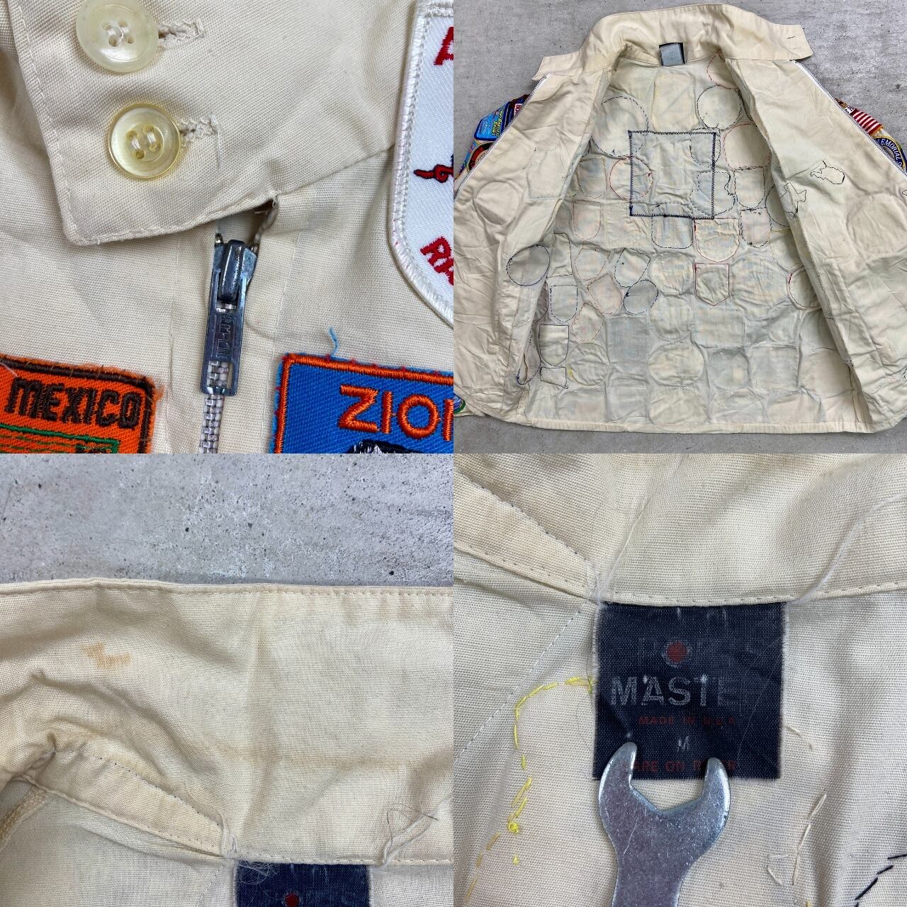 ■70年代 USA製 SPORTS MASTER ワッペンカスタム スポーツジャケット メンズM 古着 70s VINTAGE ヴィンテージ アメカジ スイングトップ チンスト付き PRIDEジッパー オフホワイトカラー【ナイロンジャケット】/ベージュ
