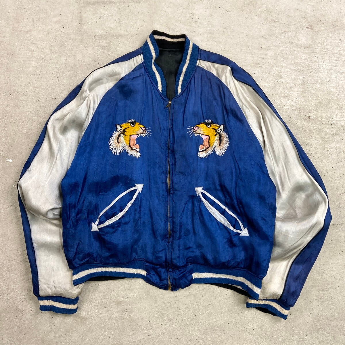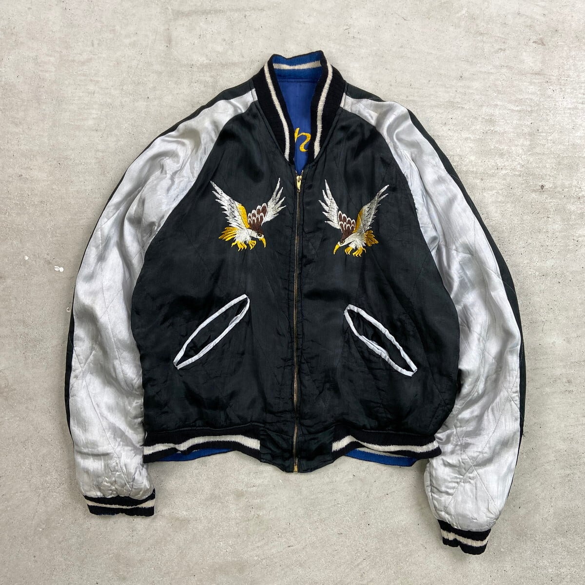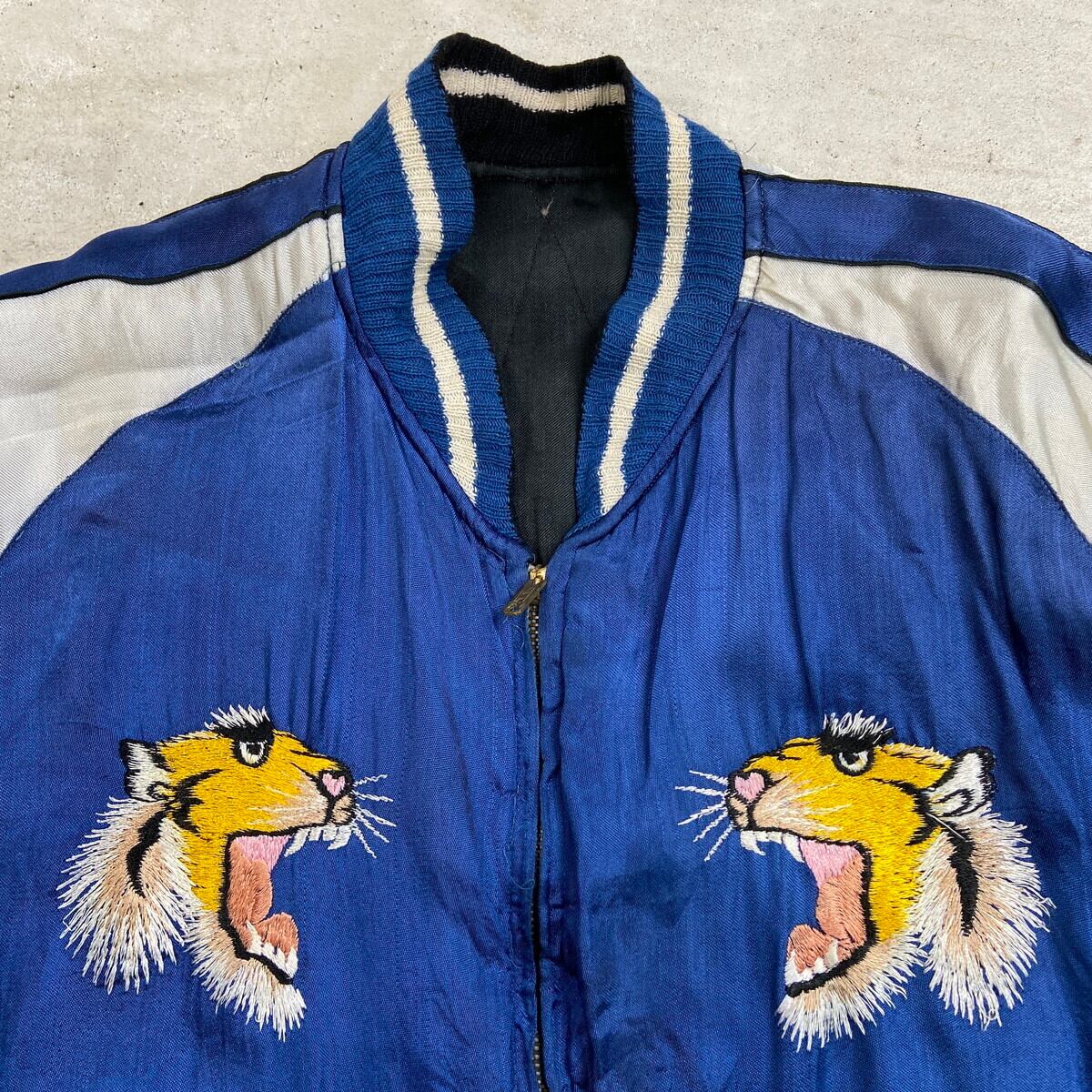 ■50年代 JAPAN スーベニアジャケット リバーシブル キルティング スカジャン メンズS~M相当 古着 50s VINTAGE ヴィンテージ 虎 鷹 富士山 刺繍 サテン ブルー×ブラック【ブルゾン・ジャケット】/ブルー