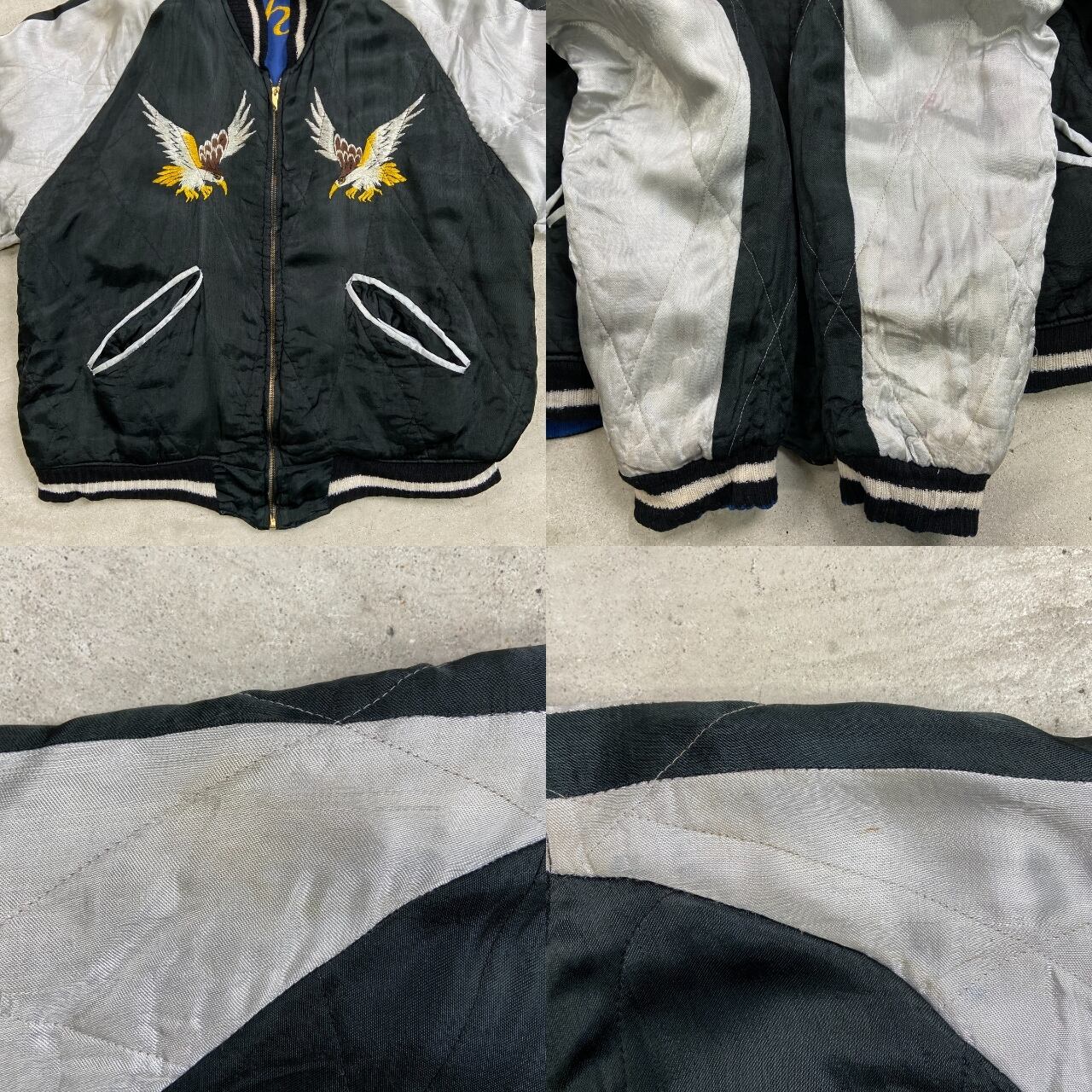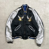 50年代 JAPAN スーベニアジャケット リバーシブル キルティング スカジャン メンズS~M相当 古着 50s VINTAGE ヴィンテージ 虎 鷹 富士山 刺繍 サテン ブルー×ブラック【ブルゾン・ジャケット】/ブルー