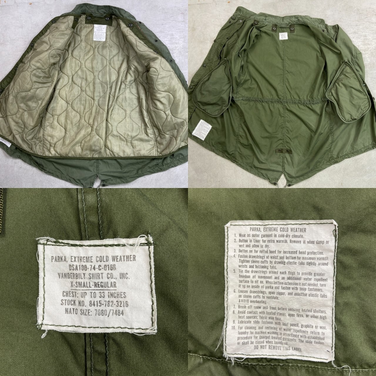 74年納品 U.S.ARMY 米軍実品 M-65 フィールドパーカー フィッシュテール モッズコート X-SMALL-REGULAR XS メンズL相当 古着 70s ヴィンテージ VINTAGE キルティングライナー付き ドローコード付き オリーブグリーン【ミリタリージャケット】/カーキグリーン