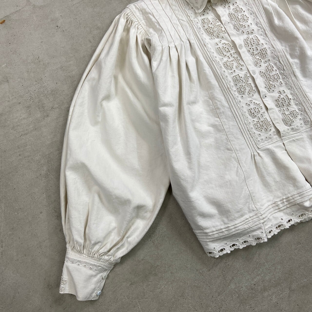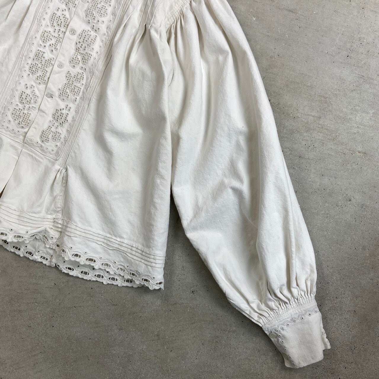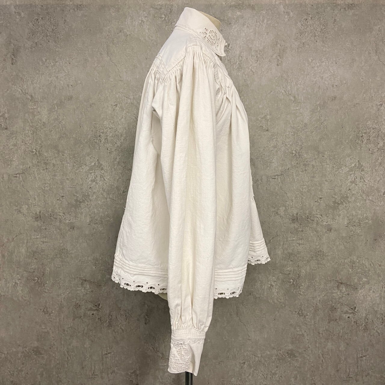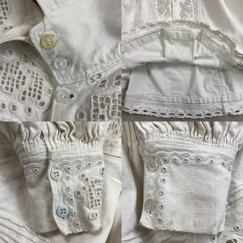 コットンリネンのようなハリのある生地に、繊細なホワイトワークとピンタックが施された美しい一着です。ハリのある質感の中にも柔らかさがあり、アンティークならではの風合いになります。袖には細かなギャザーにより程よいボリュームスリーブ。白蝶貝ボタンも当時の時代を感じるディテールです。伝統的な民族衣装の多くが直線裁断のスモック型であるのに対し、こちらは「セットインスリーブ(肩のライン)」と「前開きのシャツ構造」を採用。身体のラインを美しく見せる西欧的なシルエットにアップデートされています。
