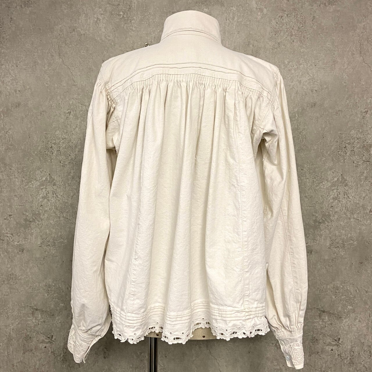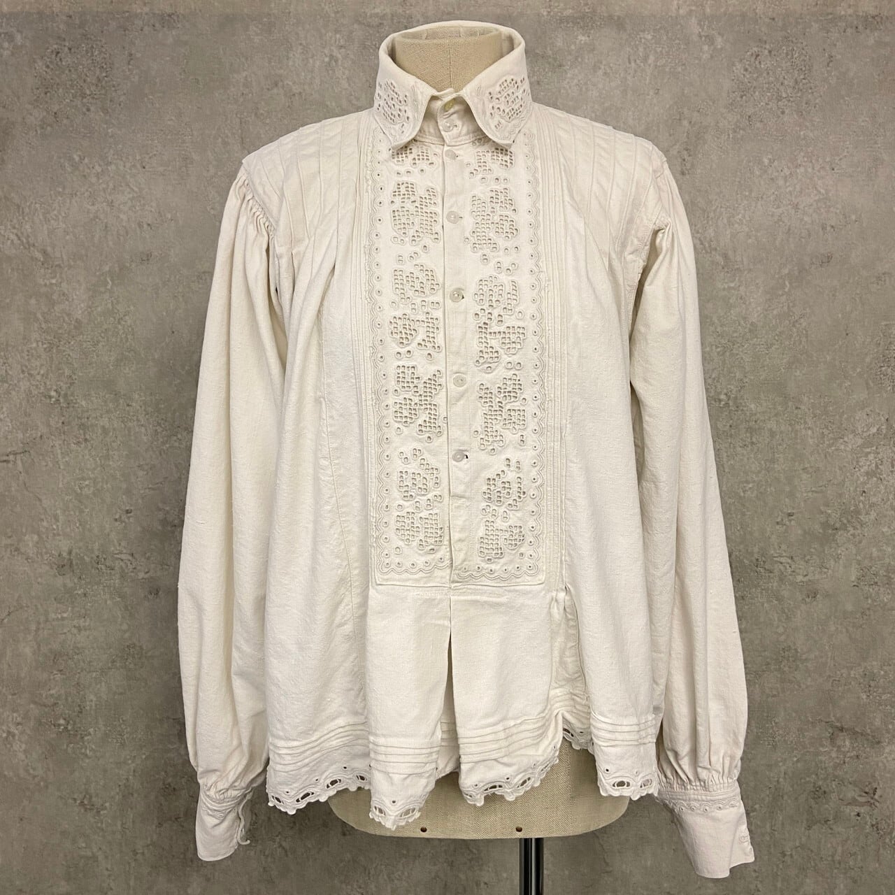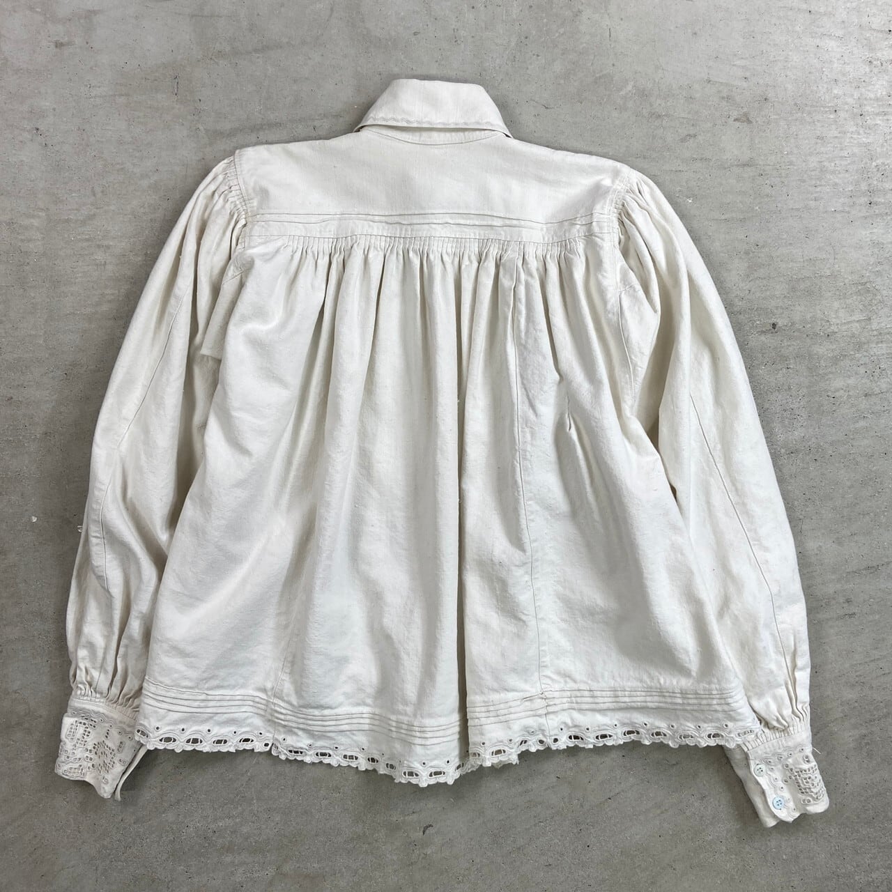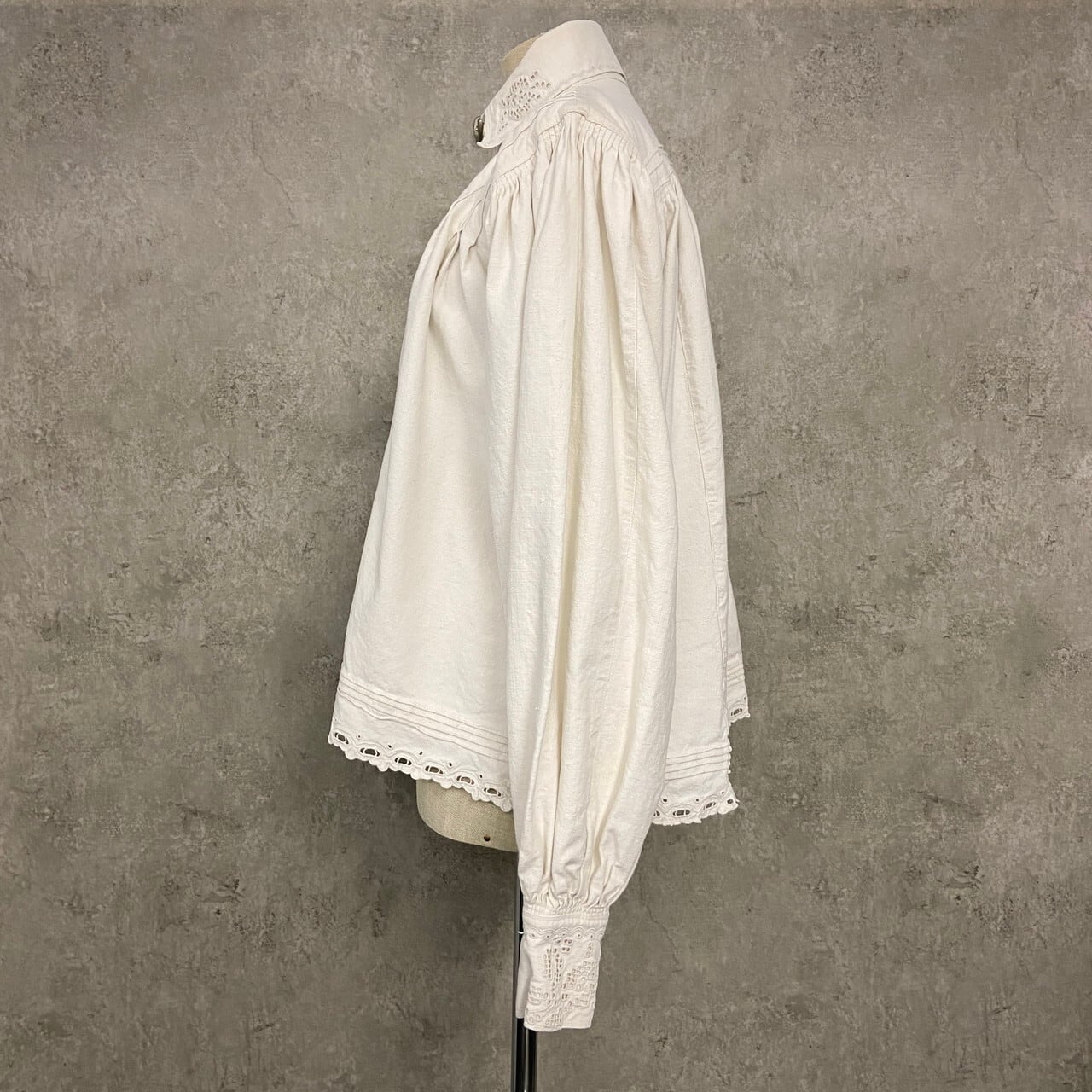 コットンリネンのようなハリのある生地に、繊細なホワイトワークとピンタックが施された美しい一着です。ハリのある質感の中にも柔らかさがあり、アンティークならではの風合いになります。袖には細かなギャザーにより程よいボリュームスリーブ。白蝶貝ボタンも当時の時代を感じるディテールです。伝統的な民族衣装の多くが直線裁断のスモック型であるのに対し、こちらは「セットインスリーブ(肩のライン)」と「前開きのシャツ構造」を採用。身体のラインを美しく見せる西欧的なシルエットにアップデートされています。