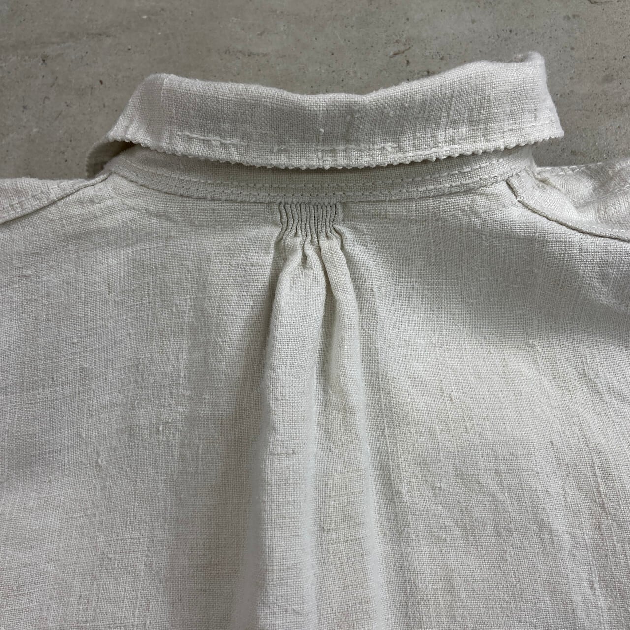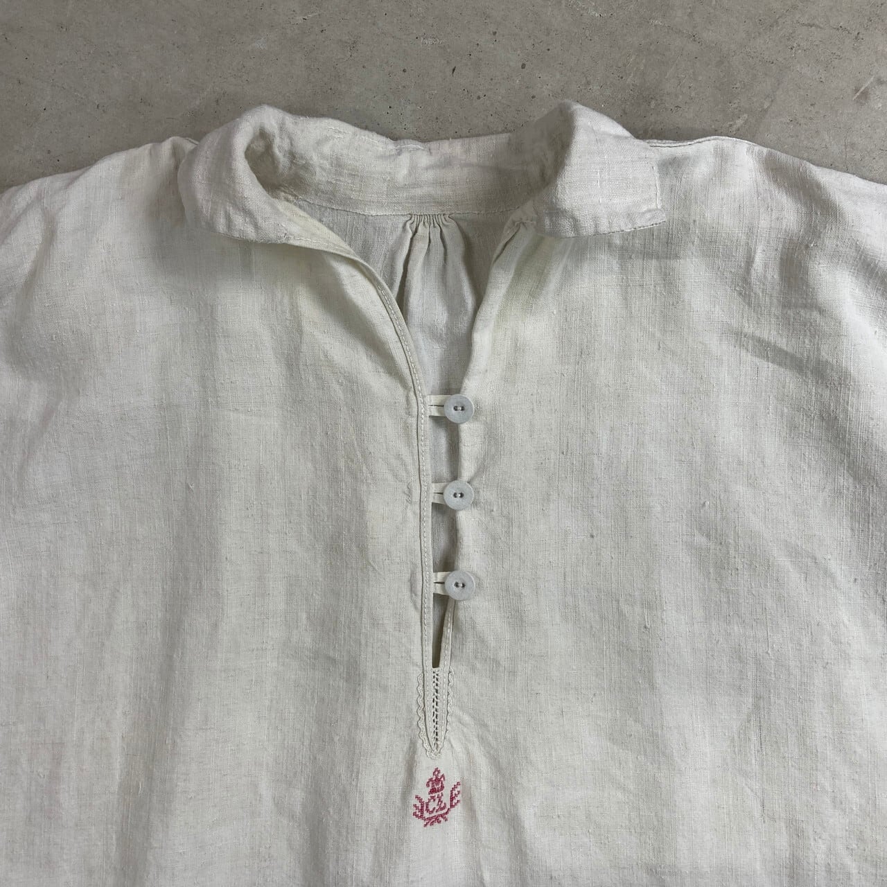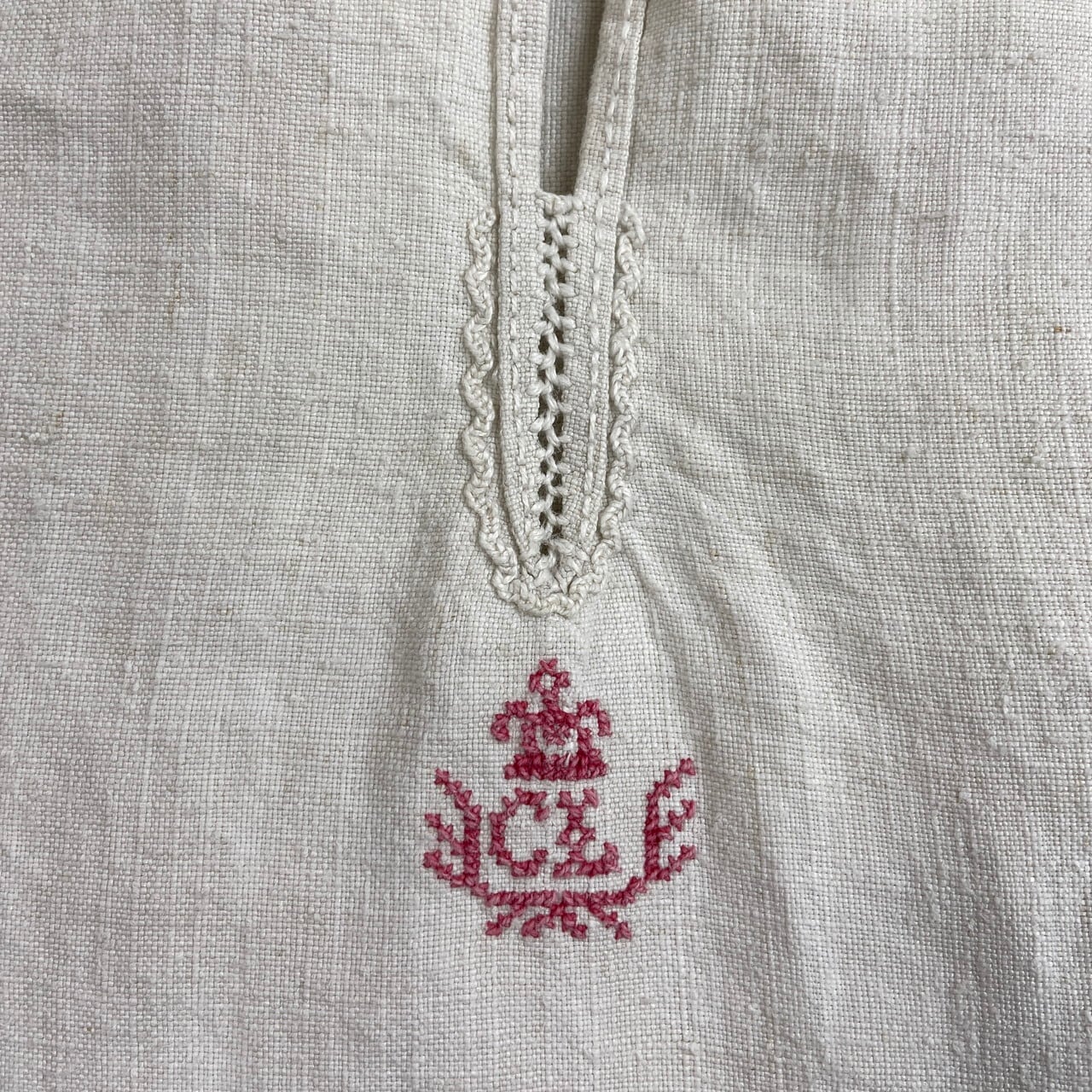 当時の上流階級や貴族が、寝衣(ナイトドレス)や室内着として誂えた「シャトーリネン」の最高峰と呼べる一着です。肩周りと袖口には、熟練の手仕事による細密なギャザーが施されており、当時の丁寧なものづくりが伺えます。胸元には、このリネンが名家の所有物であったことを示す「王冠」のモノグラムが、伝統的な赤い糸で一針ずつ丁寧に手刺繍されています。