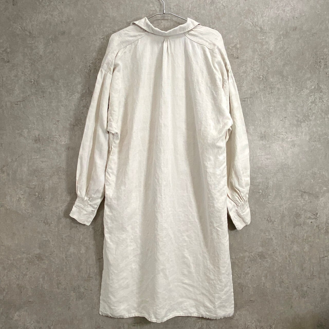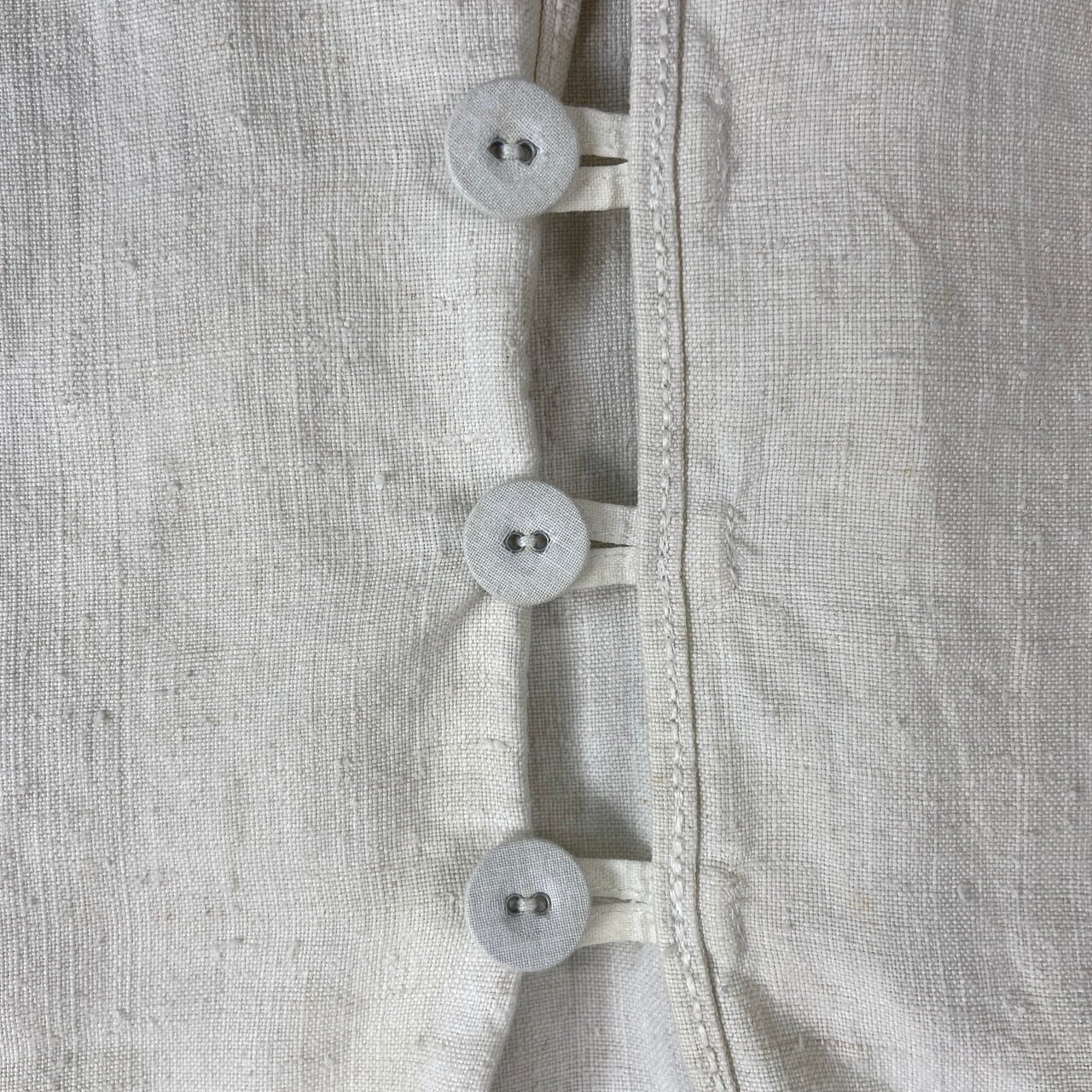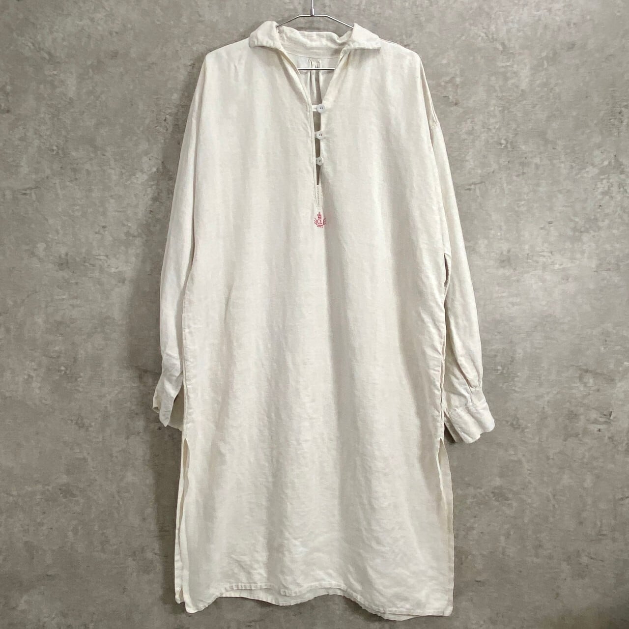 当時の上流階級や貴族が、寝衣(ナイトドレス)や室内着として誂えた「シャトーリネン」の最高峰と呼べる一着です。肩周りと袖口には、熟練の手仕事による細密なギャザーが施されており、当時の丁寧なものづくりが伺えます。胸元には、このリネンが名家の所有物であったことを示す「王冠」のモノグラムが、伝統的な赤い糸で一針ずつ丁寧に手刺繍されています。