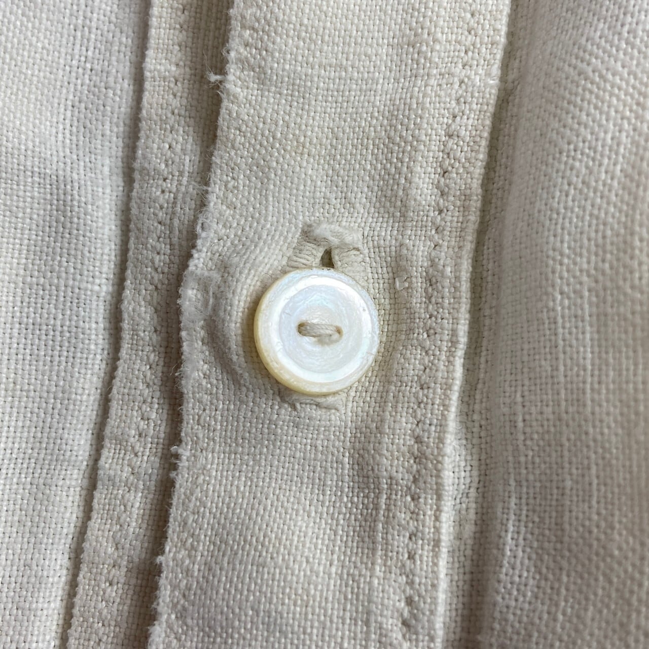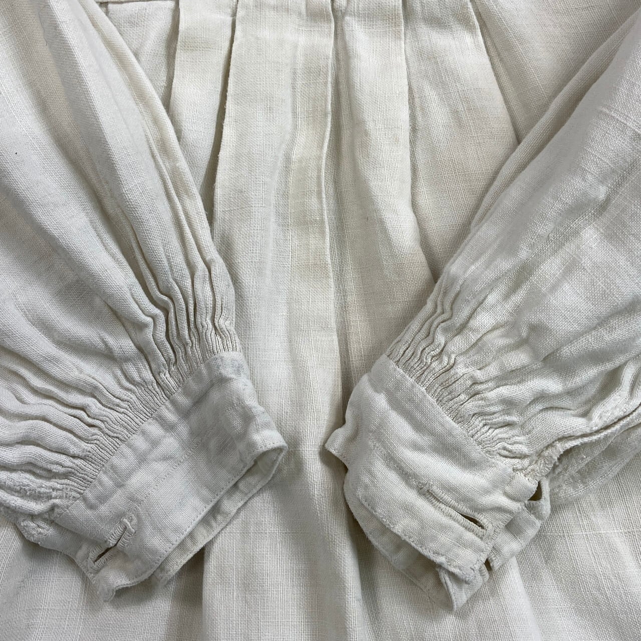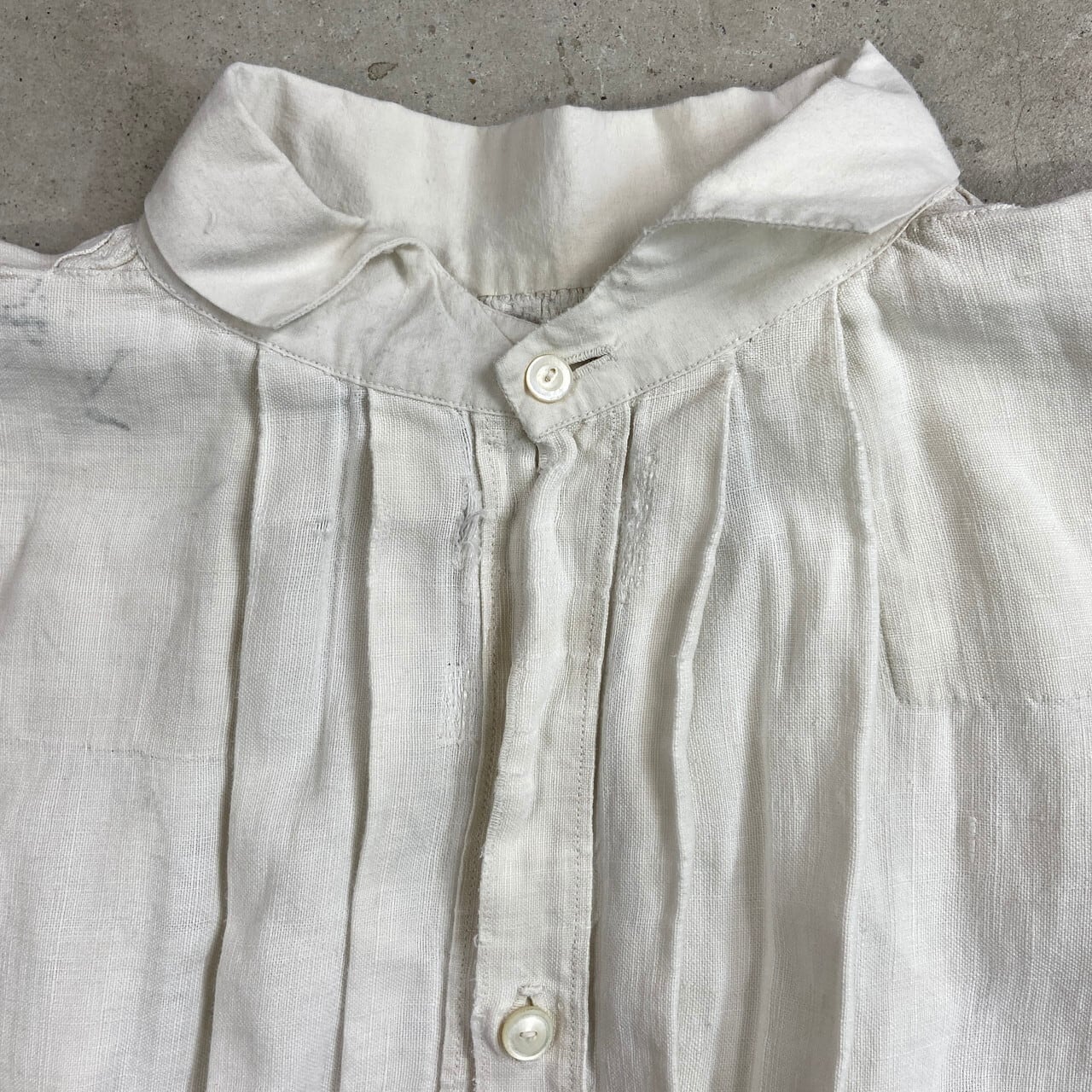 農夫や羊飼いが作業着としていたスモックの中でも、こちらは「Sunday Best(日曜日の勝負服)」として大切に作られた希少な個体。随所に施された贅沢なディテールが、当時の持ち主の美意識を物語っています。丈夫な手織りリネンの身頃に対し、襟には肌当たりの良い柔らかなコットンを採用。着心地と清潔感を追求した、当時の仕立ての知恵が詰まっています。