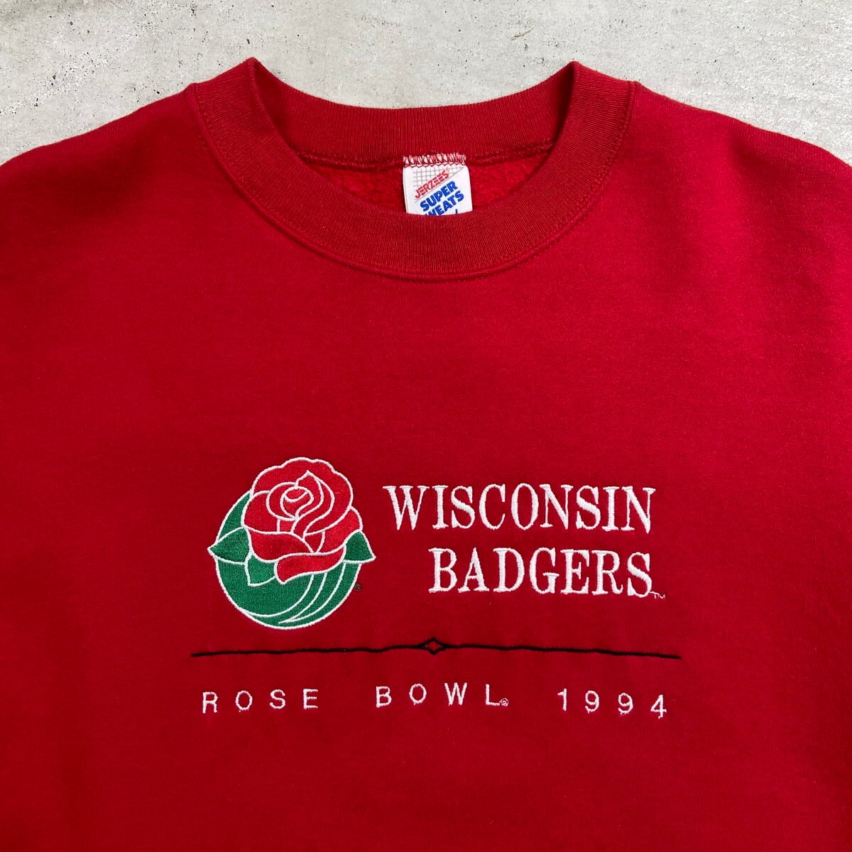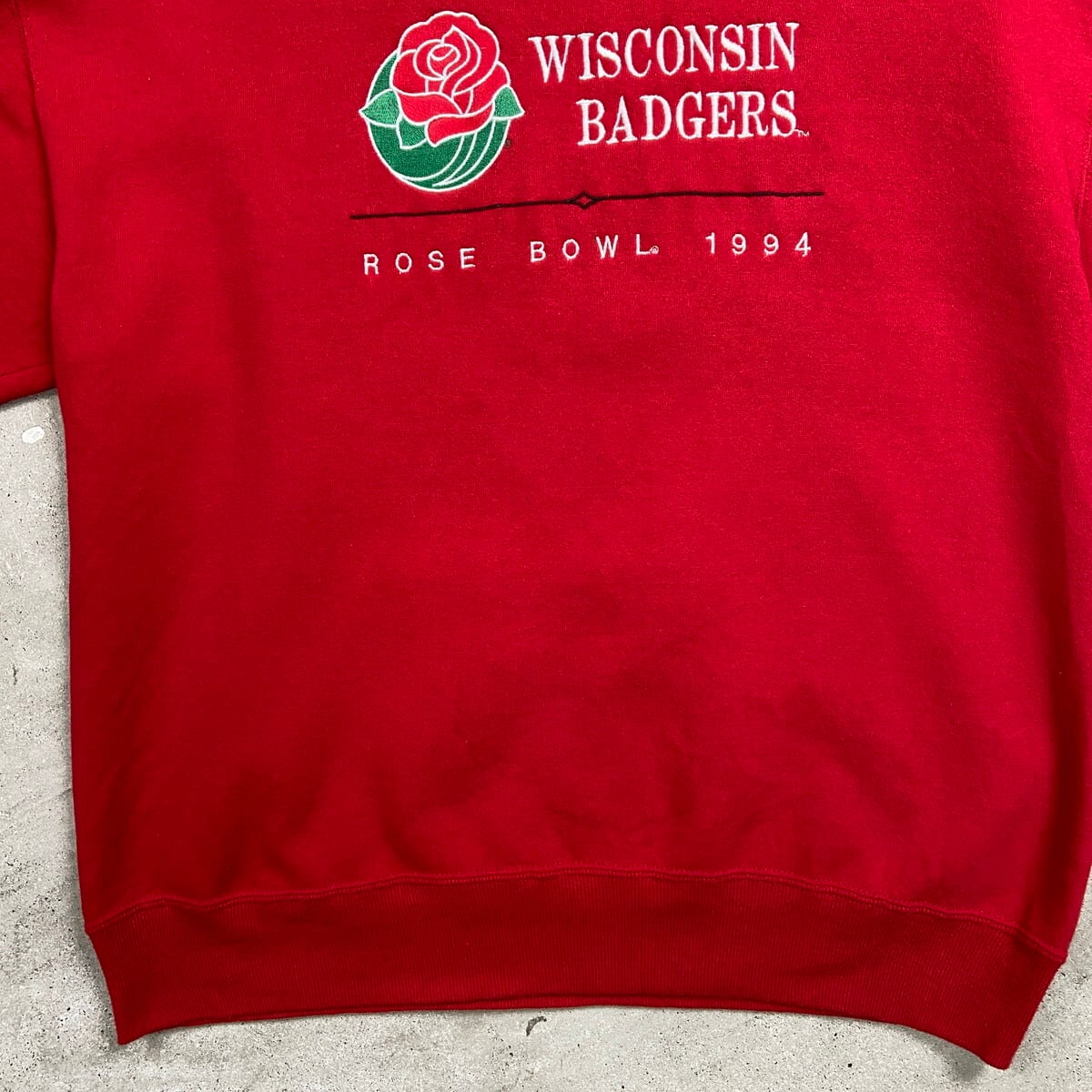 ■90年代 USA製 WISCONSIN BADGERS ROSE BOWL カレッジチームロゴ刺繍 スウェットシャツ メンズM相当 古着 90s VINTAGE ヴィンテージ ローズボウル アメフト スポーツ 赤色【スウェット】/レッド