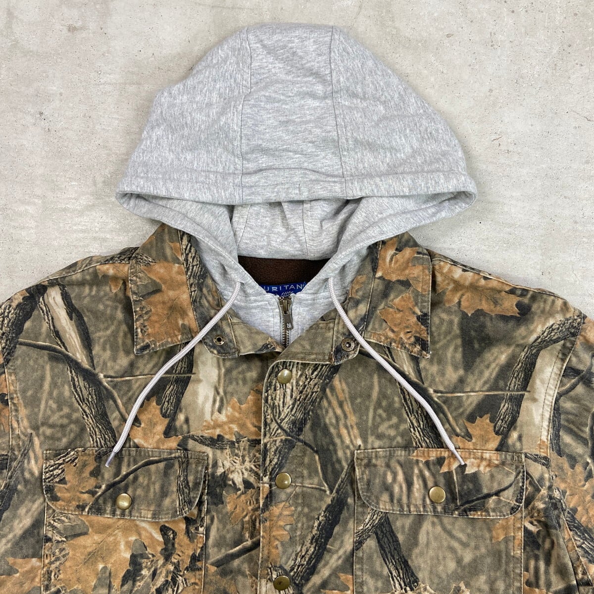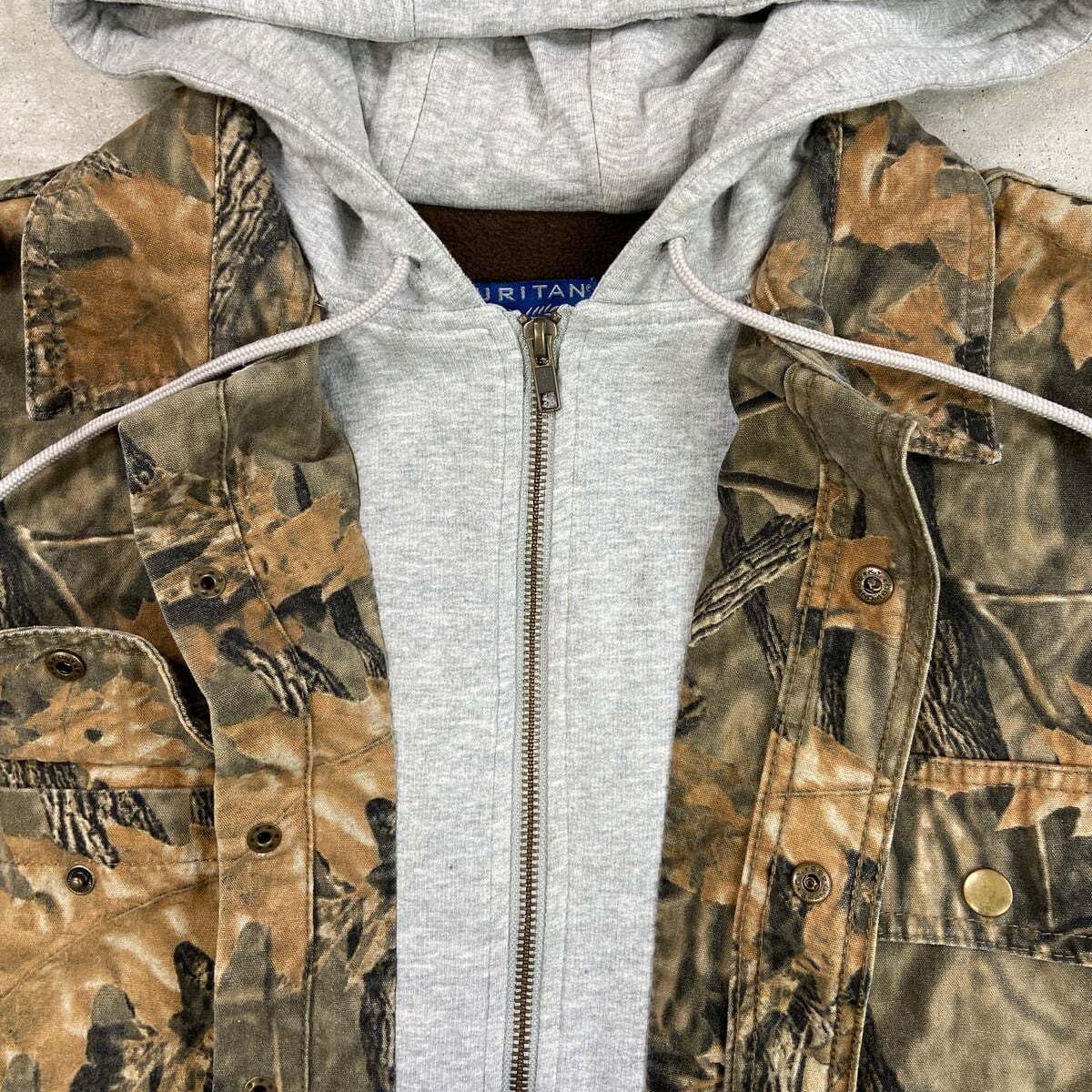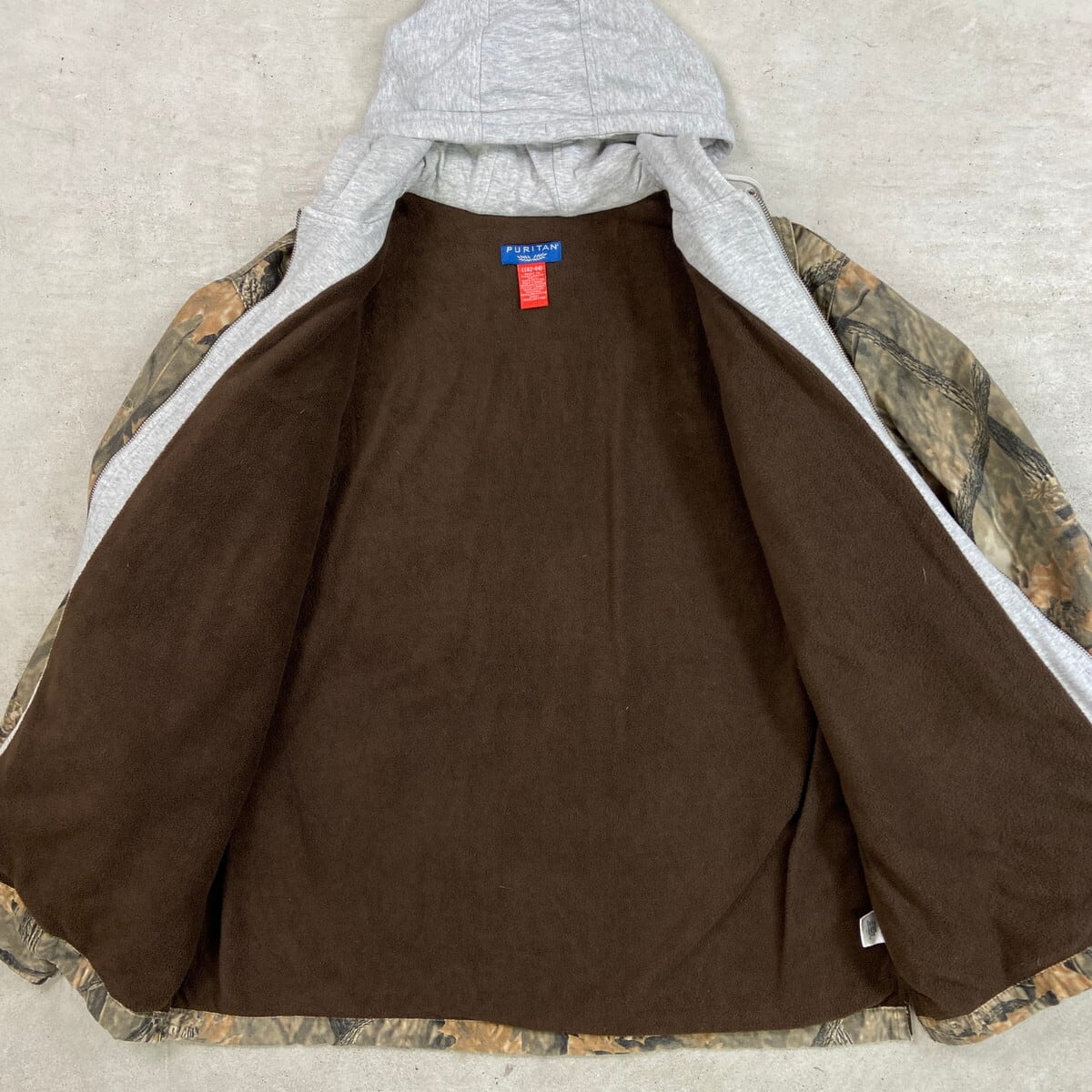 ■PURITAN リアルツリーカモジャケットパーカー メンズXL相当 古着 アメカジ フェイクレイヤード 迷彩 ダブルポケット フリースライナー グレー ブラウン【コットンジャケット】/マルチカラー