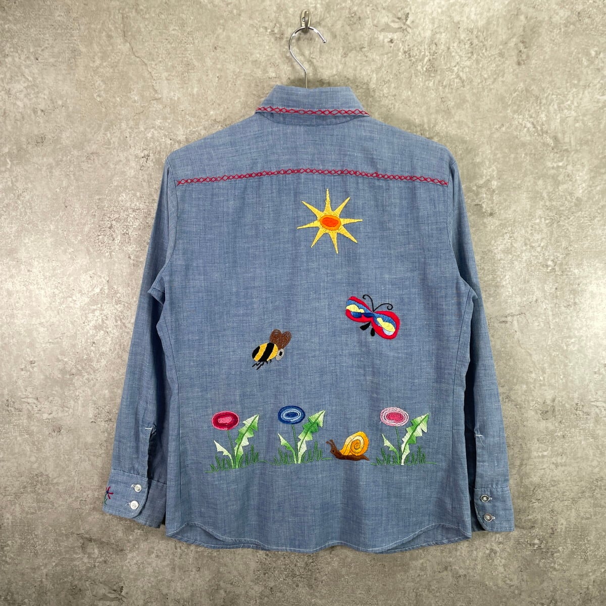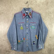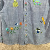 70年代 USA製 Levi's リーバイス 手刺繍デザイン シャンブレーシャツ メンズS相当 レディース 古着 70s VINTAGE ヴィンテージ アメカジ ダブルポケット 青色【長袖シャツ】/ブルー