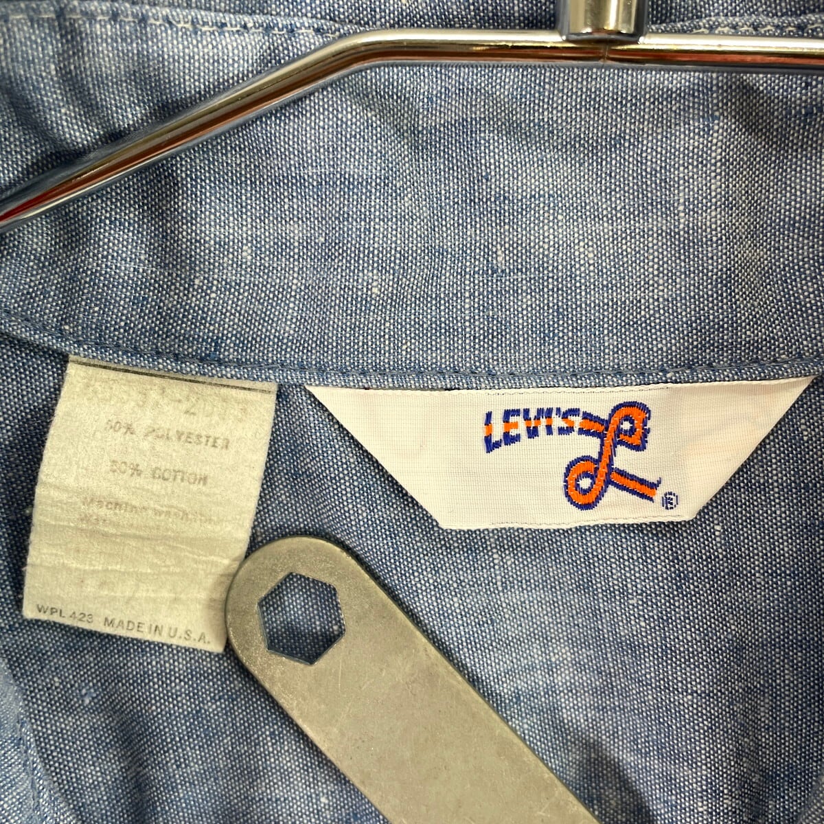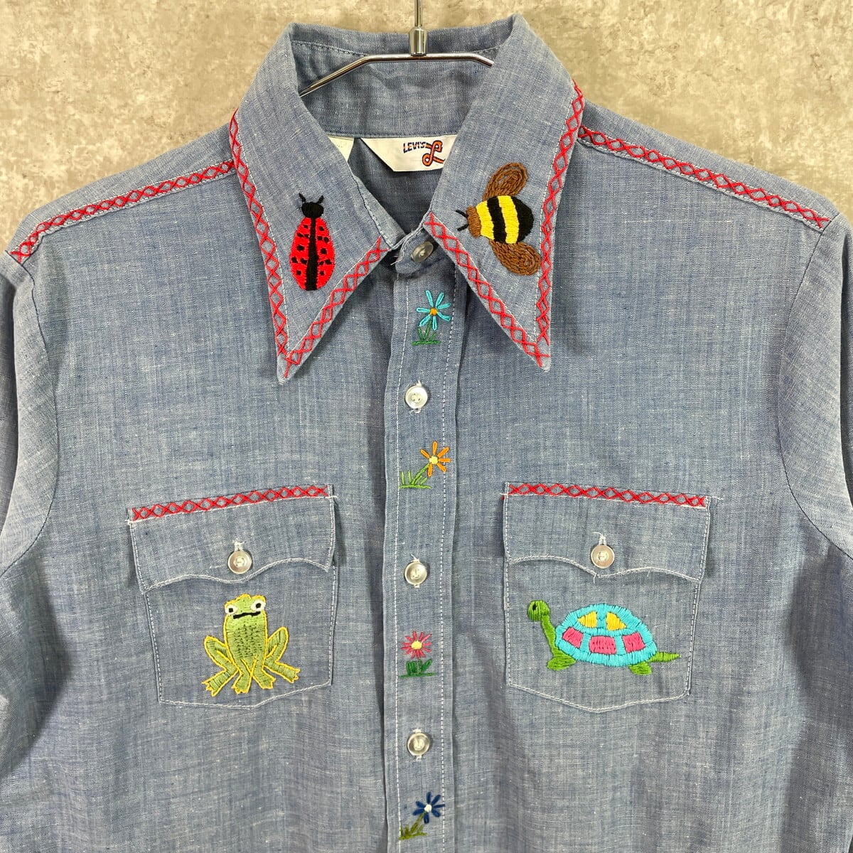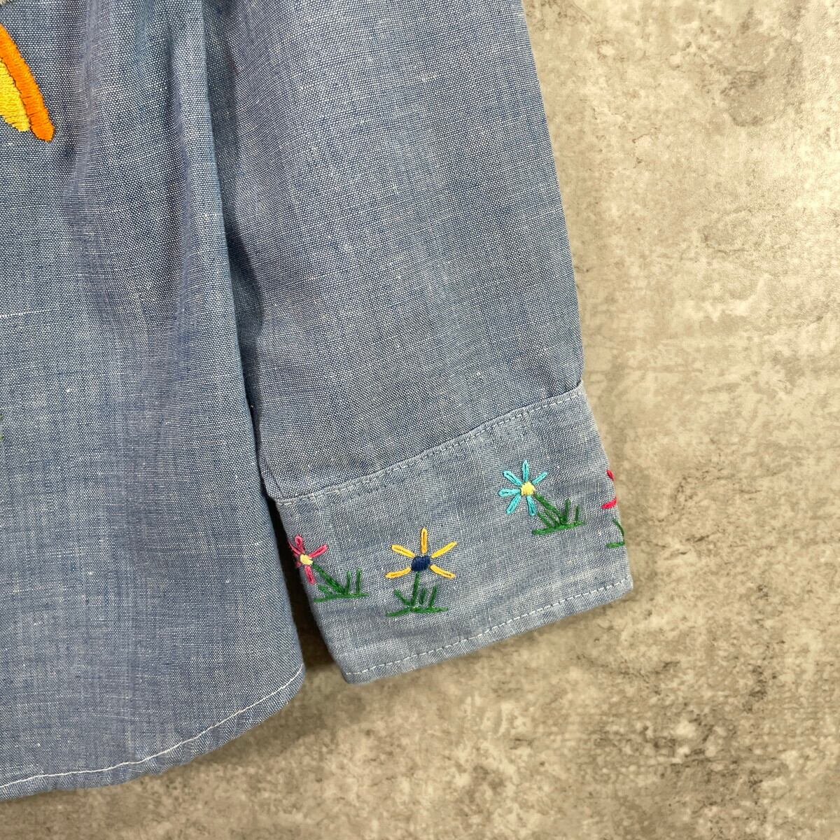 ■70年代 USA製 Levi's リーバイス 手刺繍デザイン シャンブレーシャツ メンズS相当 レディース 古着 70s VINTAGE ヴィンテージ アメカジ ダブルポケット 青色【長袖シャツ】/ブルー