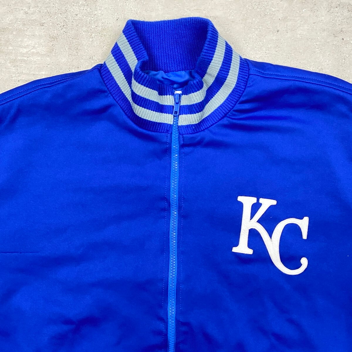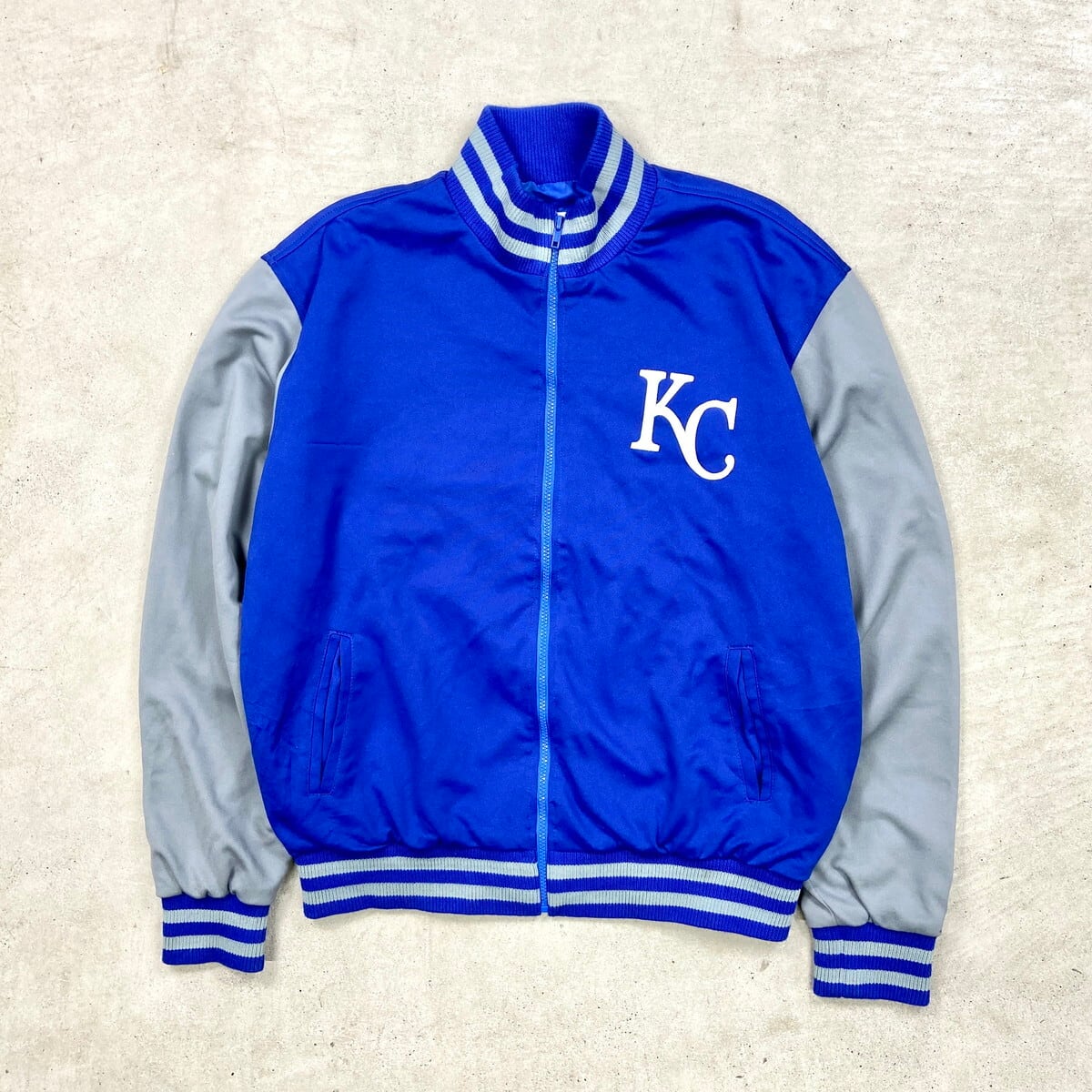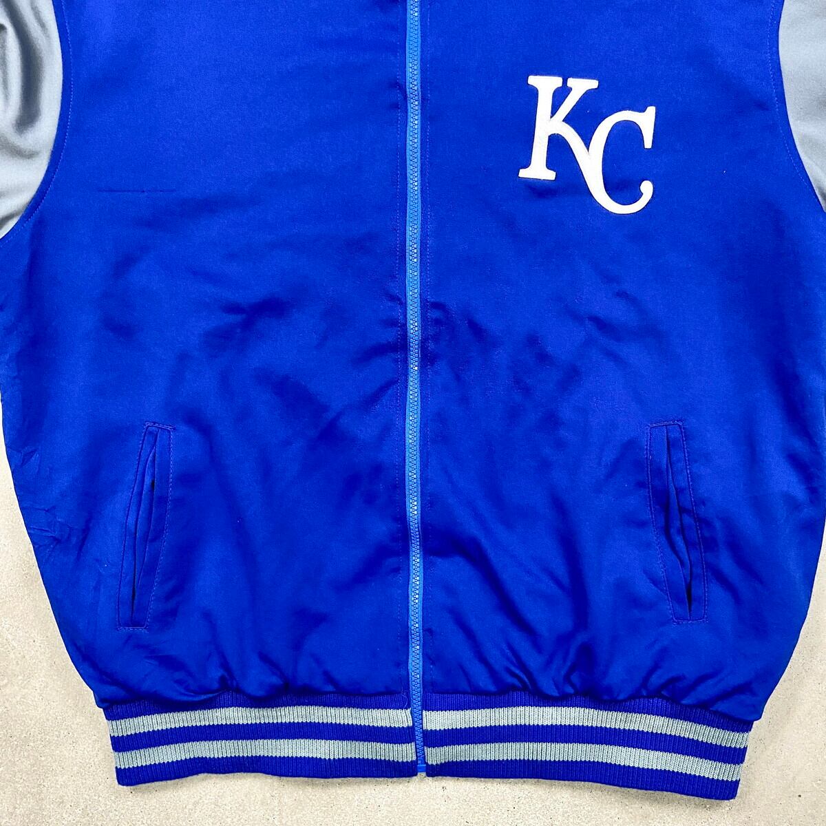 USA製 MLB カンザスシティ ロイヤルズ リブボーダー スタジャン メンズXL 古着 KANSAS CITY ROYALS メジャーリーグ スポーツ ブルー グレー【ブルゾン・ジャケット】/ブルー