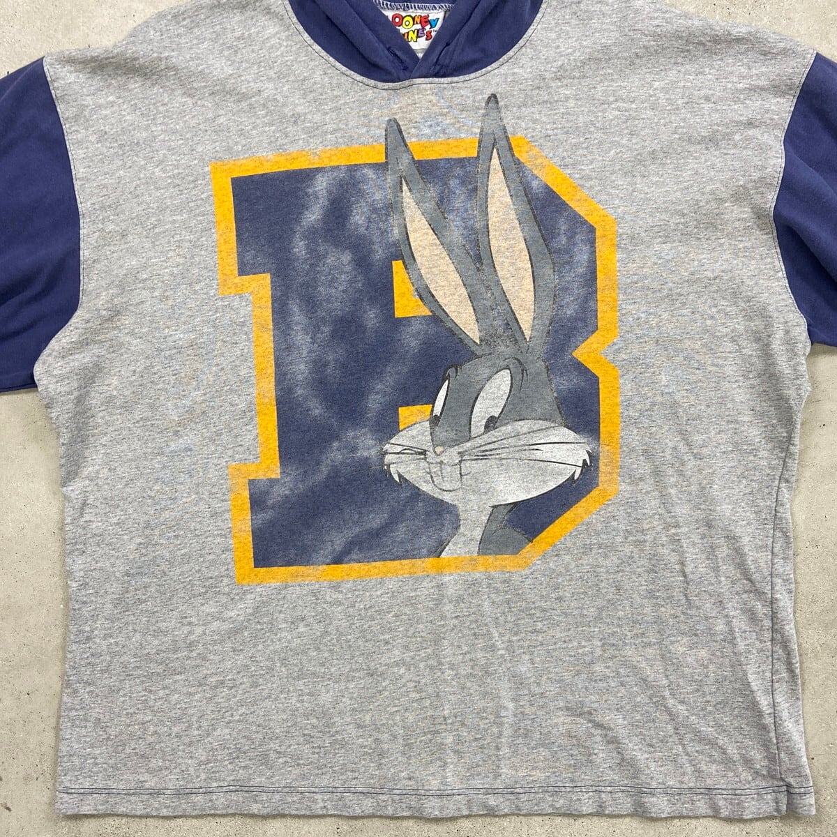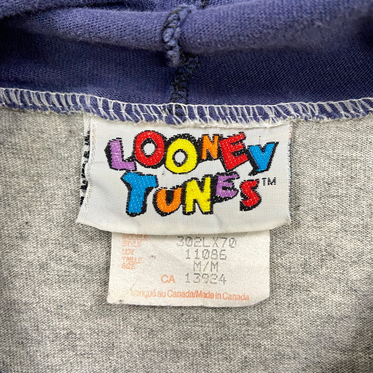 90年代 カナダ製 LOONEY TUNES ルーニー・テューンズ キャラクター Tパーカー メンズL相当 古着 90s バックスバーニー フェイクレイヤード VINTAGE ヴィンテージ 灰色 グレー 紺色 ネイビー【パーカー】/マルチカラー