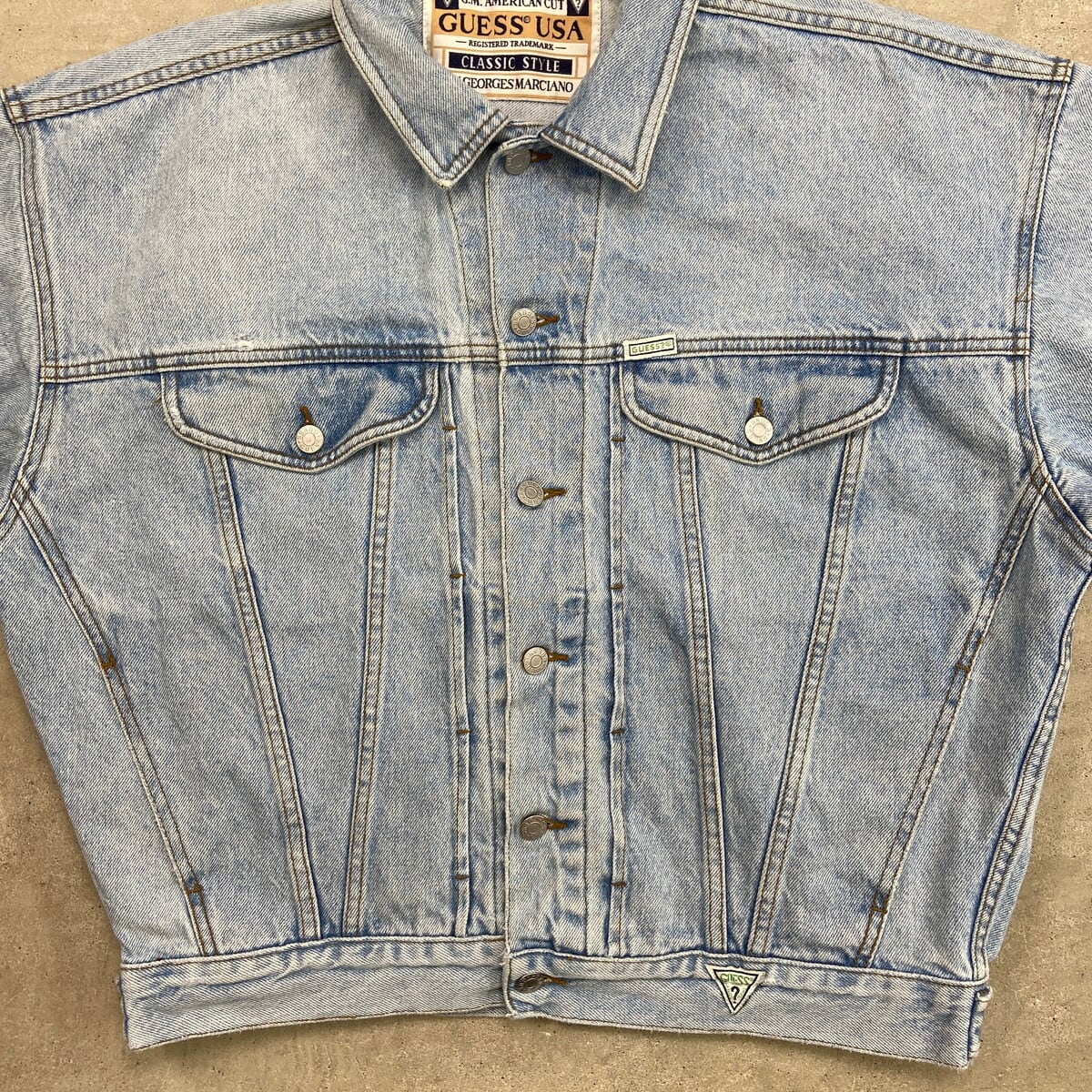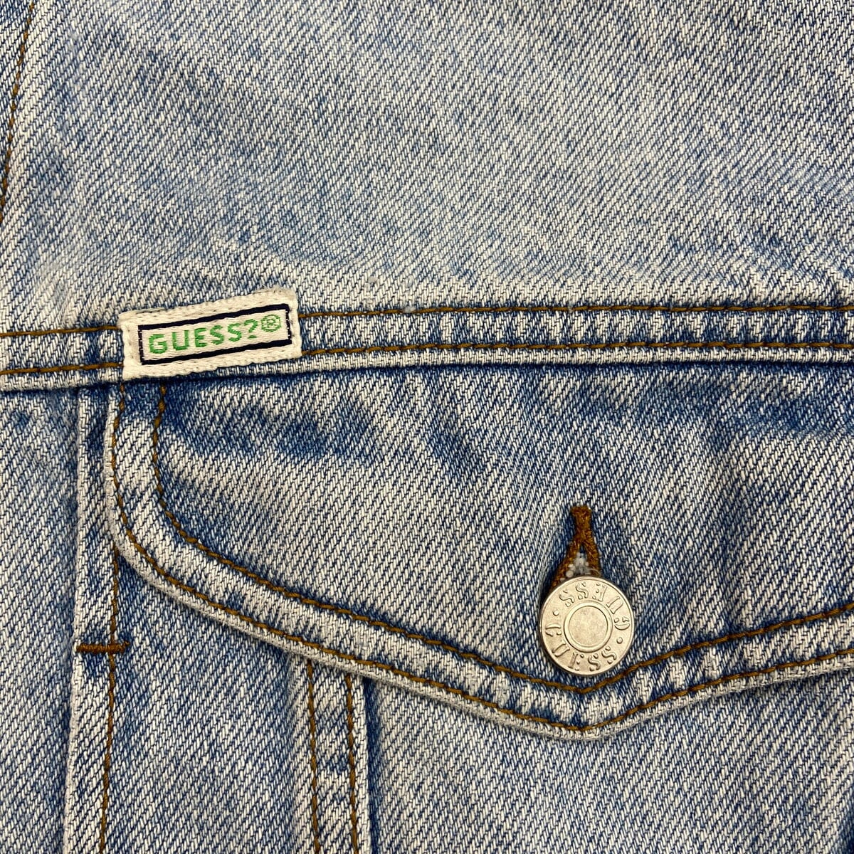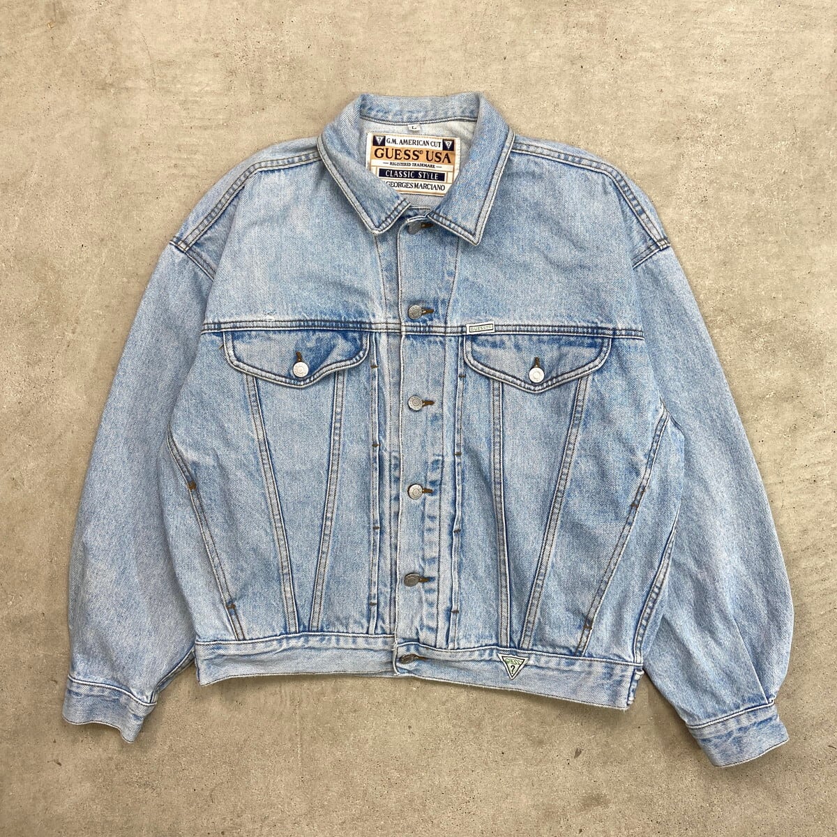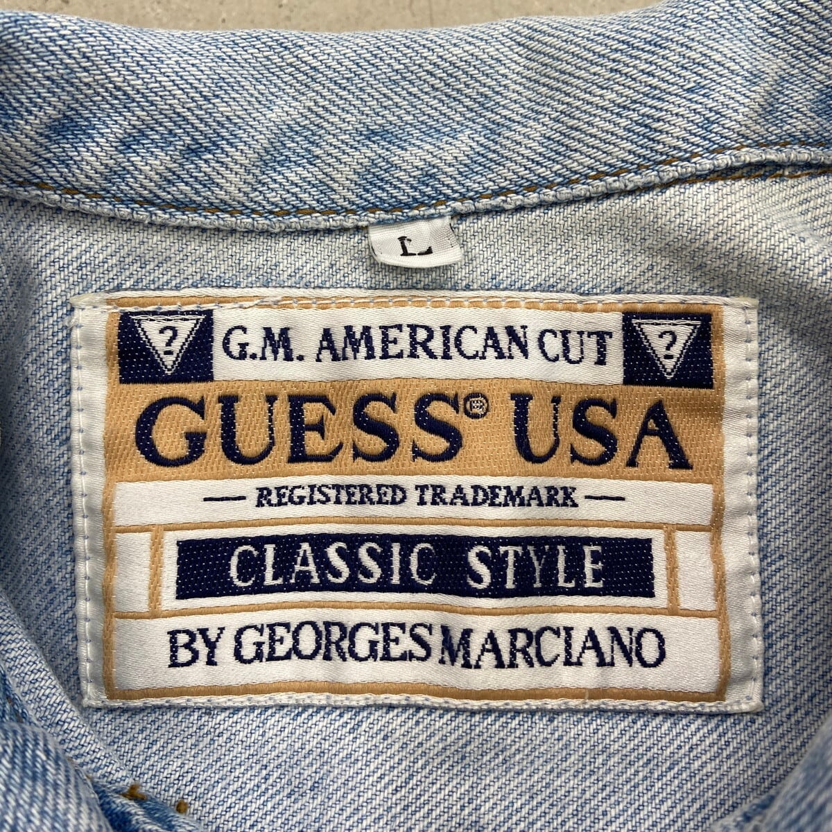 90年代 USA製 GUESS ワンポイントロゴ刺繍 デニムジャケット メンズXL相当 古着 90s VINTAGE ヴィンテージ アメカジ トラッカージャケット アイスブルー【P2603】【デニムジャケット】/ブルー