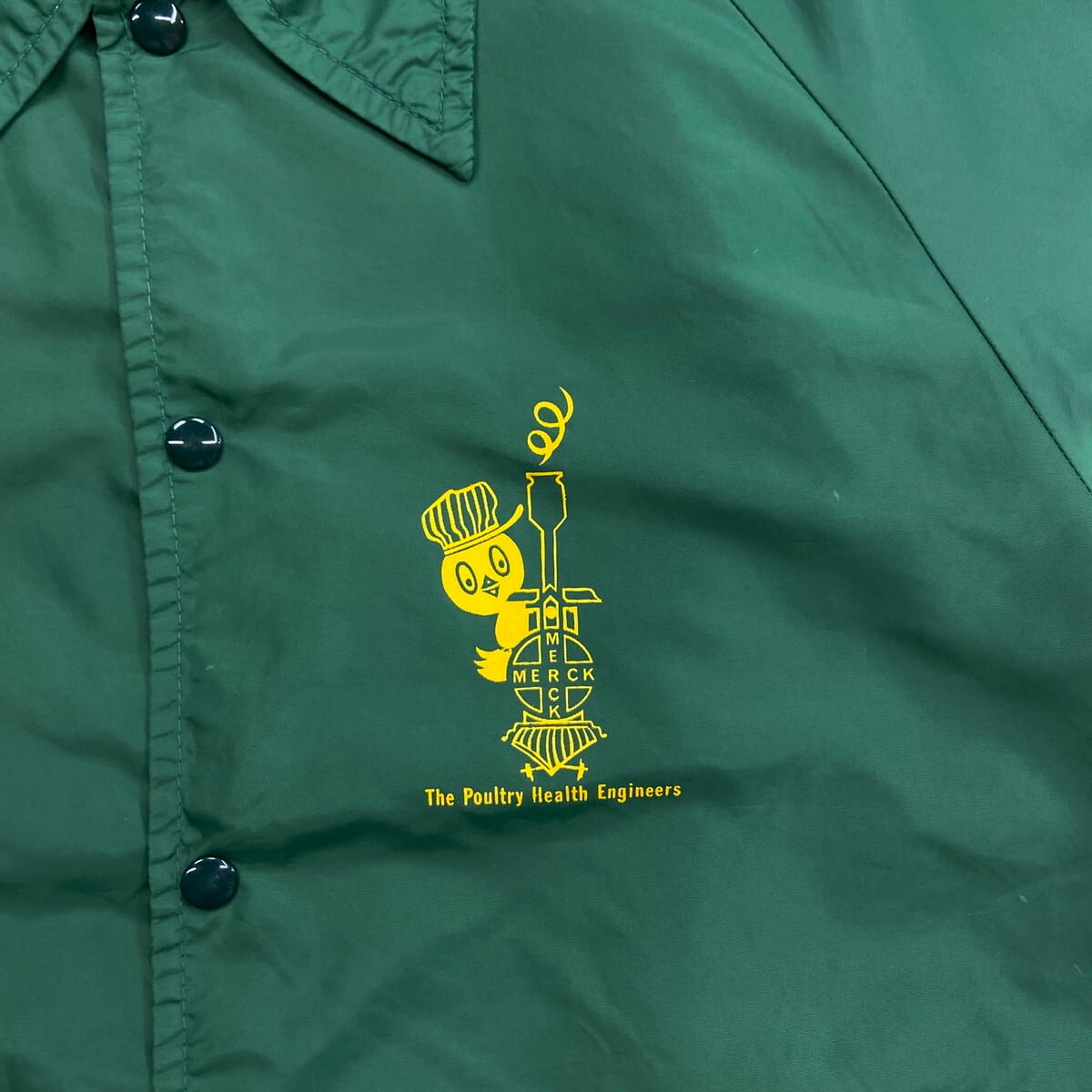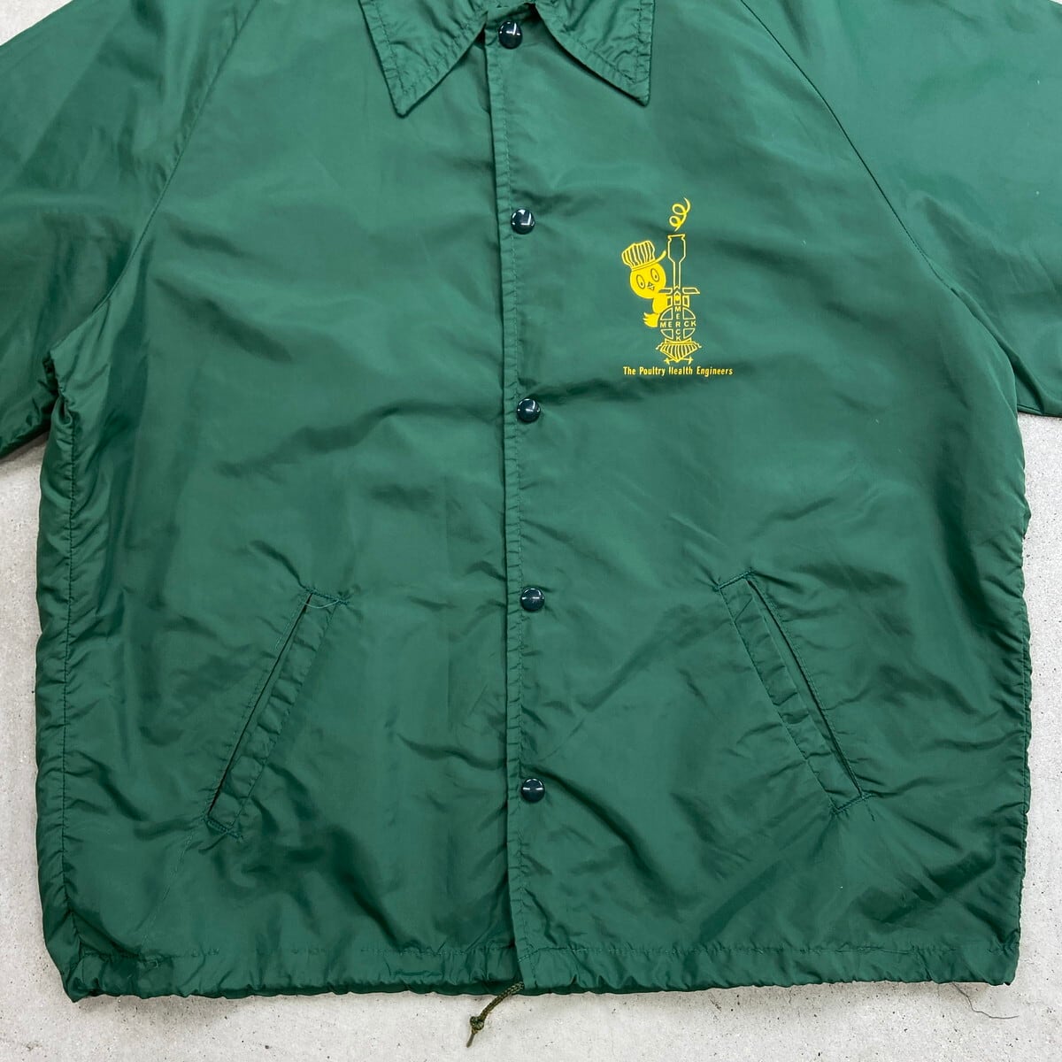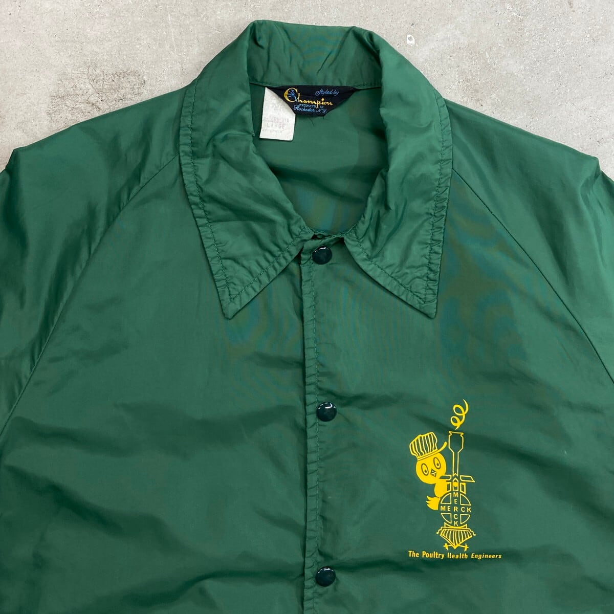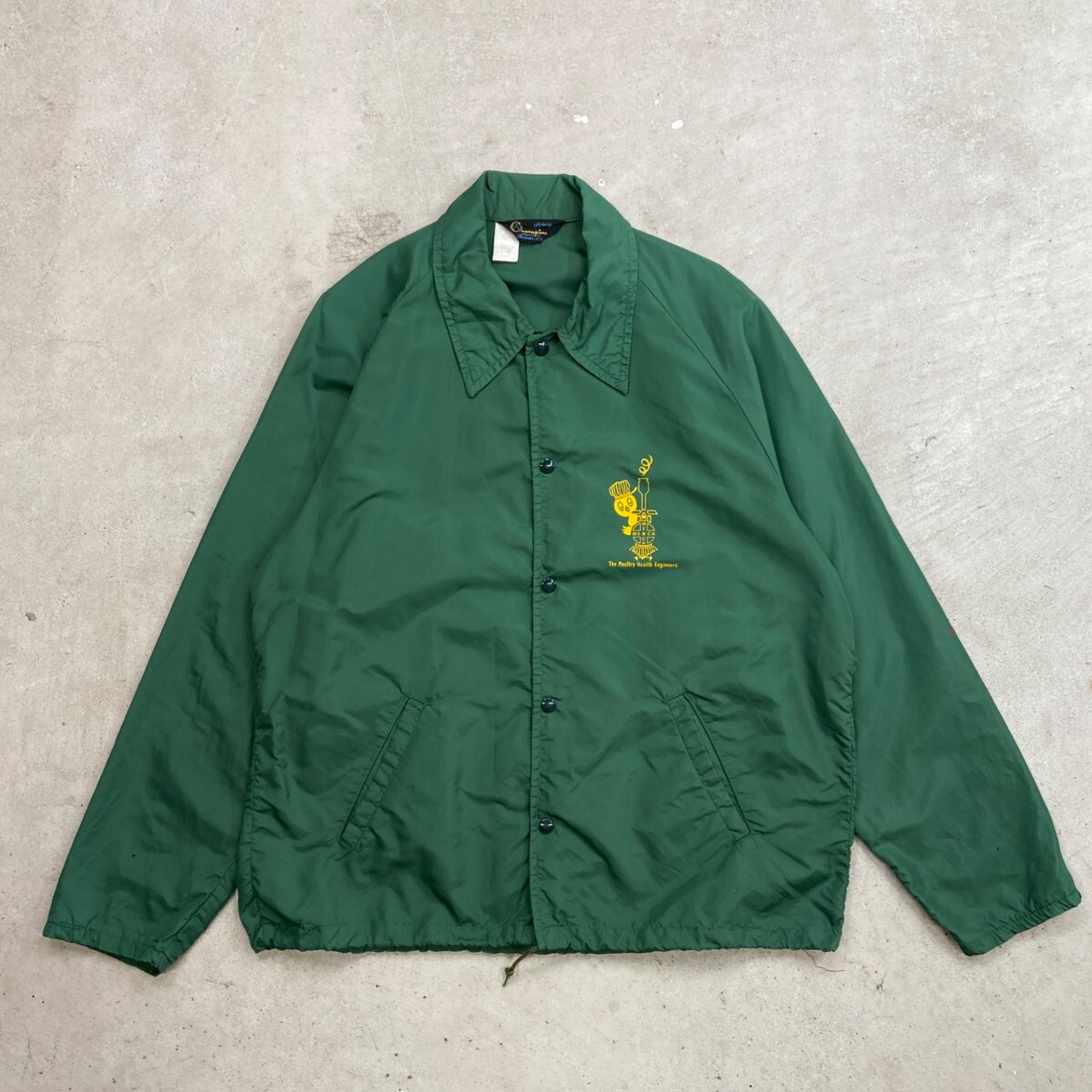 70年代 三角ランタグ Champion チャンピオン ワンポイント企業ロゴプリント ナイロンコーチジャケット メンズXL相当 古着 60s 70s ヴィンテージ VINTAGE ラグランスリーブ ランナーズタグ 裾ドローコード付き ヒヨコ 緑色【ナイロンジャケット】/グリーン