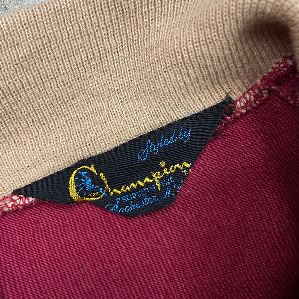 70年代 三角ランタグ Champion チャンピオン カレッジロゴプリント アワードジャケット メンズL相当 古着 70s ヴィンテージ VINTAGE ランナーズタグ スタジャン バーシティジャケット ブルゾン ボルドー バーガンディ【コットンジャケット】/ワインレッド
