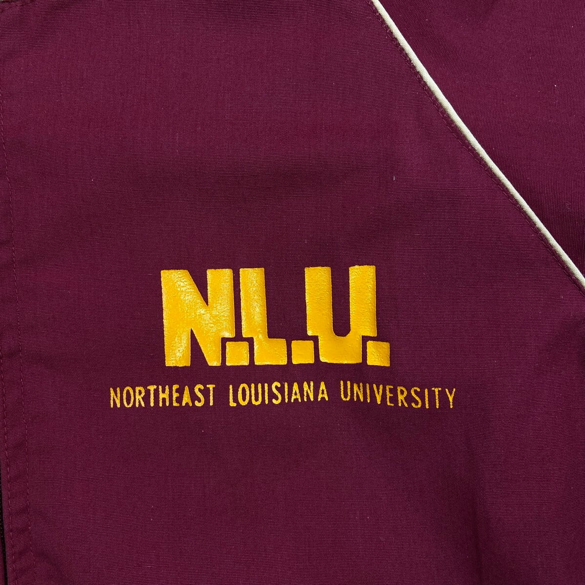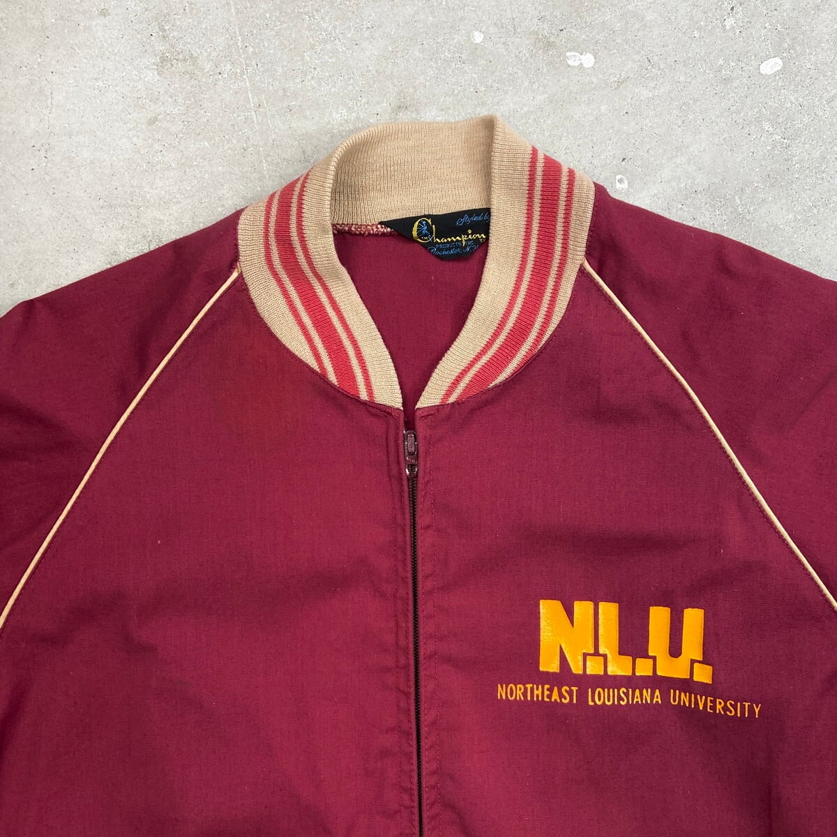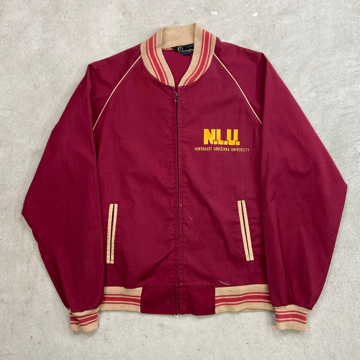 ■70年代 三角ランタグ Champion チャンピオン カレッジロゴプリント アワードジャケット メンズL相当 古着 70s ヴィンテージ VINTAGE ランナーズタグ スタジャン バーシティジャケット ブルゾン ボルドー バーガンディ【コットンジャケット】/ワインレッド