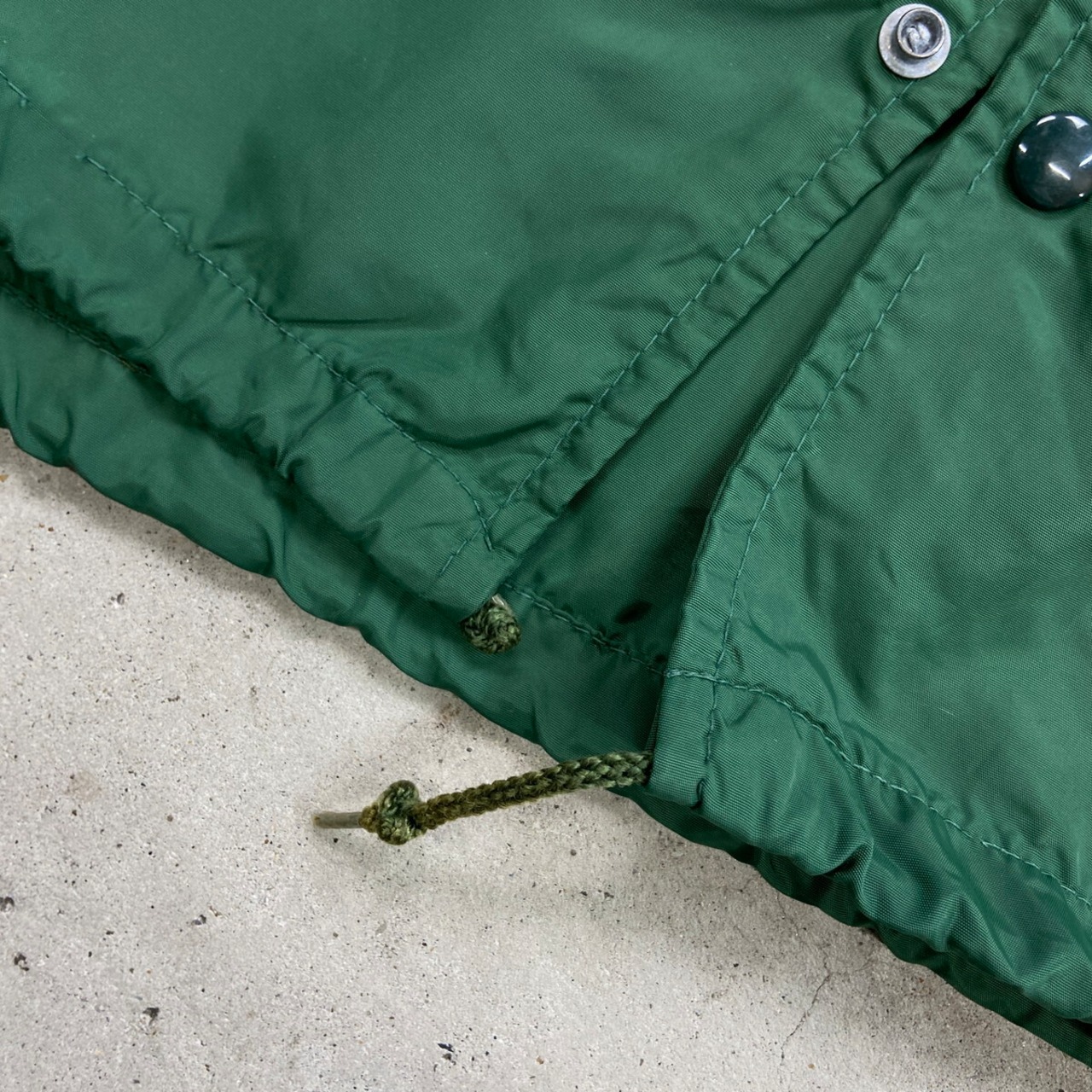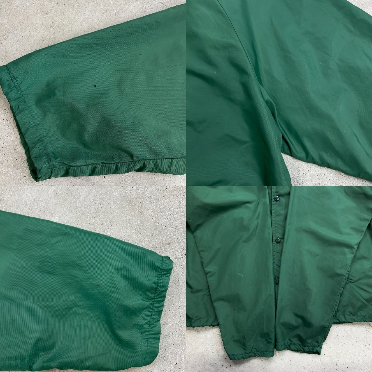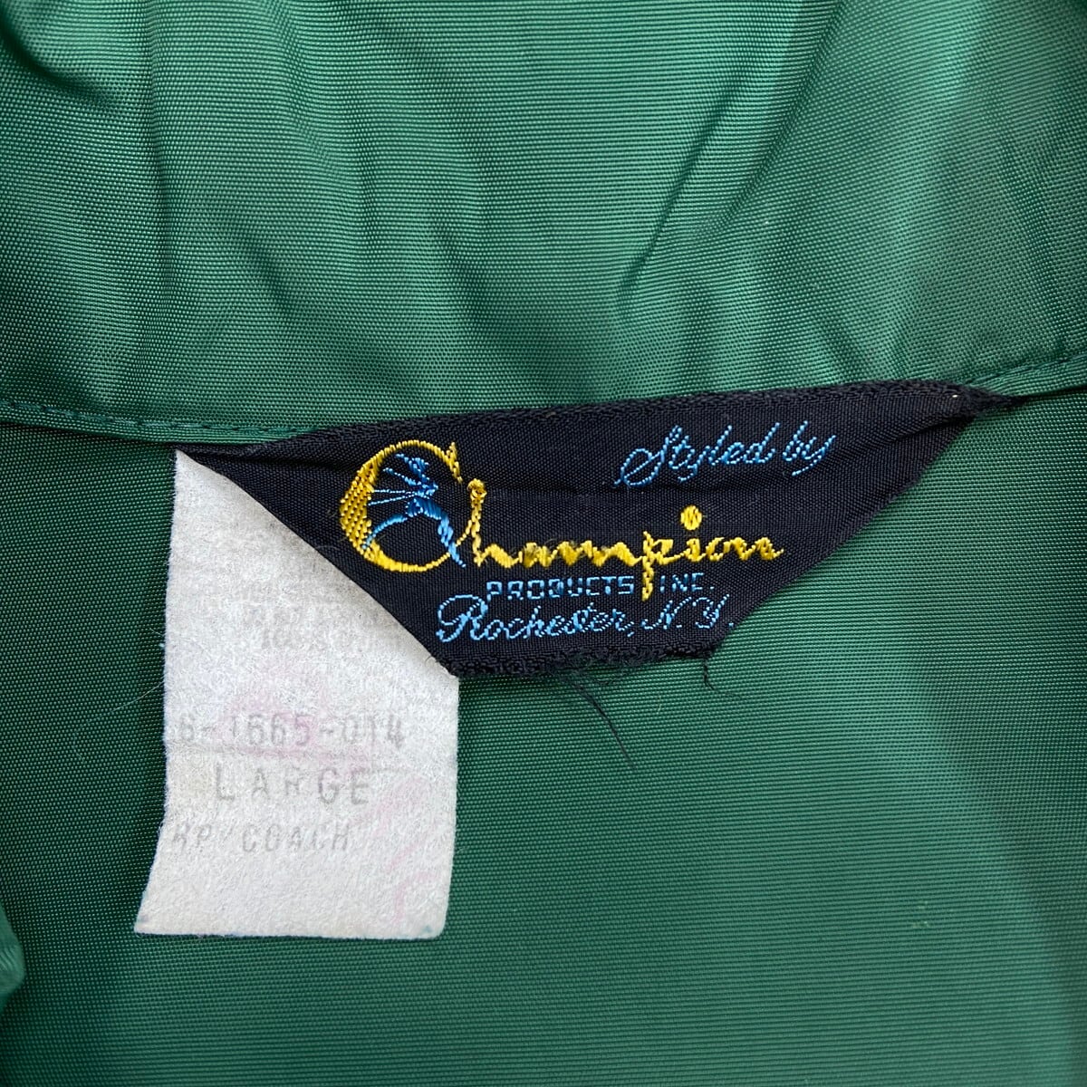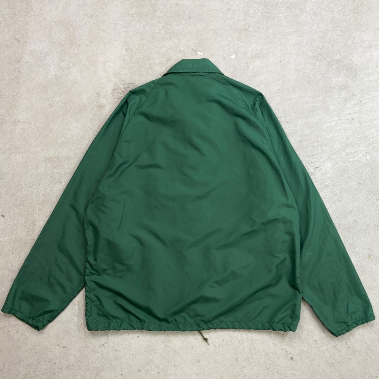 70年代 三角ランタグ Champion チャンピオン ワンポイント企業ロゴプリント ナイロンコーチジャケット メンズXL相当 古着 60s 70s ヴィンテージ VINTAGE ラグランスリーブ ランナーズタグ 裾ドローコード付き ヒヨコ 緑色【ナイロンジャケット】/グリーン