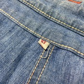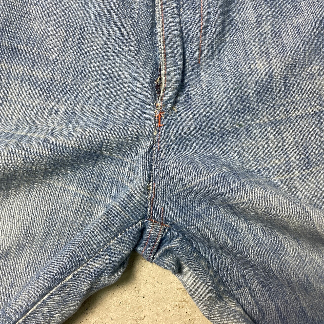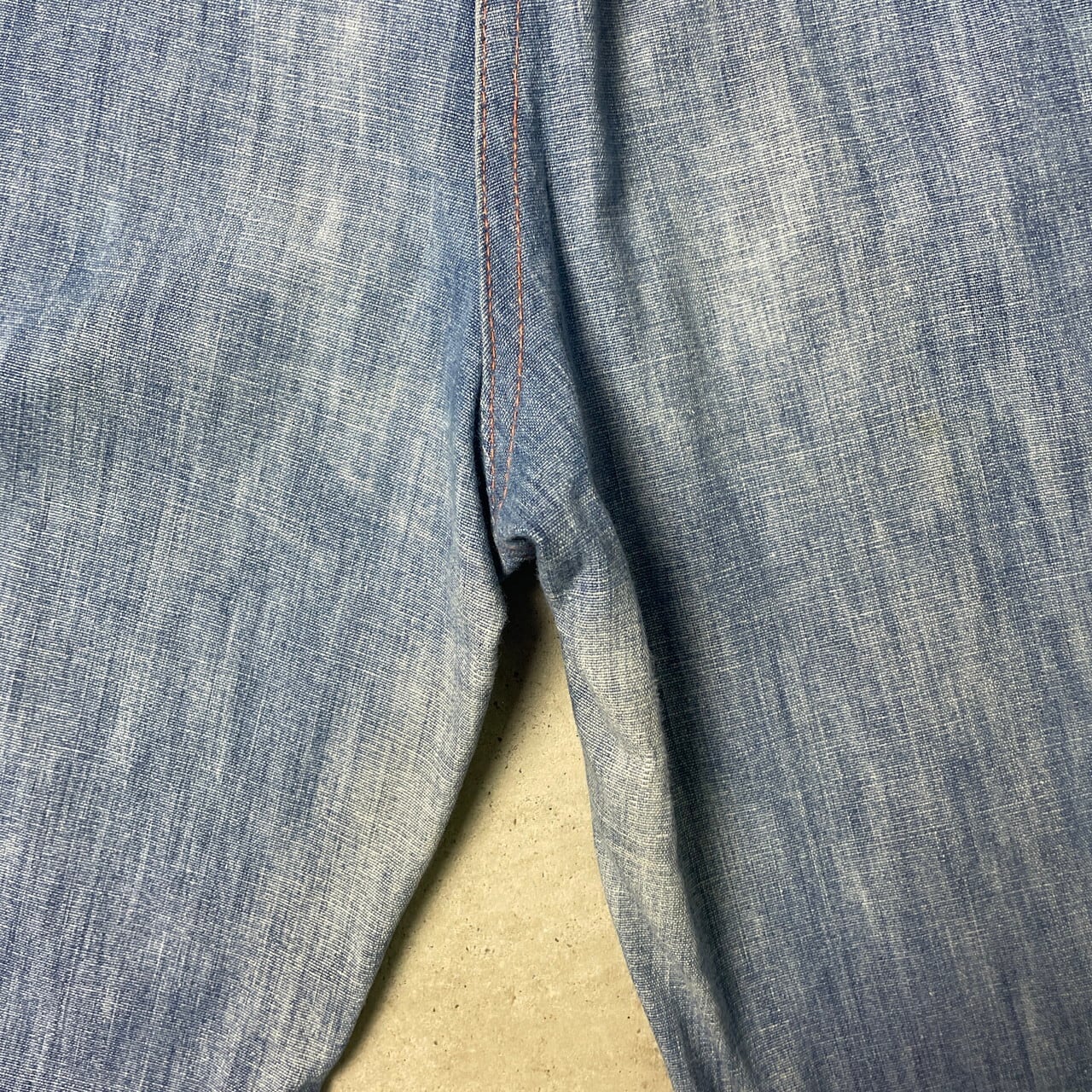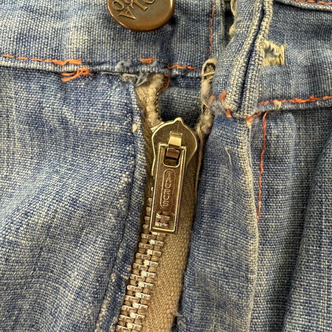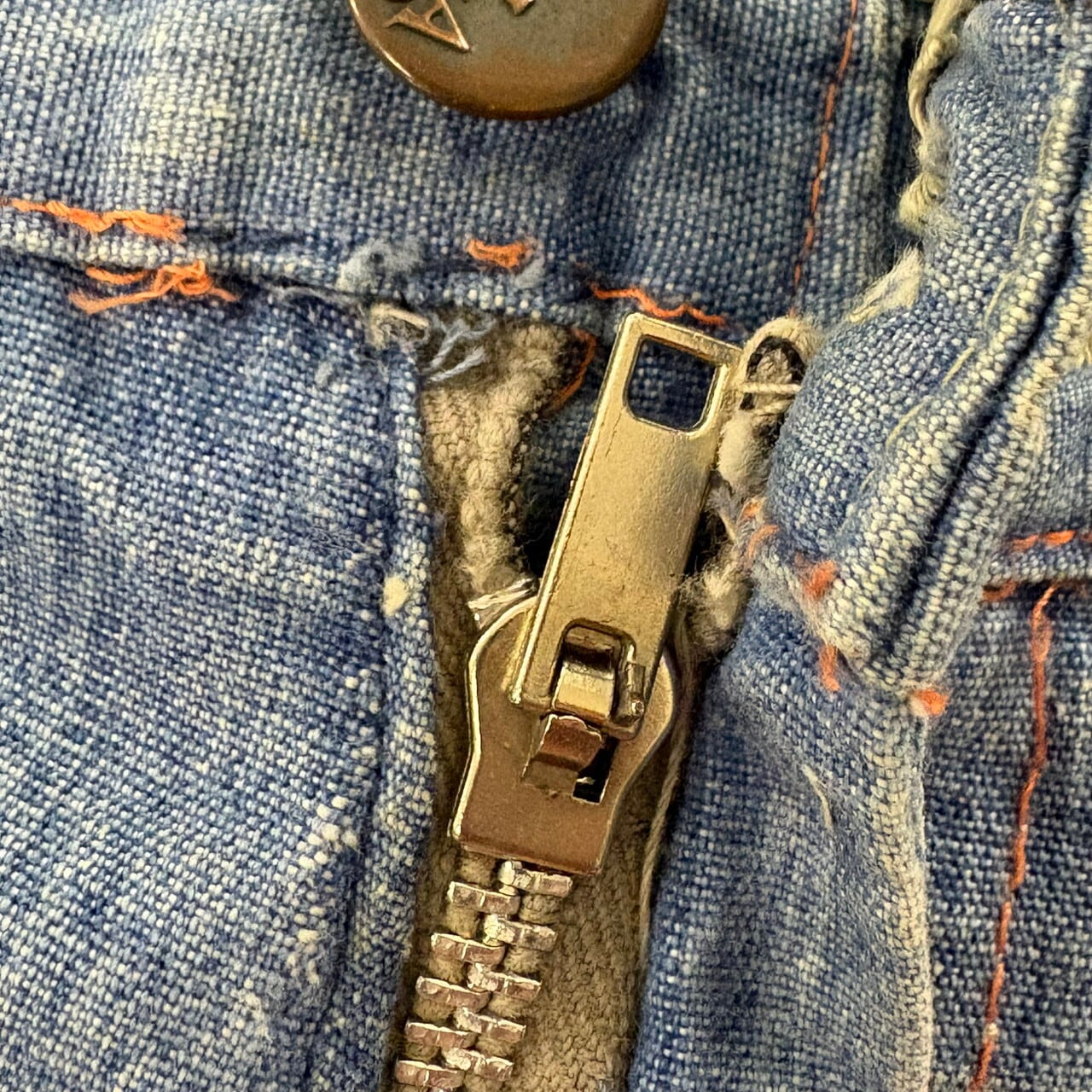 2つのボタン(ダブルボタン)がついたハイウエスト仕様で、腰回りをすっきりと見せるデザインです。ヴィンテージのTAURUSのカムロックジップに交換されています。薄めの生地になり、春~夏にかけて重宝される生地感になります。