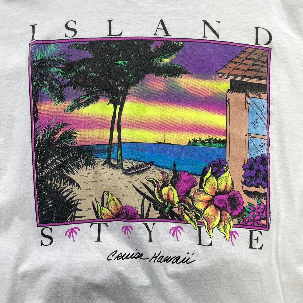 ■90年代 USA製 ISLAND STYLE アートプリントTシャツ メンズ2XL相当 古着 1990 90s VINTAGE ヴィンテージ シングルステッチ スーベニア ビッグサイズ 大きいサイズ 白【Tシャツ】/ホワイト