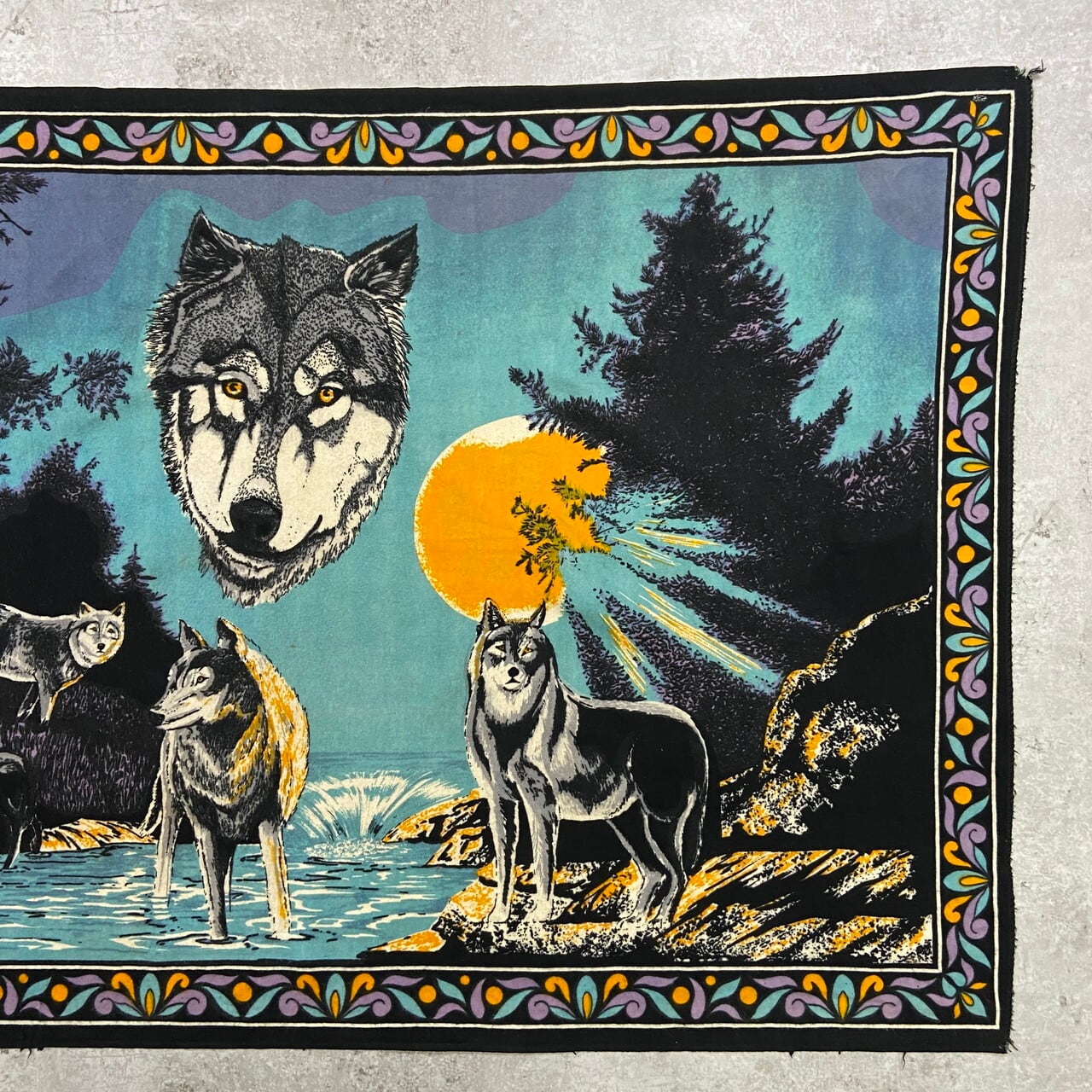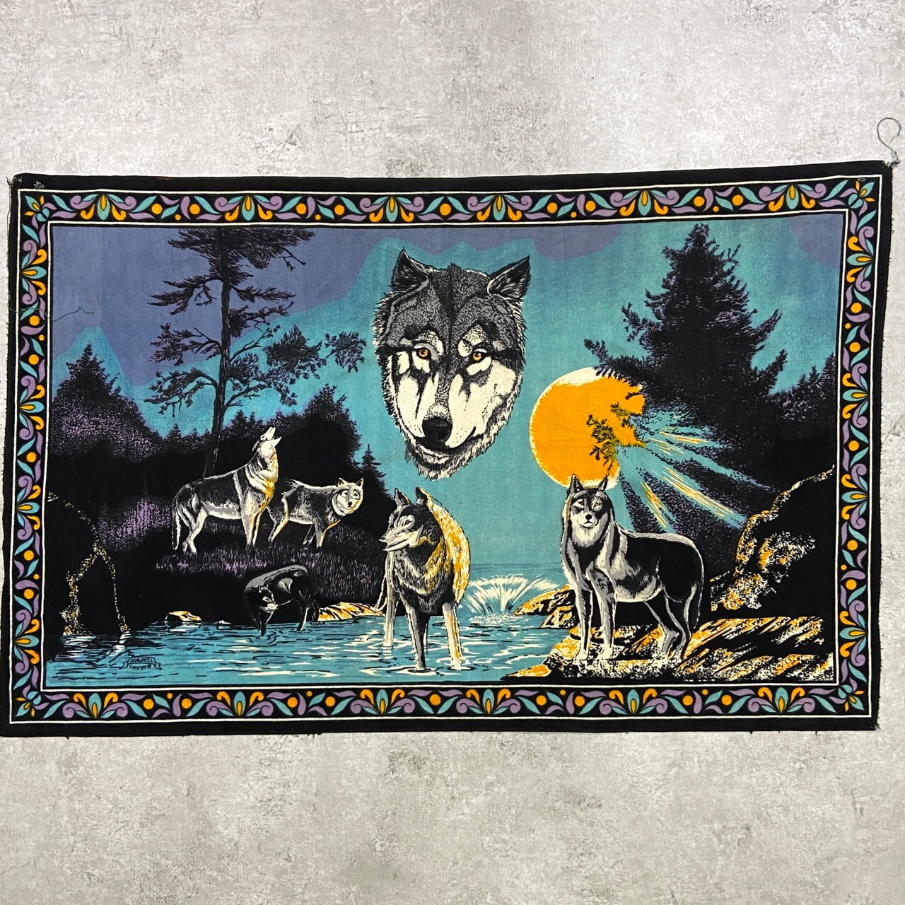 深みのあるティールブルーの背景に、力強いオオカミの群れと夕日が描かれた、圧倒的な存在感を放つ一枚。
