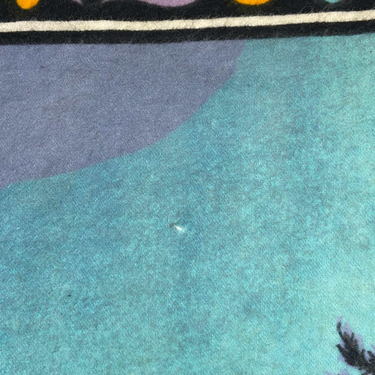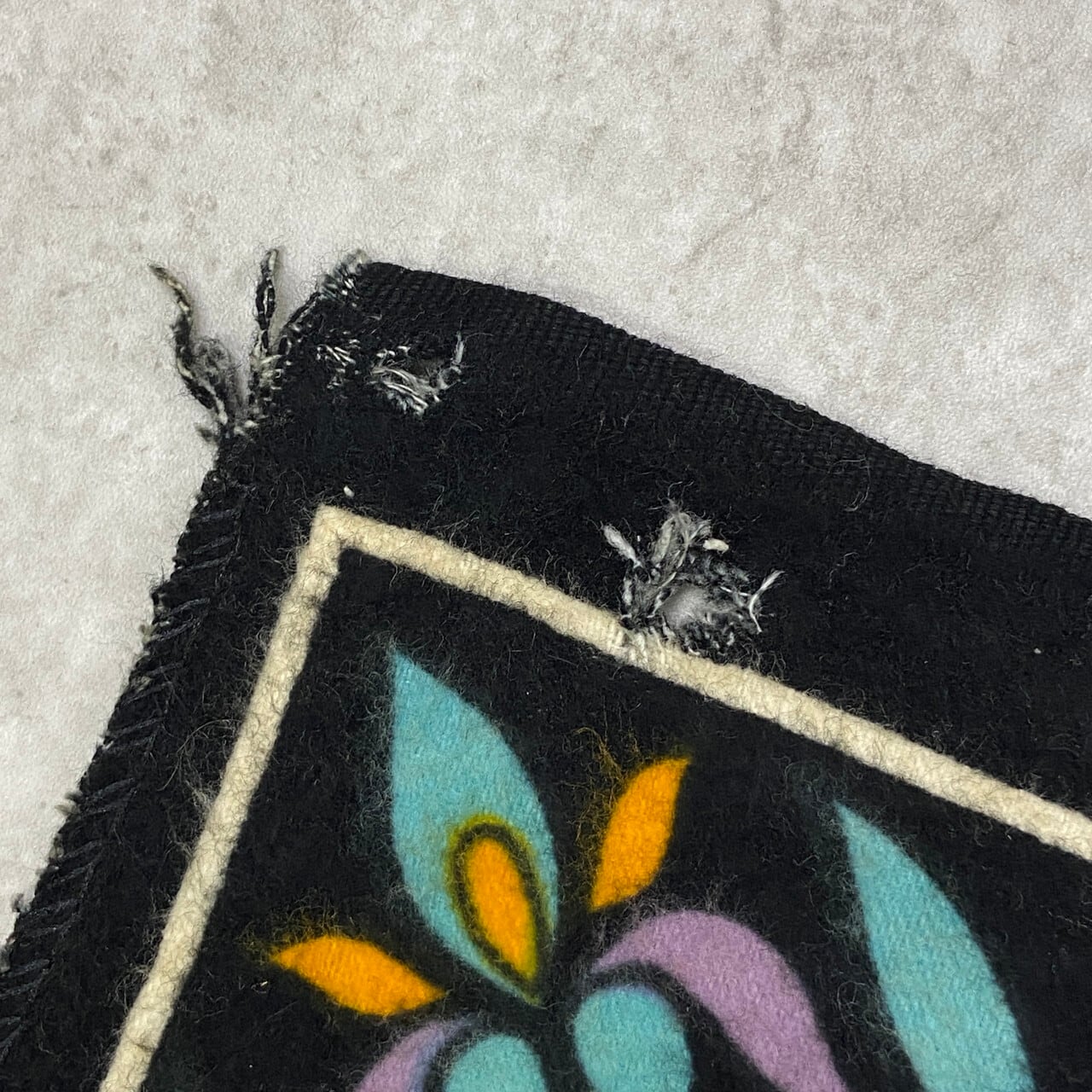 ヴィンテージ特有の使用感はございますが、上部左右にダメージがあります。おそらく前オーナーがタペストリーとして使用していた際のダメージになります。また多少の汚れ箇所、一か所生地ホツレがございます。画像でお確かめください。