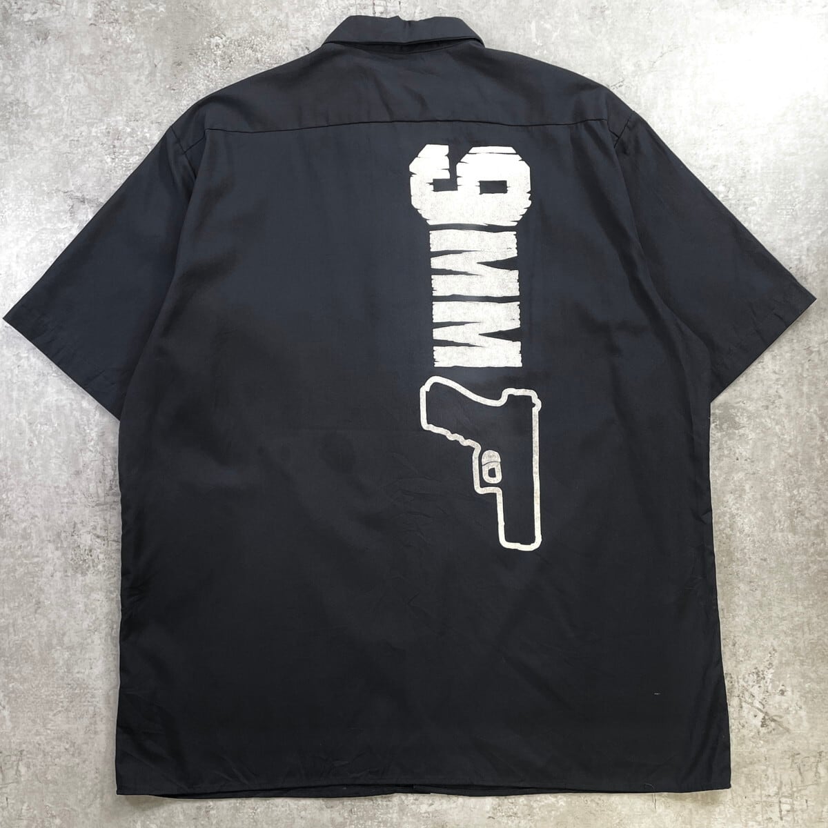 ■Dickies ディッキーズ 9MM ガン プリント ワークシャツ 半袖シャツ メンズ2XL 古着 バックプリント 銃 ハンドガン ダブルポケット ビッグサイズ 大きいサイズ 黒色【半袖シャツ】/ブラック