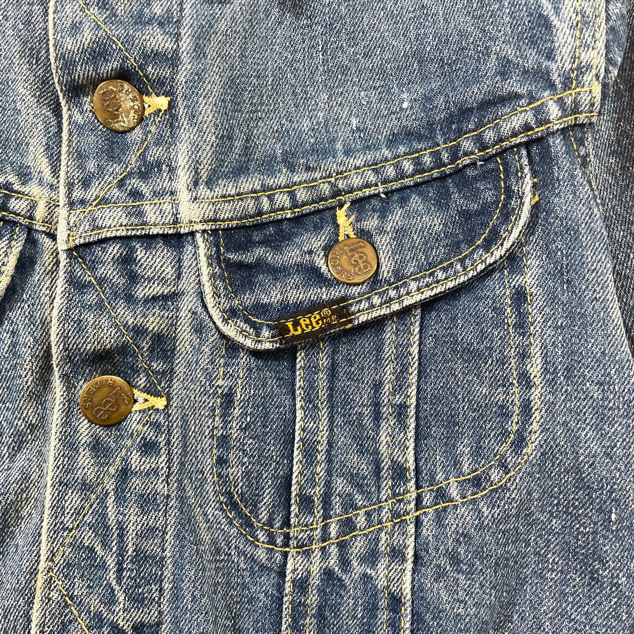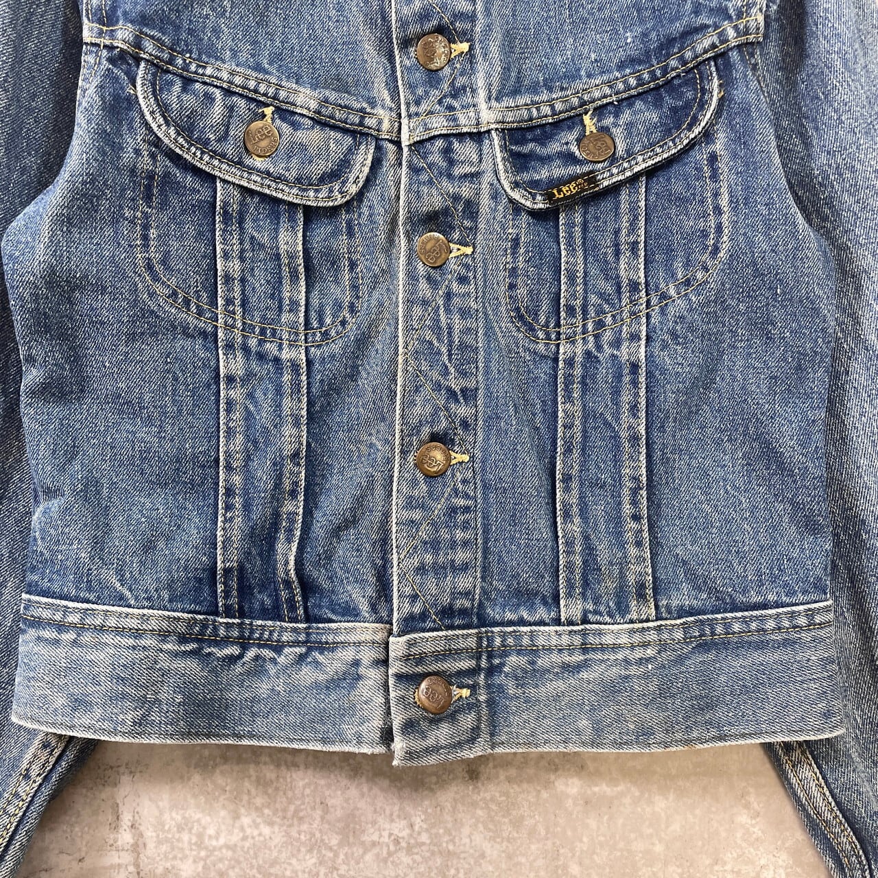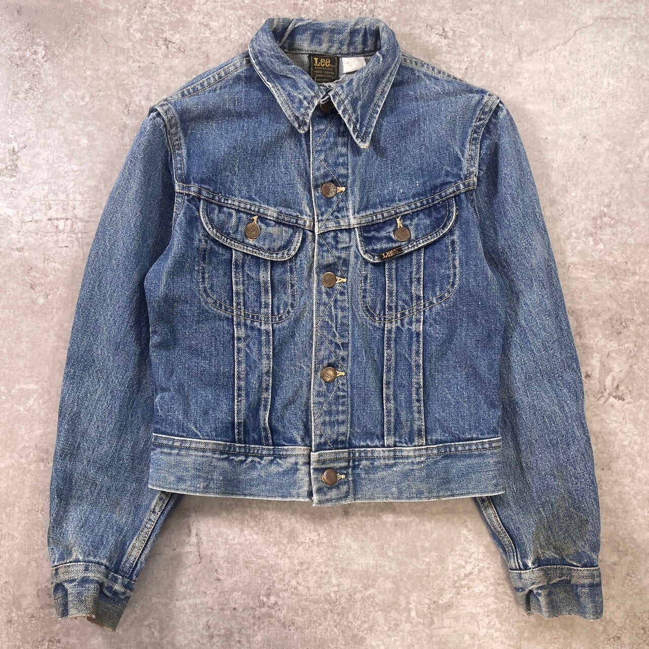 1970年代のアメリカで製造された、Lee(リー)の名作デニムジャケット「101J」のキッズモデルです。後年のモデルとは一線を画す、黒地に黄色の刺繍が施された「黒タグ」単体の織りネーム仕様。下部の「MADE IN U.S.A.」が四角い枠で囲まれた、この年代特有の貴重なディテール